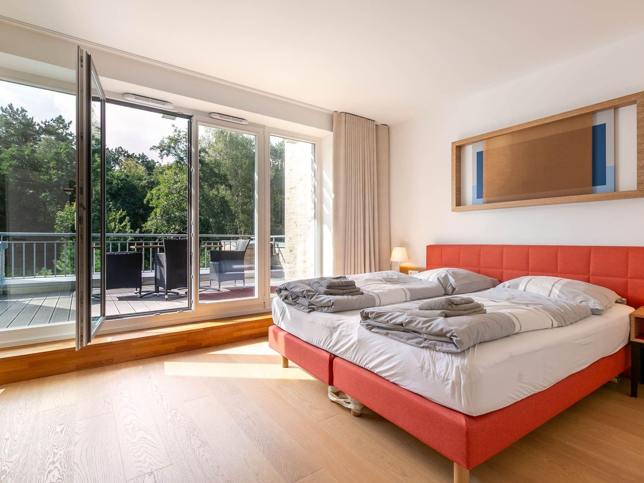 1. Schlafzimmer mit Doppelbett (2x 90x200 cm), SMART-TV, Schreibtisch, Einbaukleiderschrank und Dachterrasse.