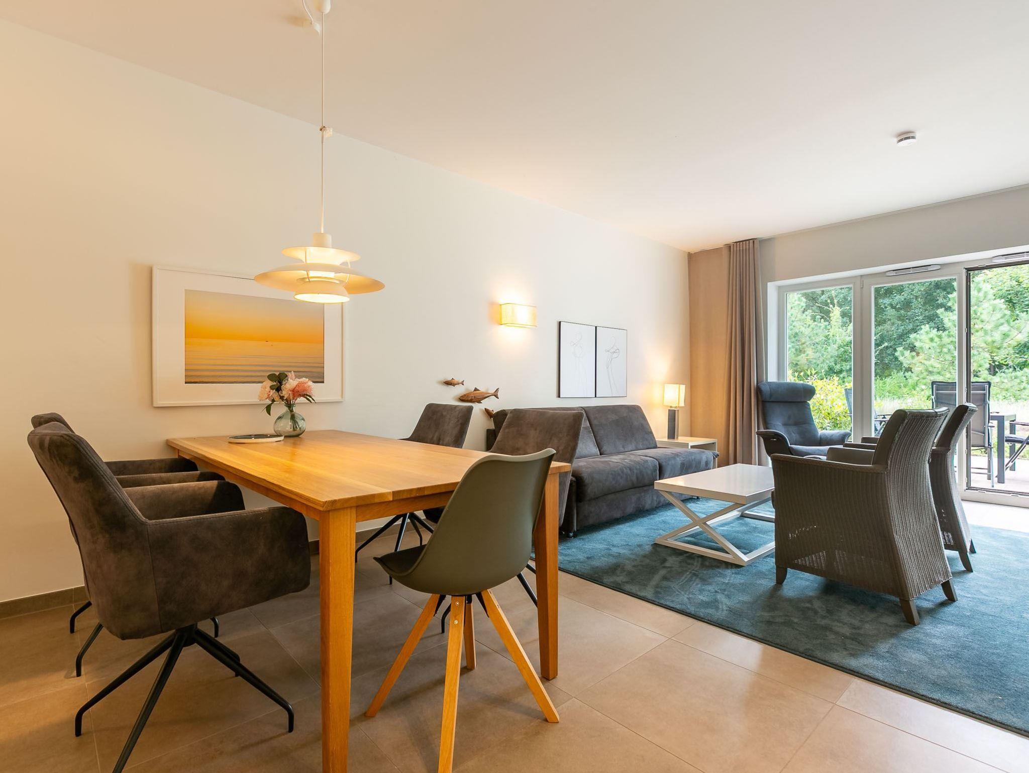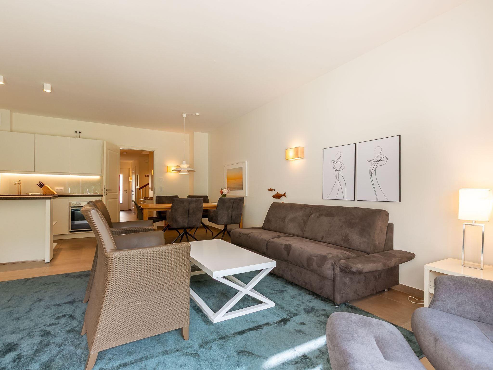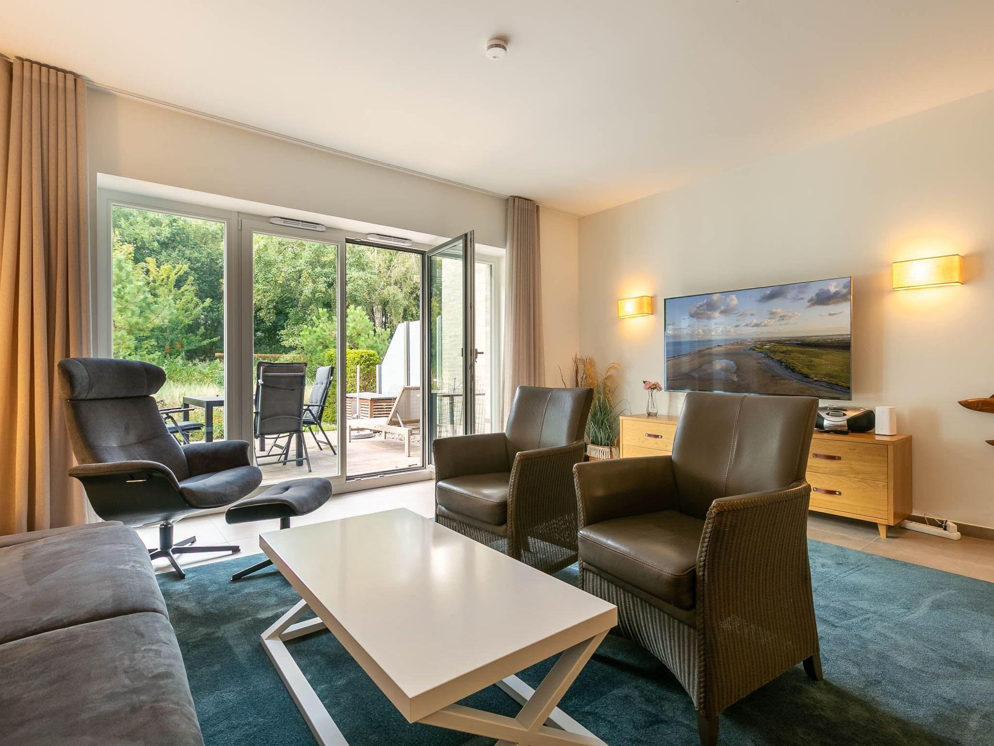 Wohnzimmer mit hochwertigem Schlafsofa (160x200 cm, mit Matratze), Sesseln, großem SMART-TV und Esstisch. Offene Küche mit Backofen, Mikrowelle, Geschirrspüler, Kühl-Gefrierkombination, Nespresso-Maschine und Wasch-Trockner. Zugang zur möblierten Südterrasse mit zwei Sonnenliegen und Garten.
