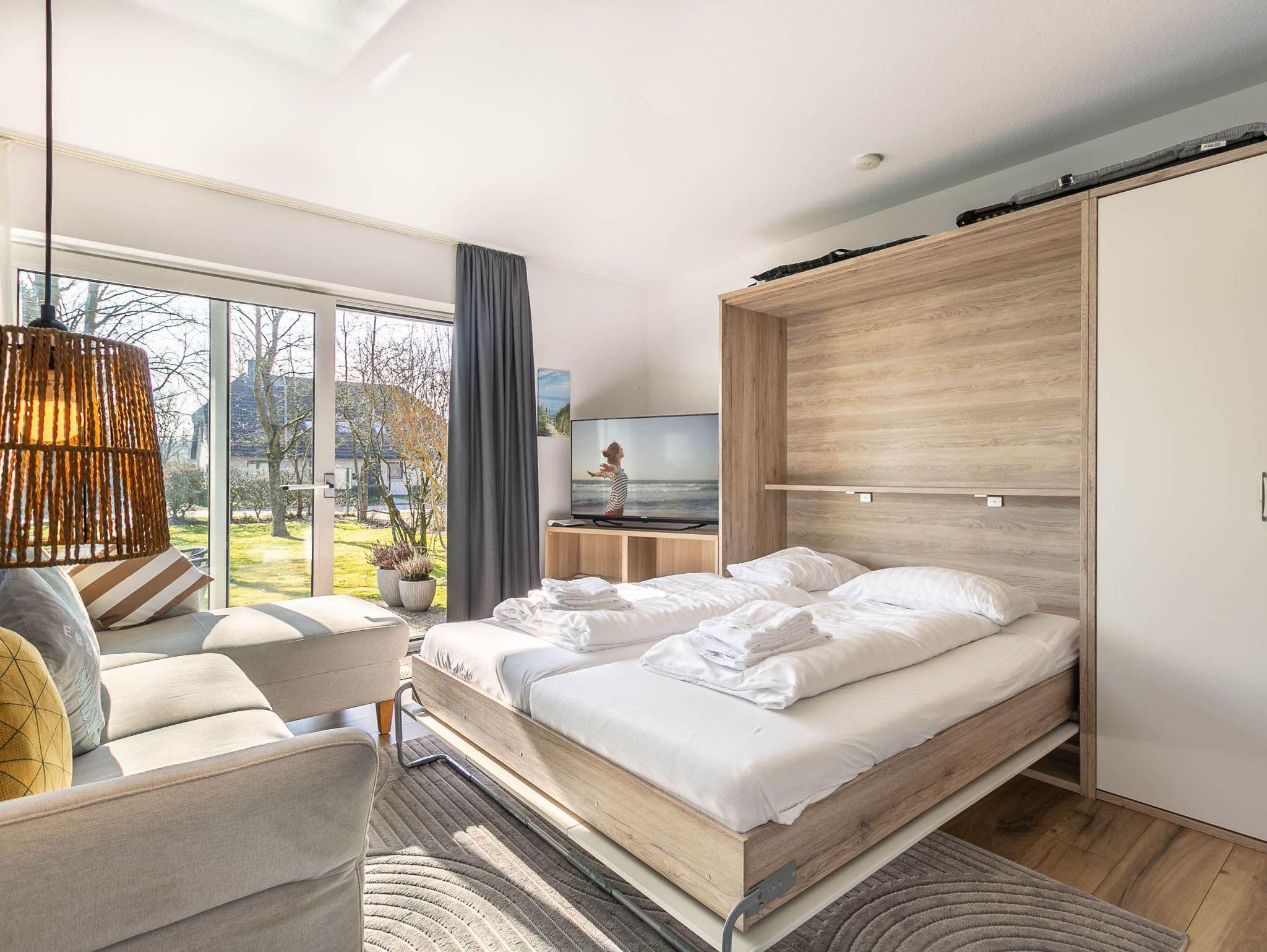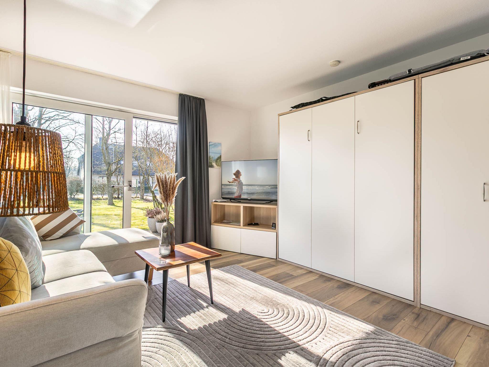 Wohnzimmer mit Schrank-Doppelbett (2x 80x200cm), großem Sofa mit Ottomane, SMART-TV (Kabel), Radio und Esstisch für 4 Personen. Direkter Zugang zur möblierten Gartenterrasse nach Süden. Offene Küche mit Backofen, Geschirrspüler und Kühlschrank mit Gefrierfach.