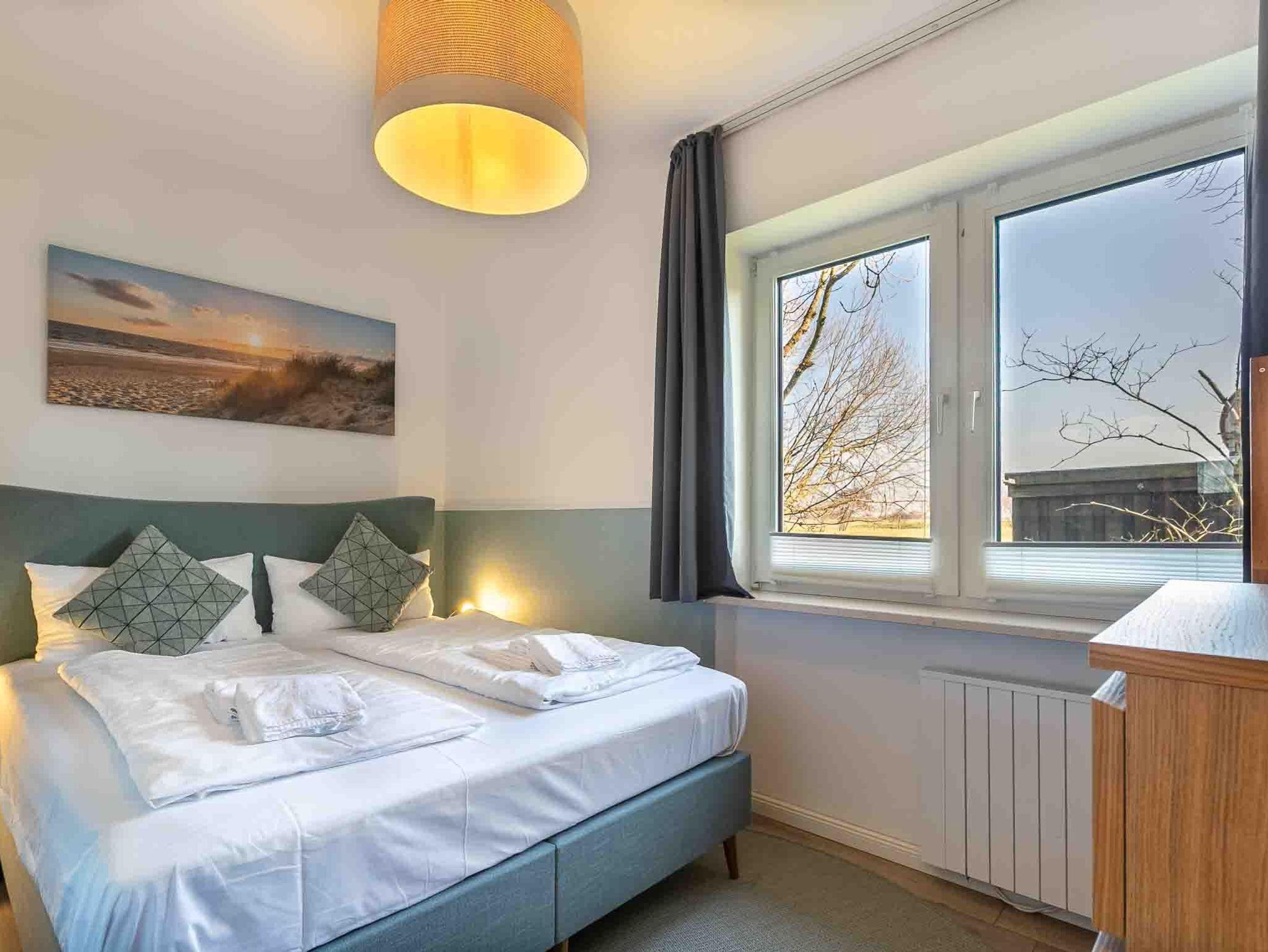 Schlafzimmer mit Doppelbett (160x200cm, Boxspring) und Kommode.