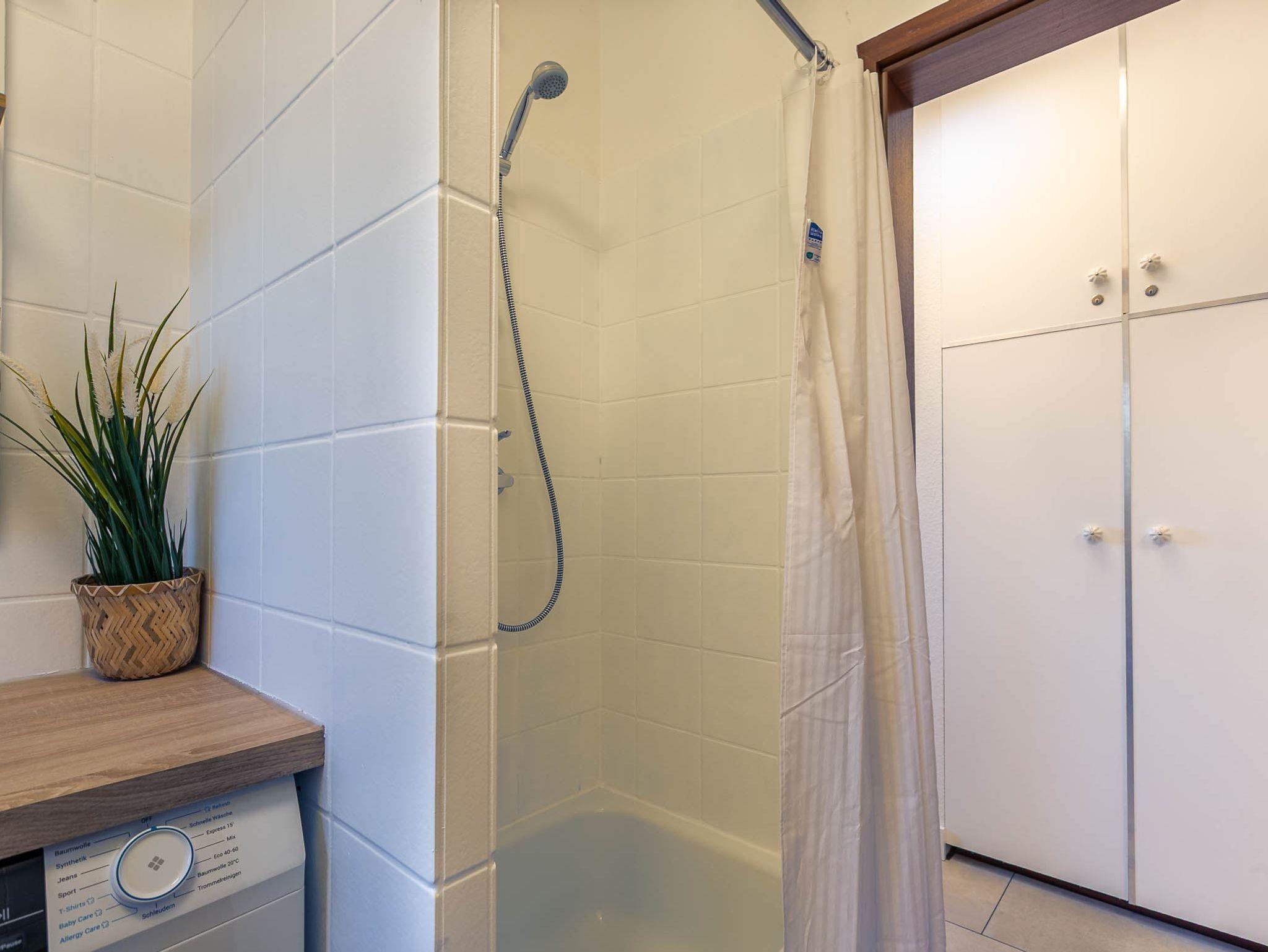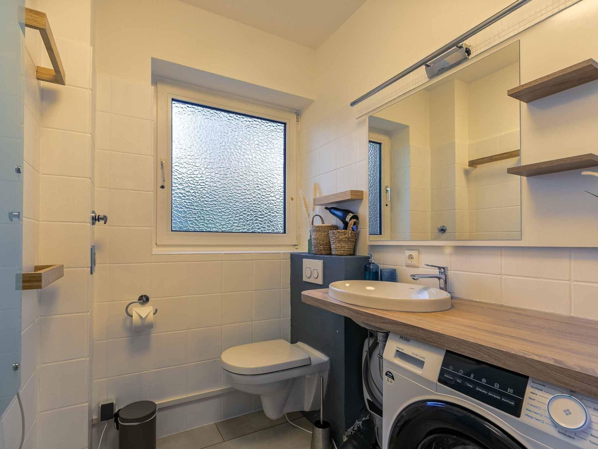 Badezimmer (Duschbad) mit Dusche (hoher Eintritt: ca. 45cm), WC, Waschmaschine, Föhn und Tageslicht.