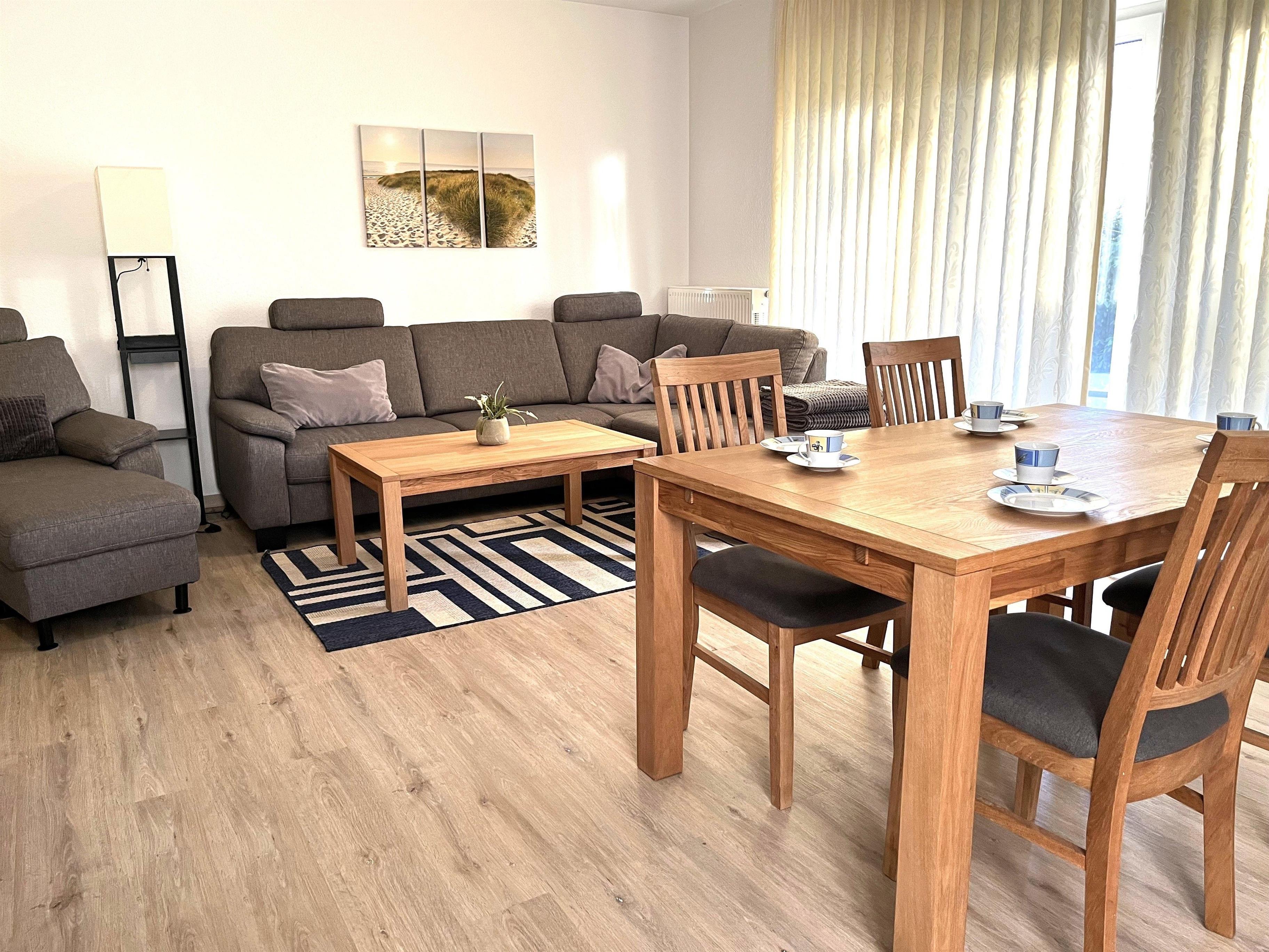 Große, helle und gemütliche 3-Zimmer-Wohnung im EG, 1 Wohnraum mit offener Küche und Essbereich, große Terrasse mit Gartenmöbeln und Strandkorb, 2 Schlafzimmer, großes Duschbad und Gäste-WC und Abstellraum, Insektenschutz