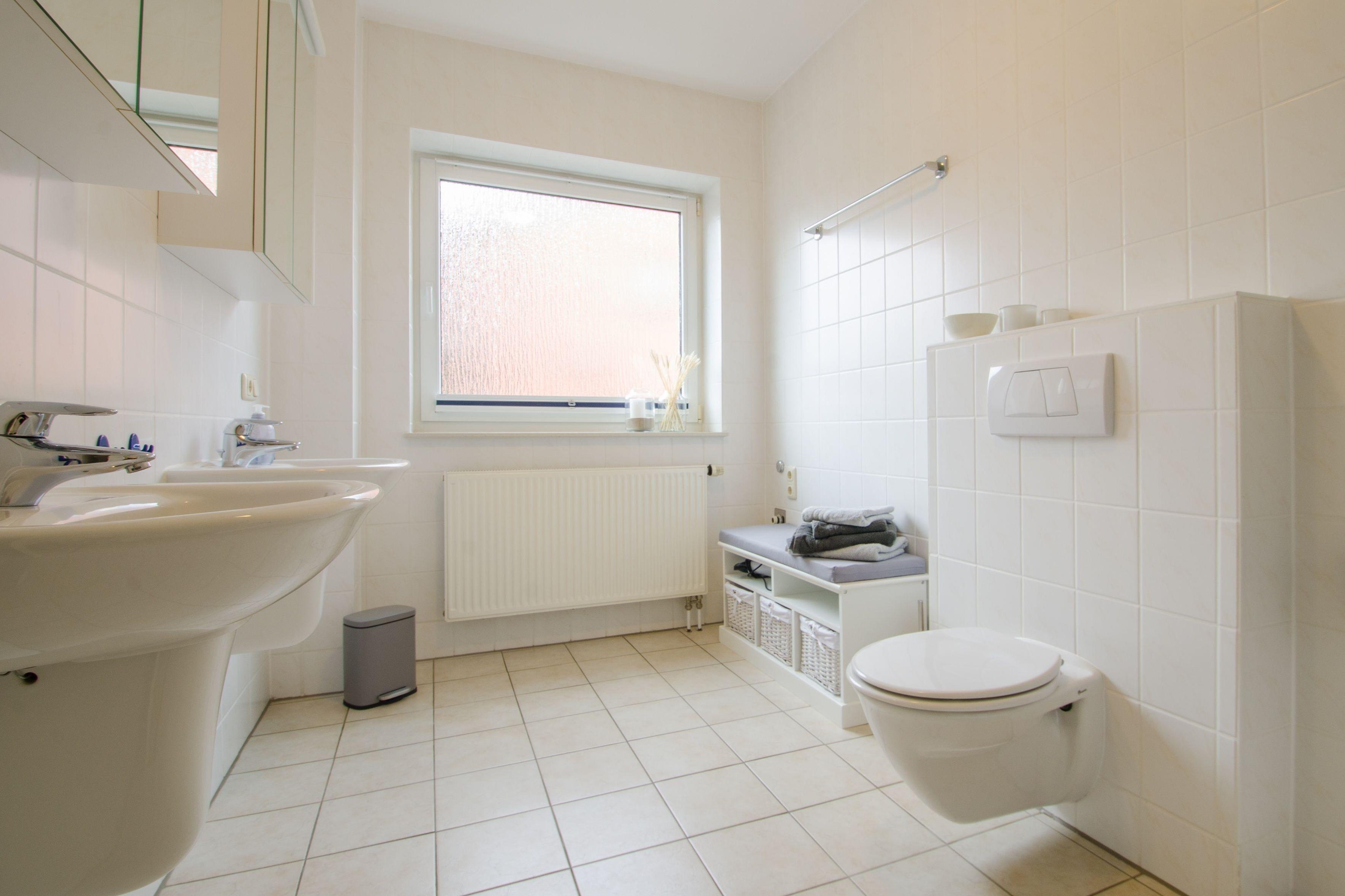 Ein großer heller Wohnraum mit SAT-TV, Radio, Terrasse mit Gartenmöbeln und Strandkorb, offene vollausgestattete Küche mit Kühlschrank, Elektroherd mit Backofen, Mikrowelle, Geschirrspüler, Kaffeemaschine, Toaster und Wasserkocher. Zwei Schlafzimmer mit je einem Doppelbett, Wäschepakete können hinzugebucht werden, immer enthalten sind eine Duschmatte sowie Geschirrtücher und Spültuch. Großes Duschbad mit zwei Waschtischen und Föhn, extra Gäste-WC und Abstellraum, Insektenschutz