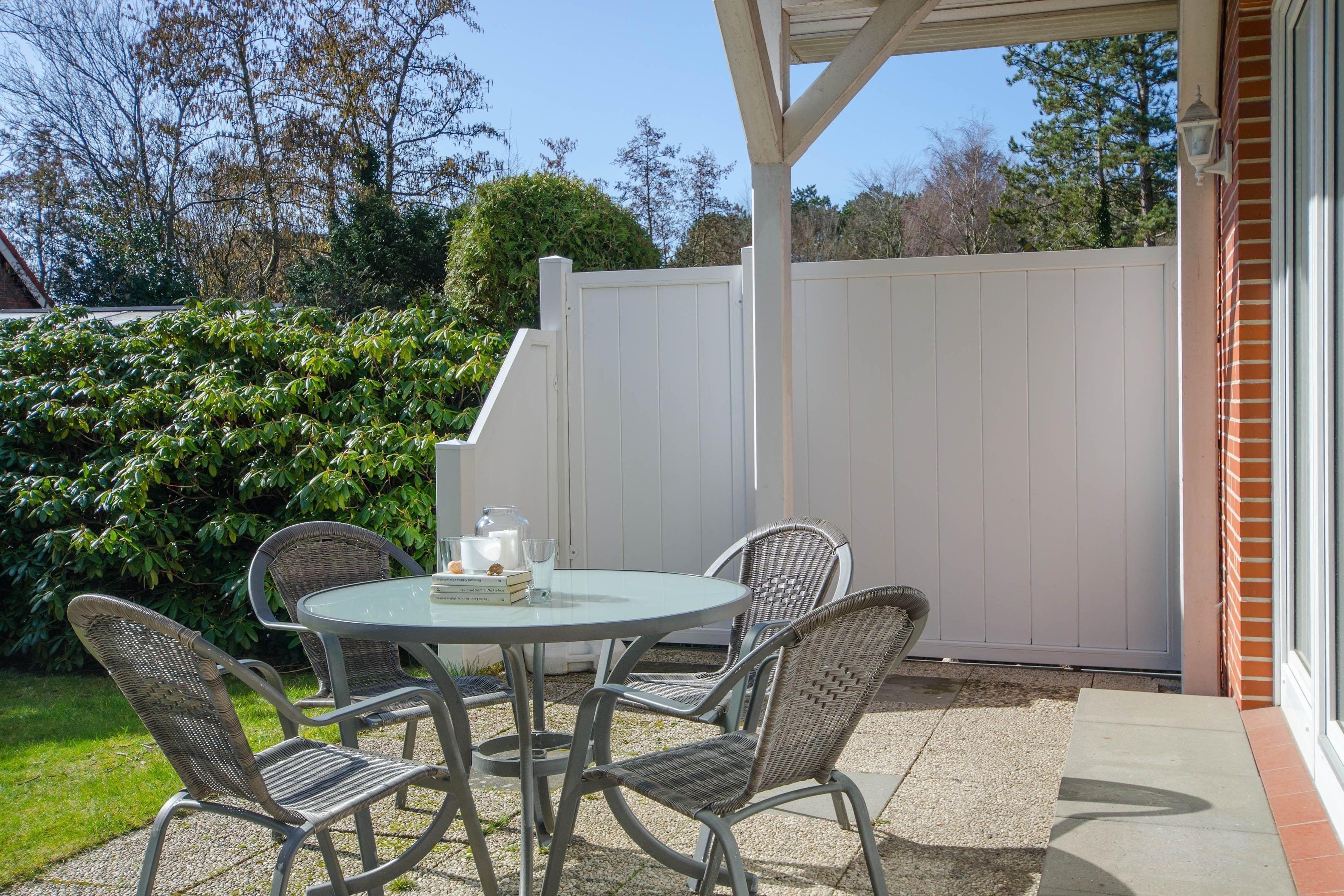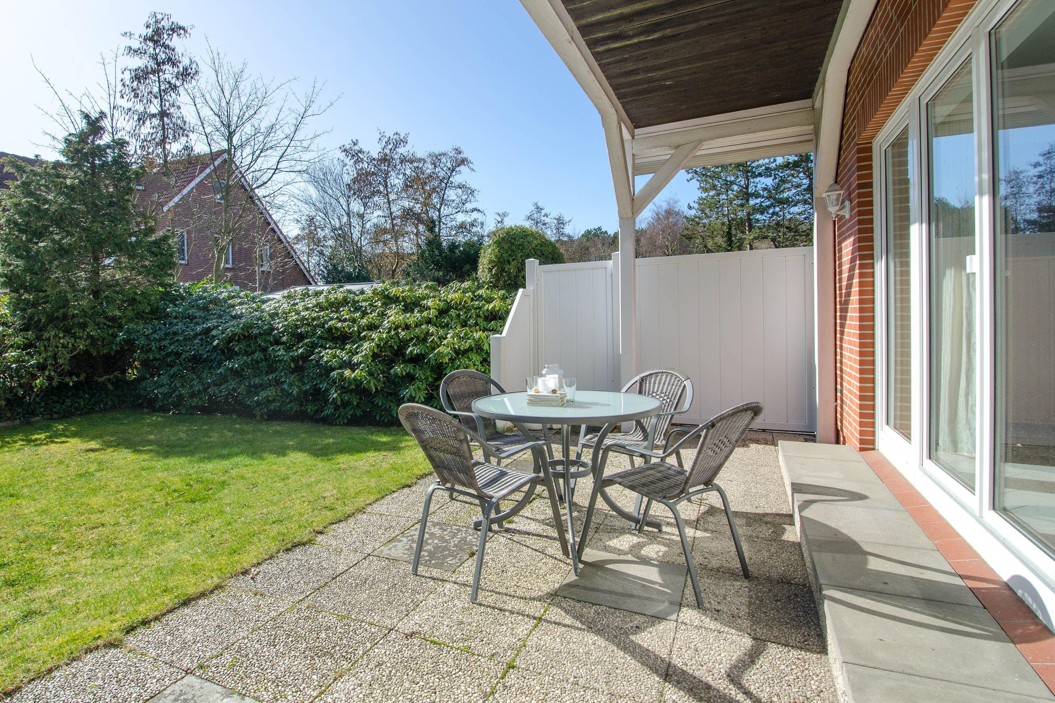 Große Terrasse mit Gartenmöbeln und Strandkorb, Garten mit Liegewiese und Grill, Parkplatz am Haus