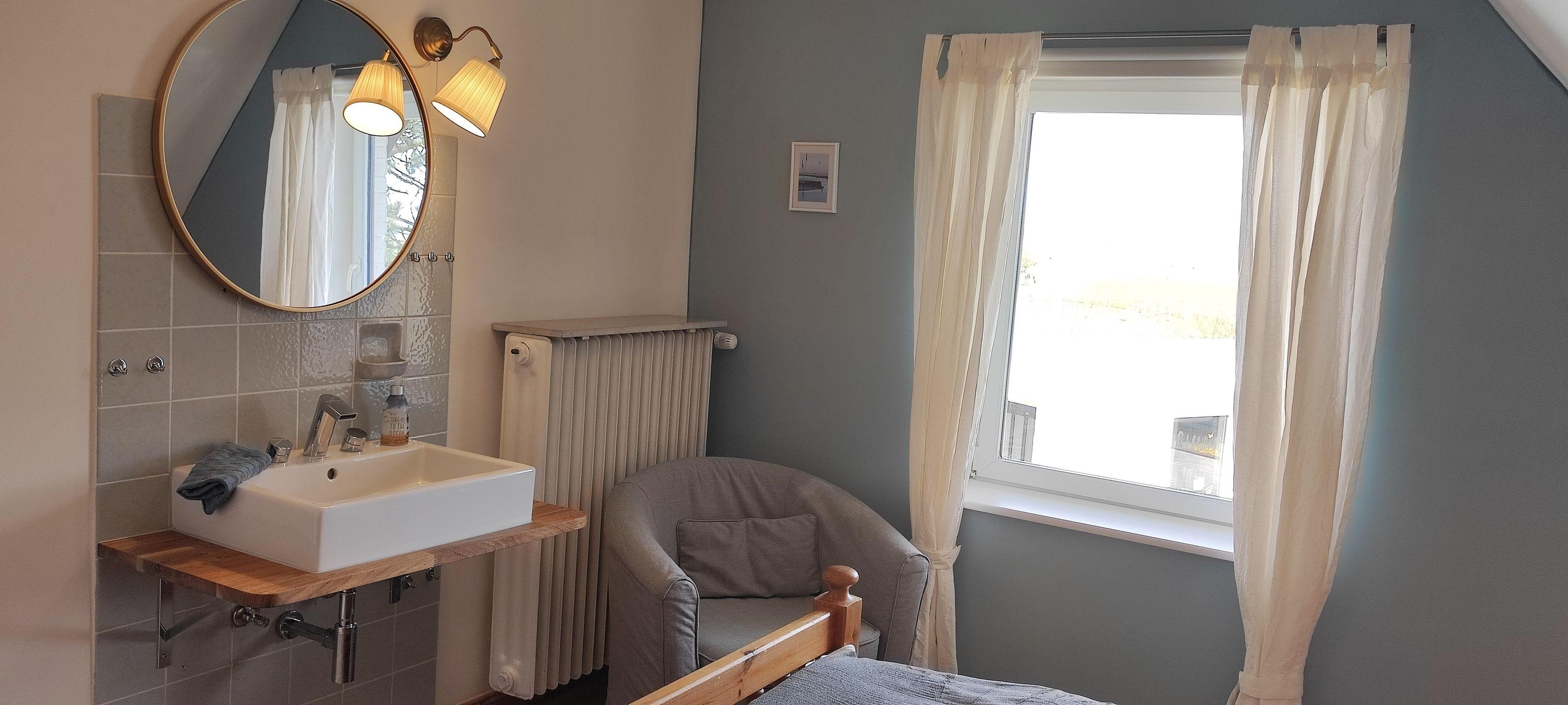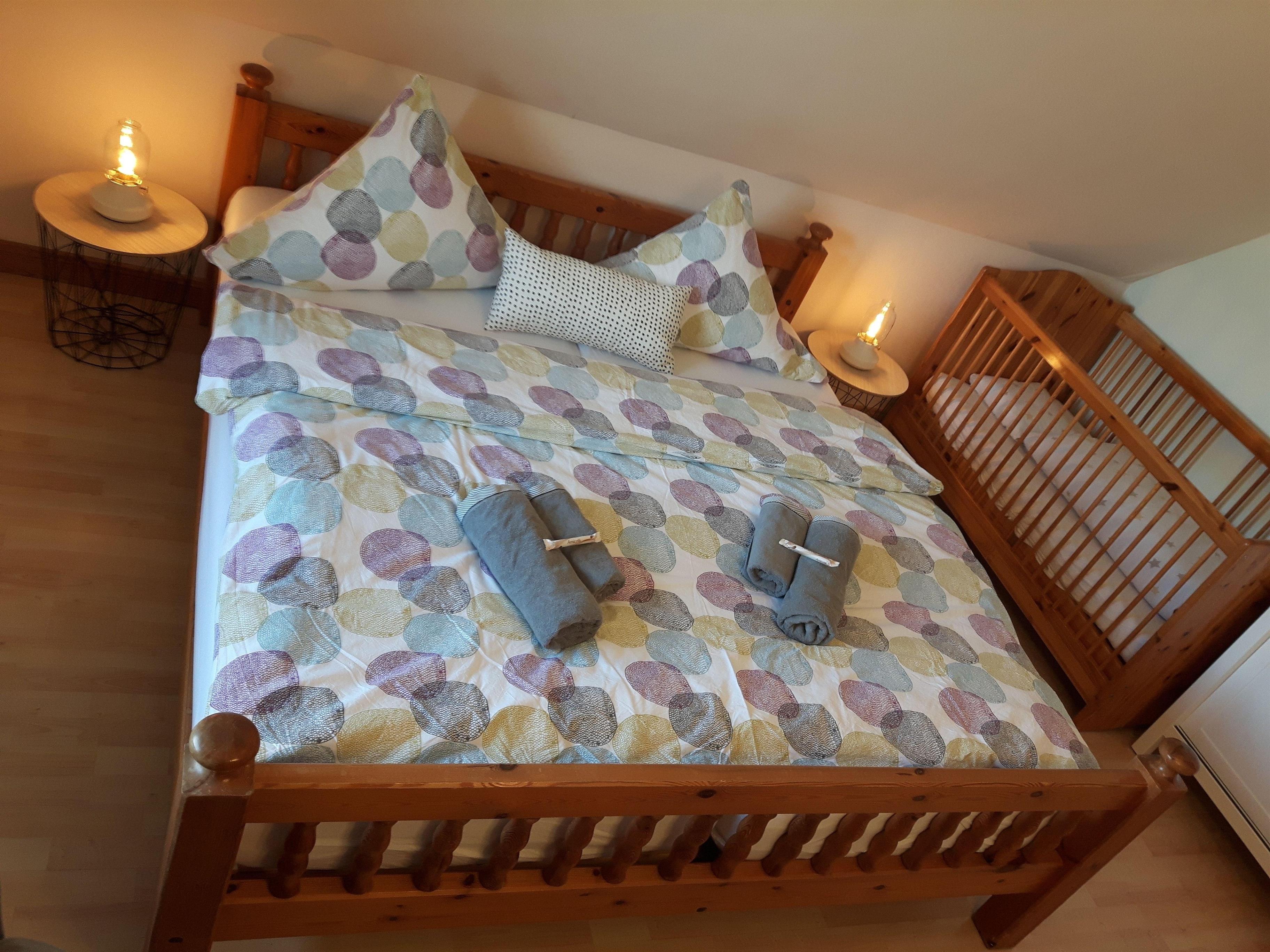 Im großen Schlafzimmer steht neben dem Doppelbett ein Kinderbettchen. Auch ein Waschbecken ist im Zimmer.