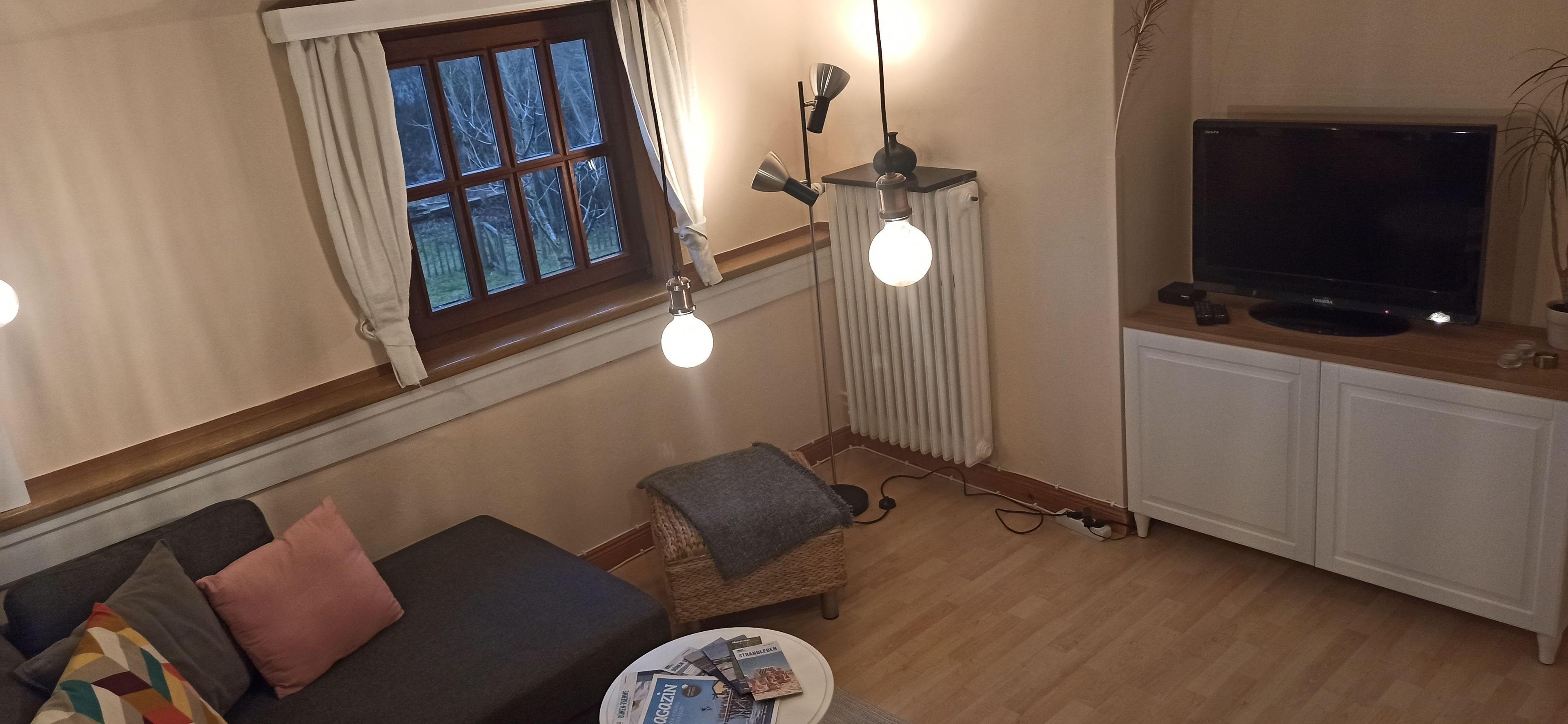 Im Wohnzimmer können Sie aus dem Fenster in den Garten und in die Weite schauen und sich auf dem Sofa ausruhen.