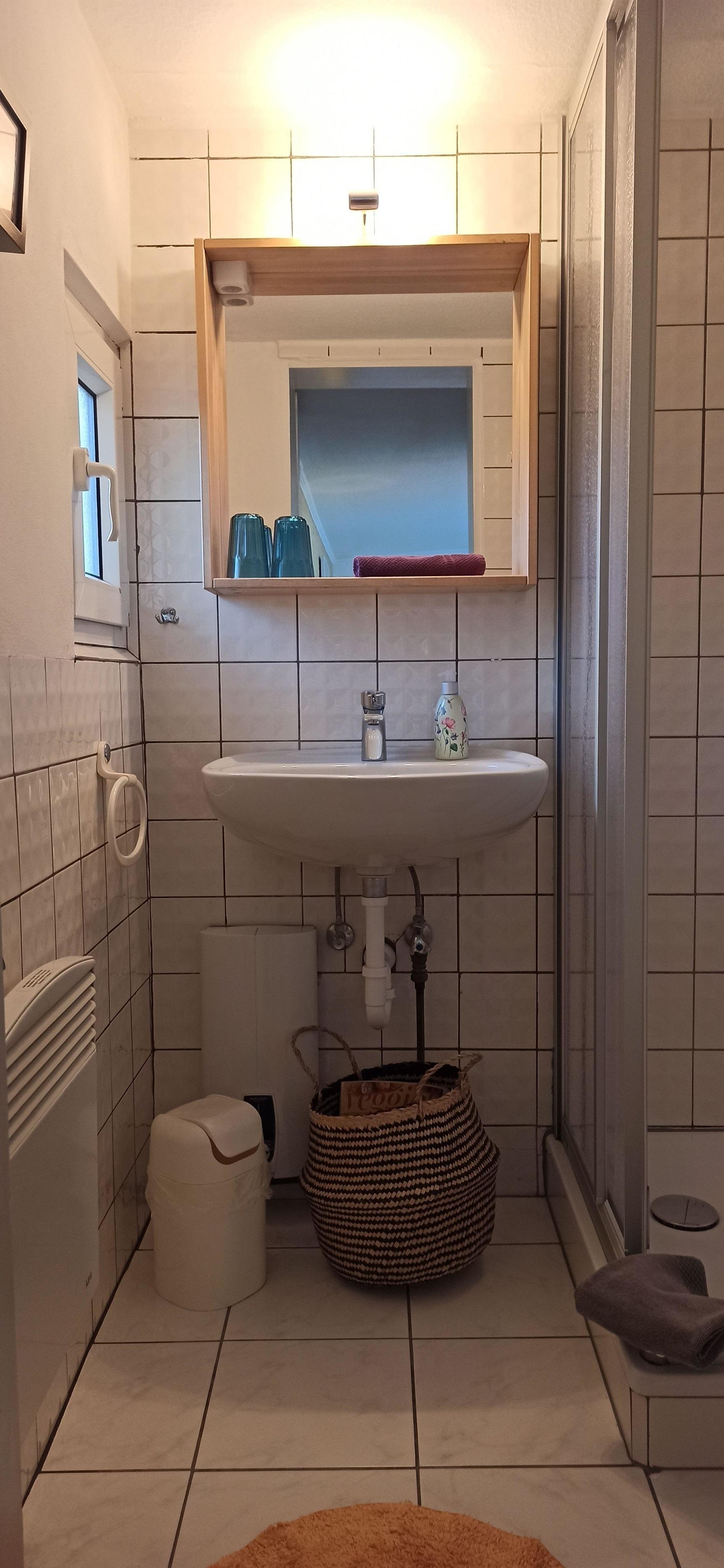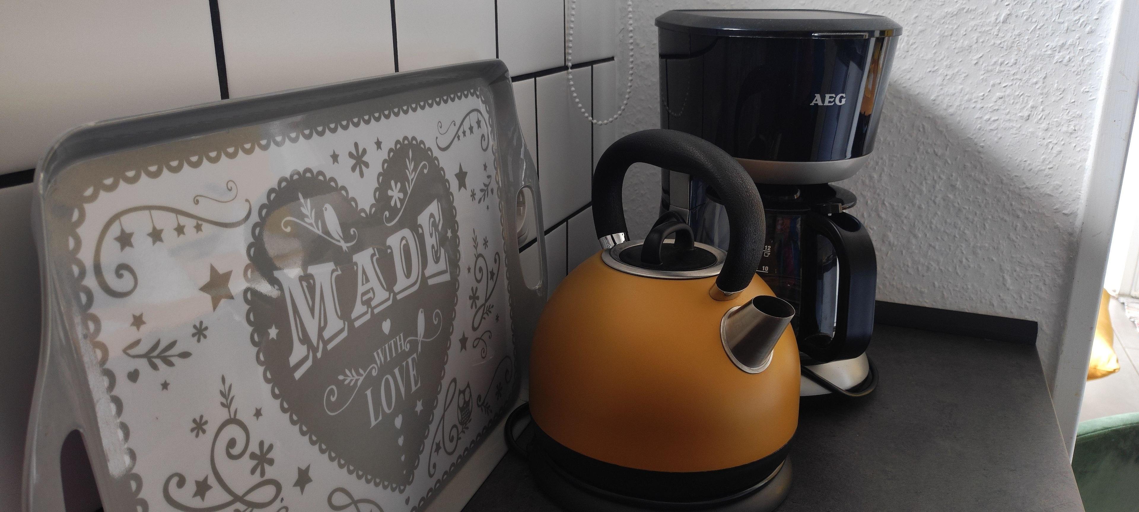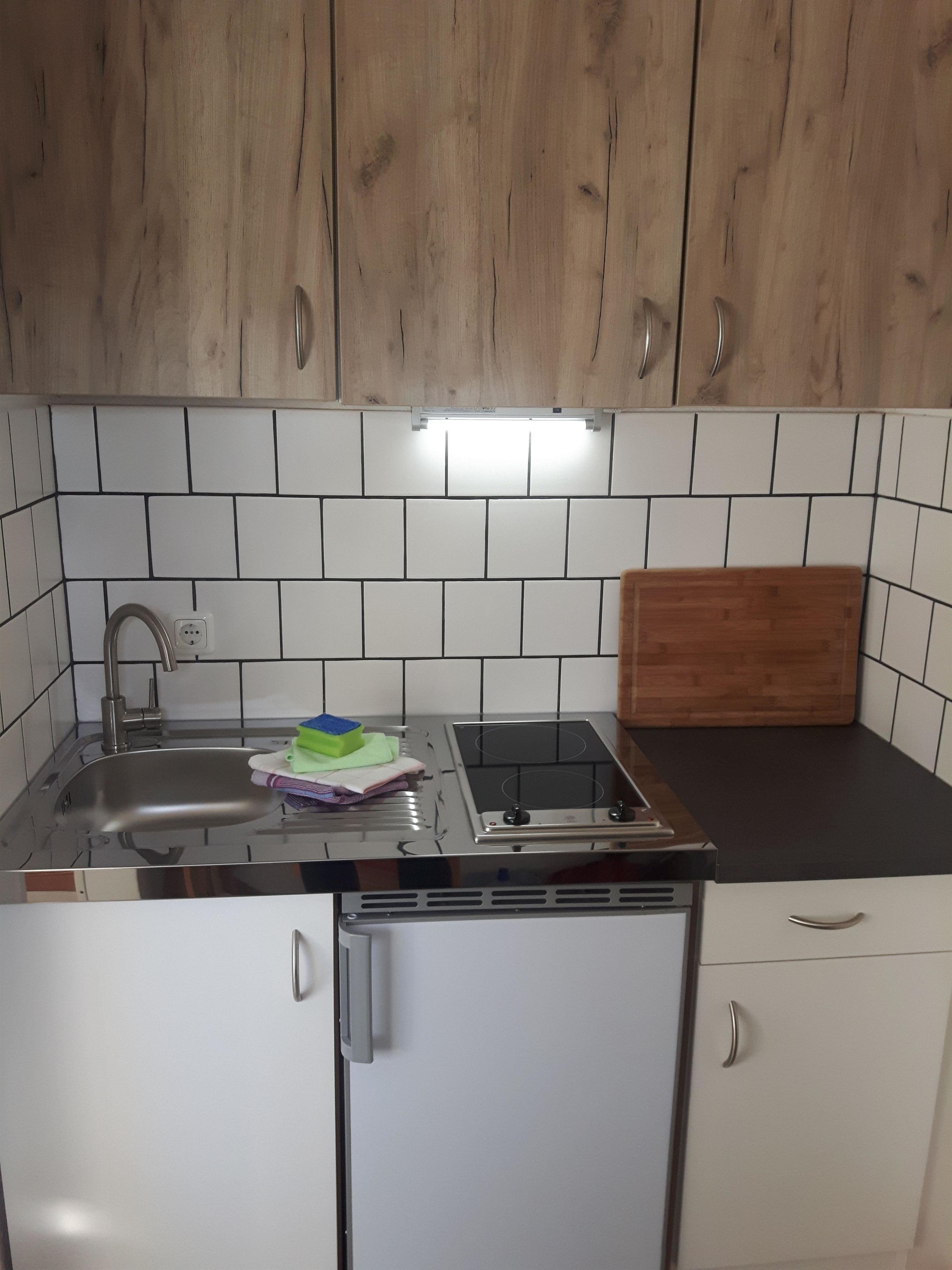 Die Küche ist mit einem 2-Platten-Herd, Kühlschrank mit Gefrierfach, Mikrowelle, Kaffeemaschine, Wasserkocher und ausreichend Geschirr ausgestattet.