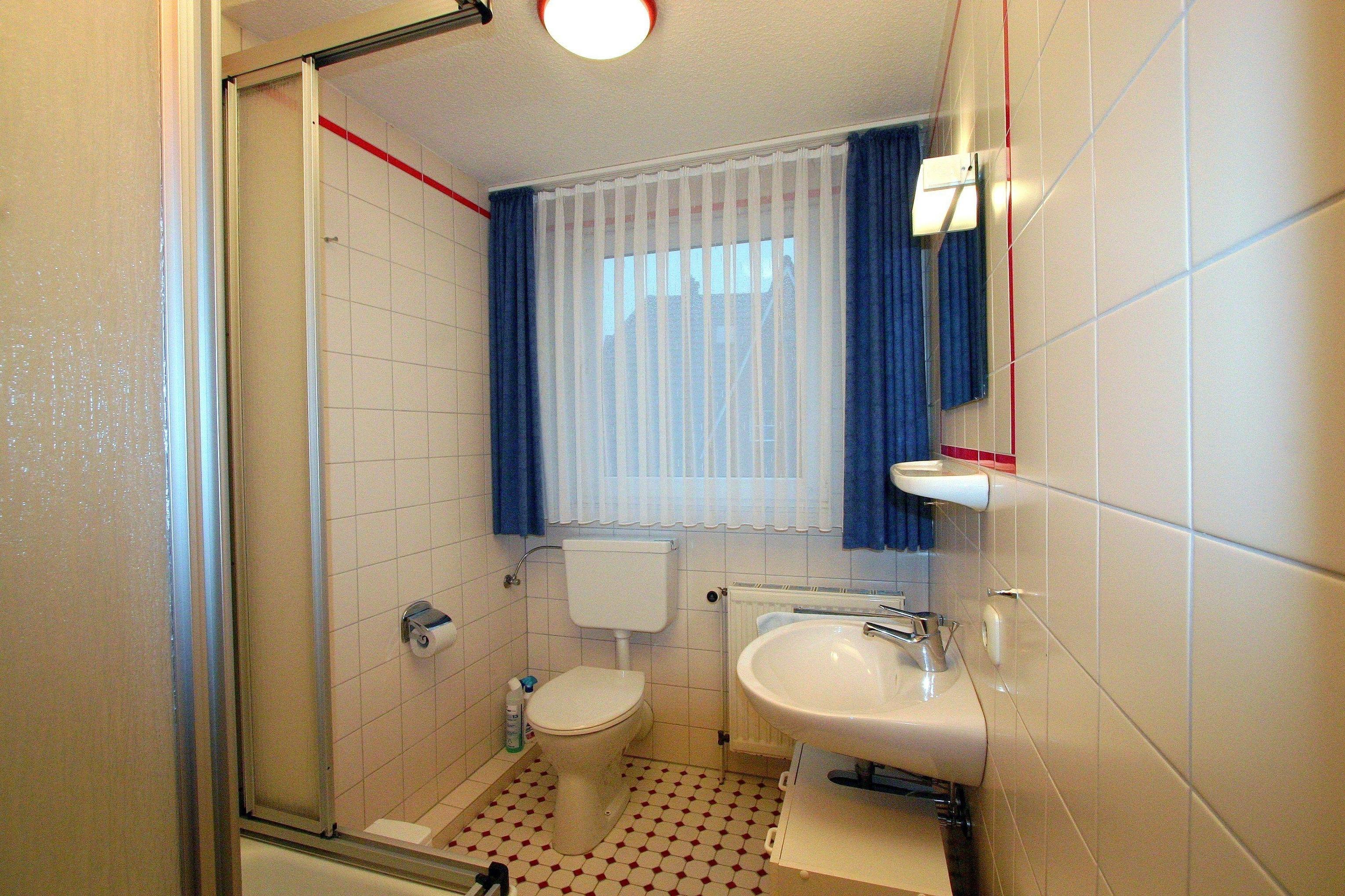 Das Badezimmer mit Tageslicht hat ein schlichtes Design und verfügt über Dusche, Waschbecken, WC und Spiegel.