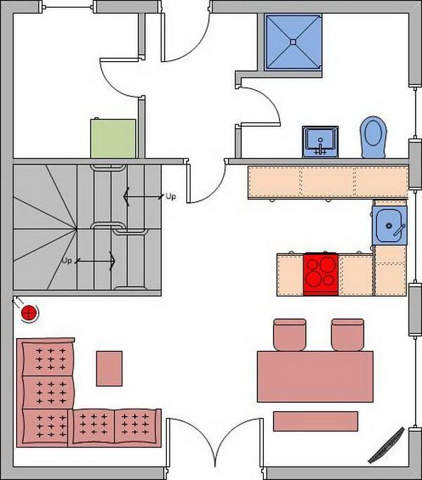 Eingangsbereich, Wohnraum mit offener Küche, Essbereich, Kamin und Zugang zur Terrasse, ein Duschbad/ WC, ein Hauswirtschaftsraum