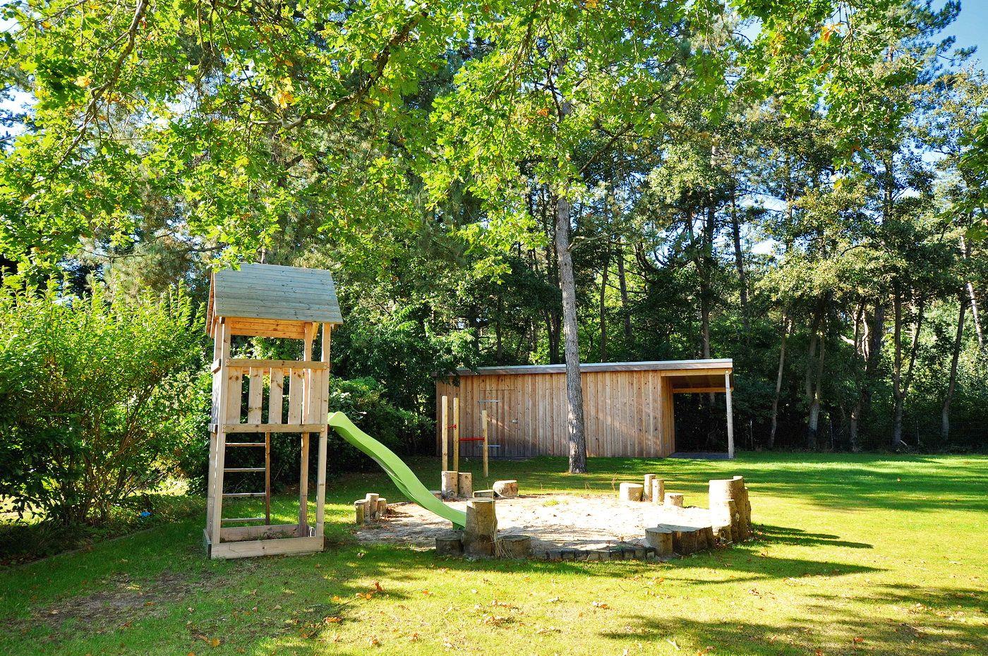 Auf der Terrasse befinden sich Gartenmöbel und ein Strandkorb, zudem gibt es einen kleinen Gemeinschaftsspielplatz im Außenbereich.