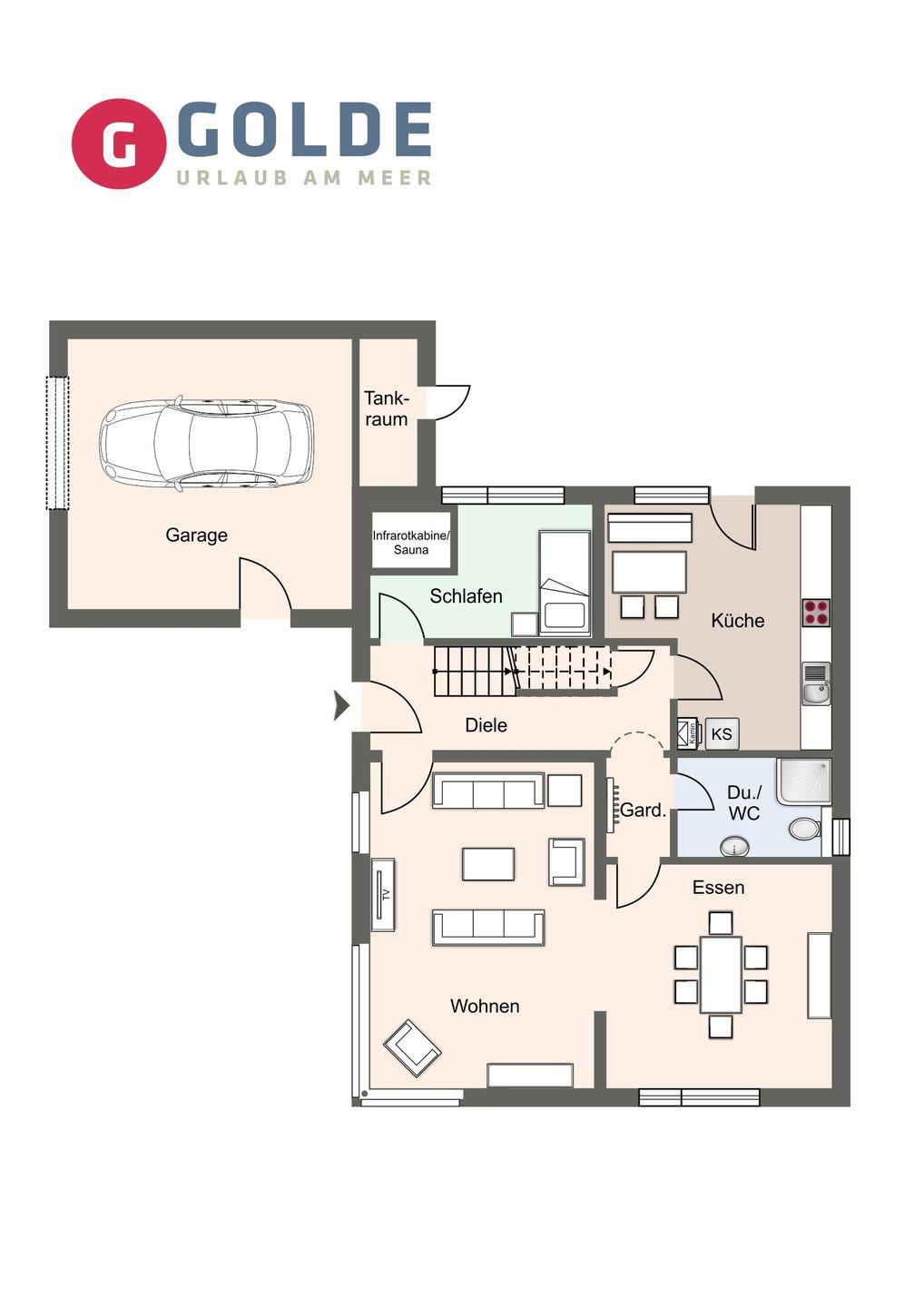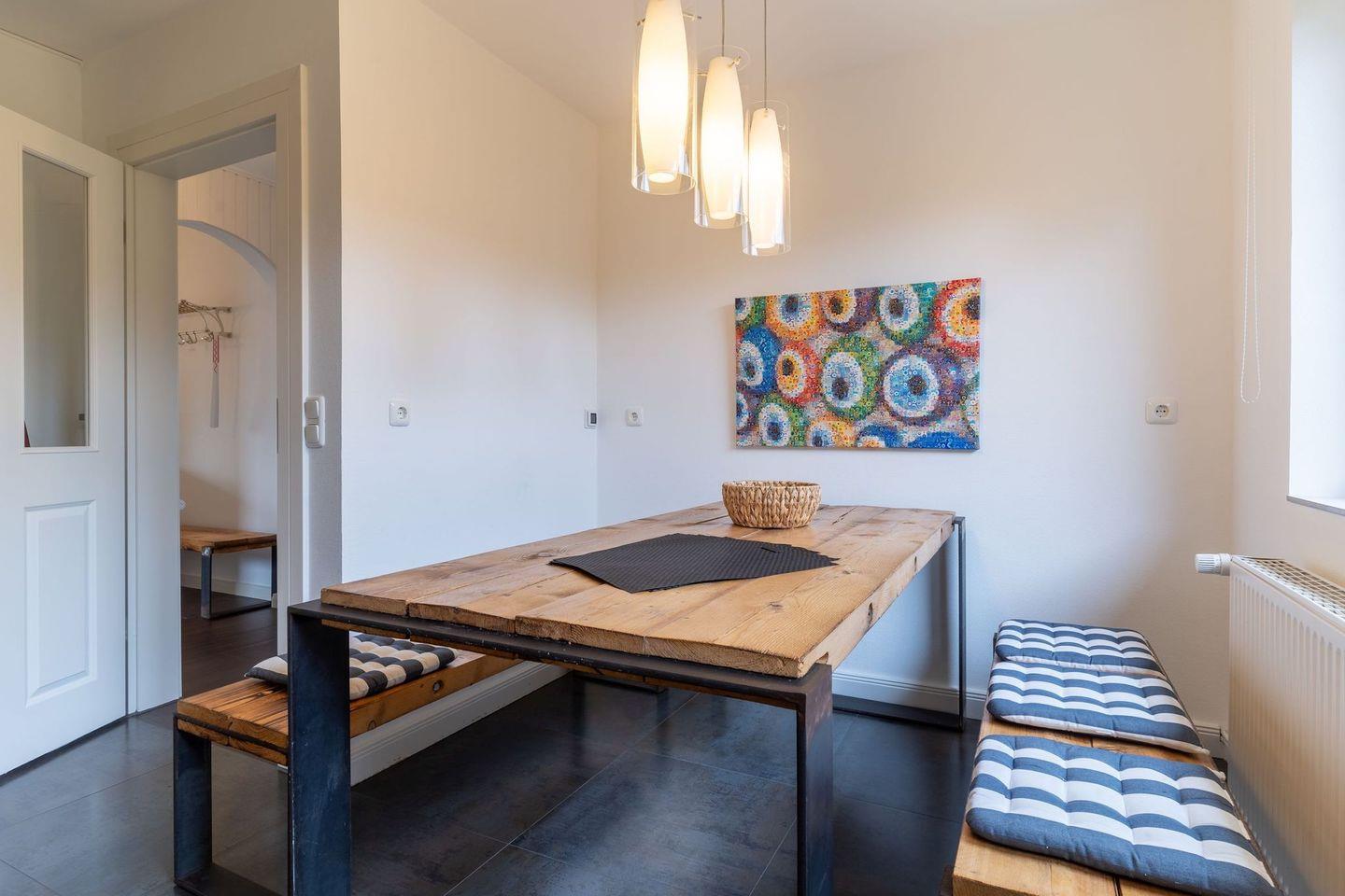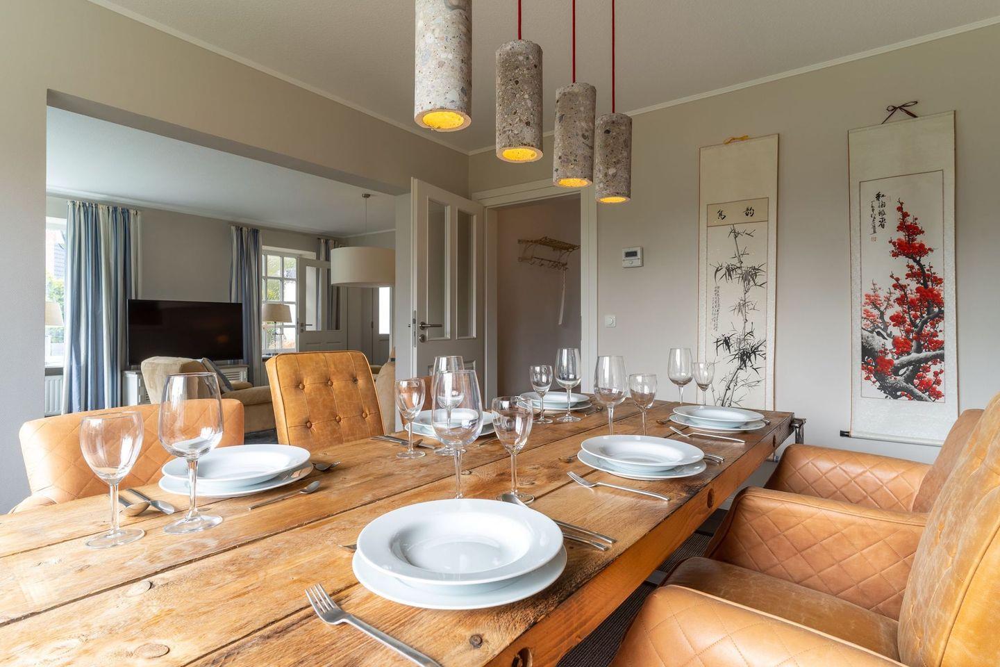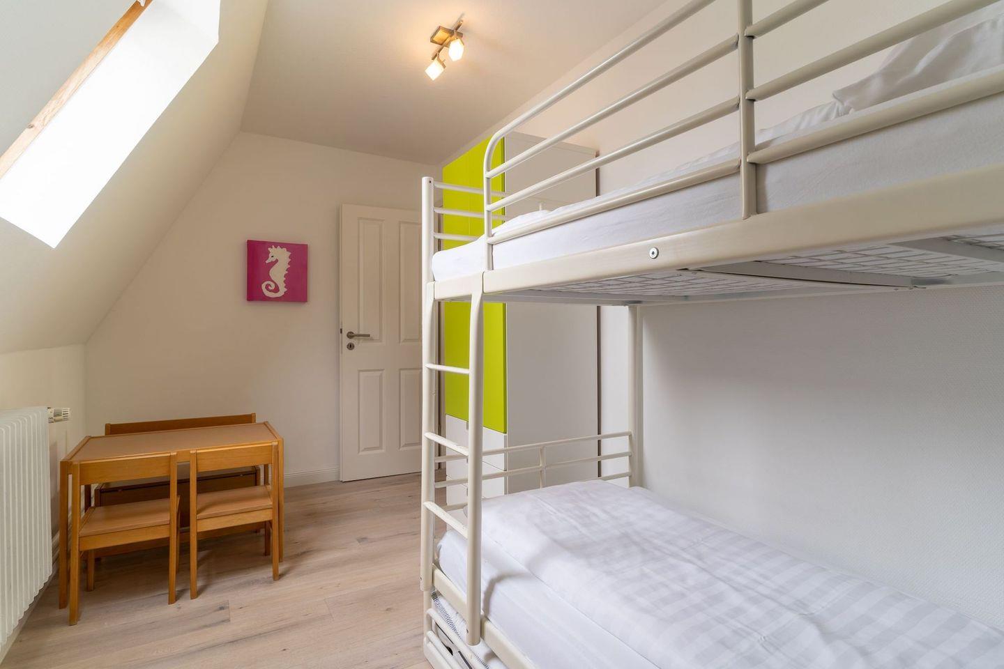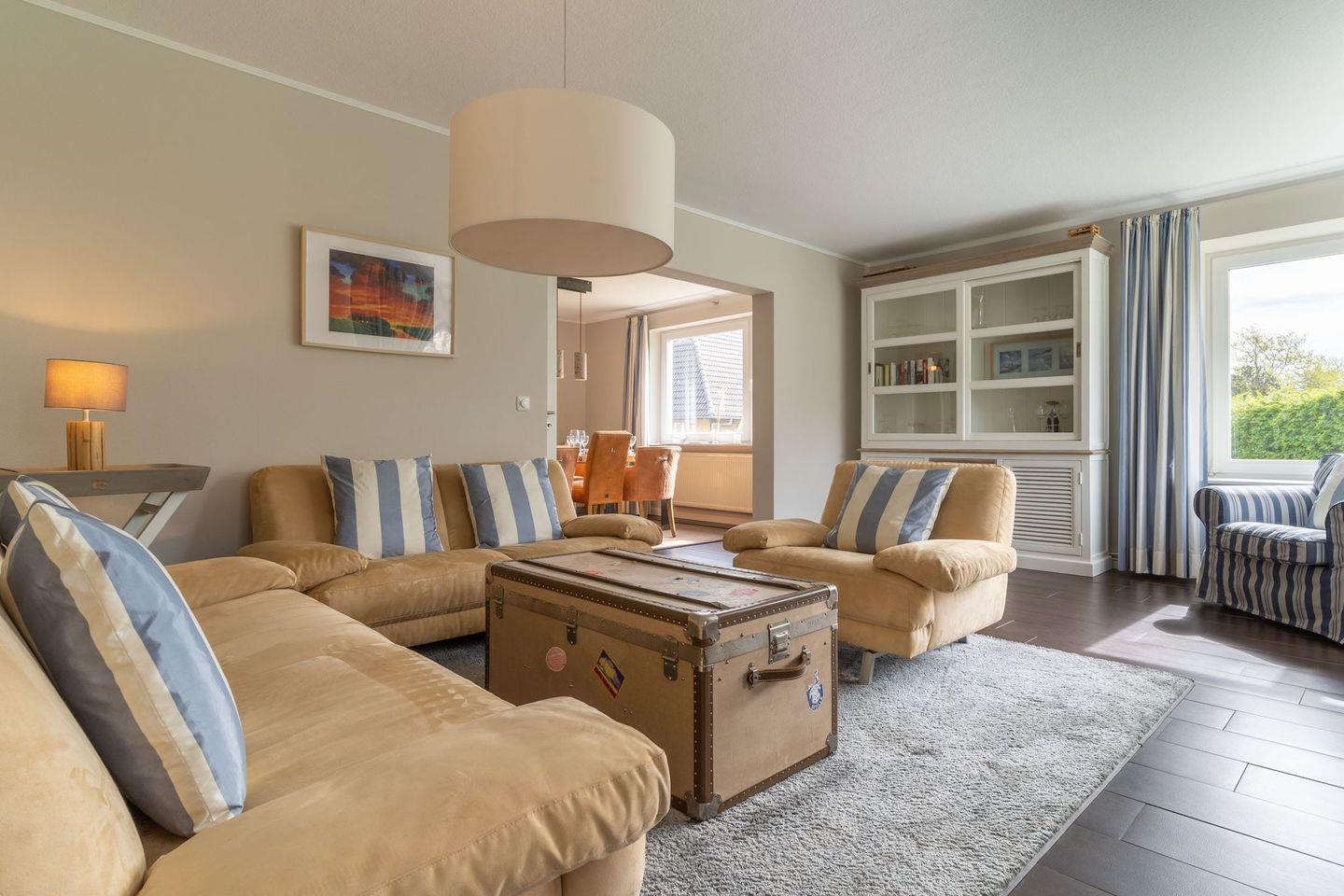 Im Erdgeschoss befindet sich der lichtdurchflutete Wohnraum mit TV und einem großzügigen Essbereich. Die Wohnräume sind mit Möbeln im shabby look ausgestattet. Vom Flur aus gelangt man in die voll ausgestattete Küche mit gemütlichen Sitzbänken. Außerdem ist im Erdgeschoss ein Duschbad und ein Einzelschlafzimmer mit Schreibtisch und einer Infrarot-Wärmekabine. Über eine Treppe gelangt man in das Obergeschoss. Die drei Schlafzimmer, zwei mit einem Doppelbett und eins mit einem Etagenbett sorgen für ruhmvolle Erholung. Darüber hinaus befindet sich im Obergeschoss ein weiteres Duschbad mit einer Badewanne.