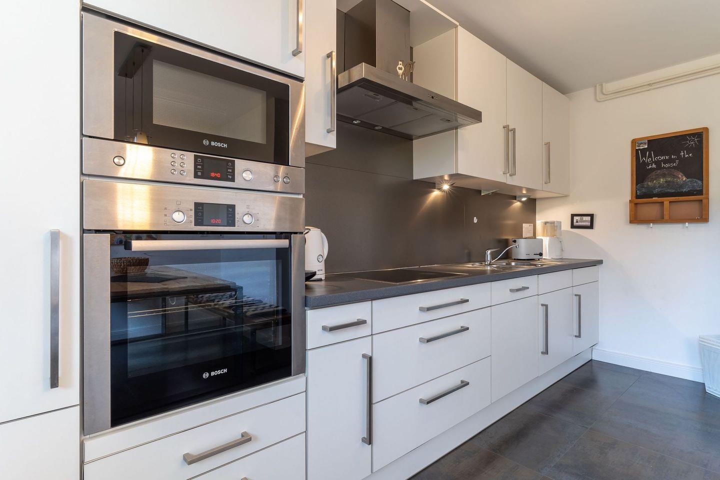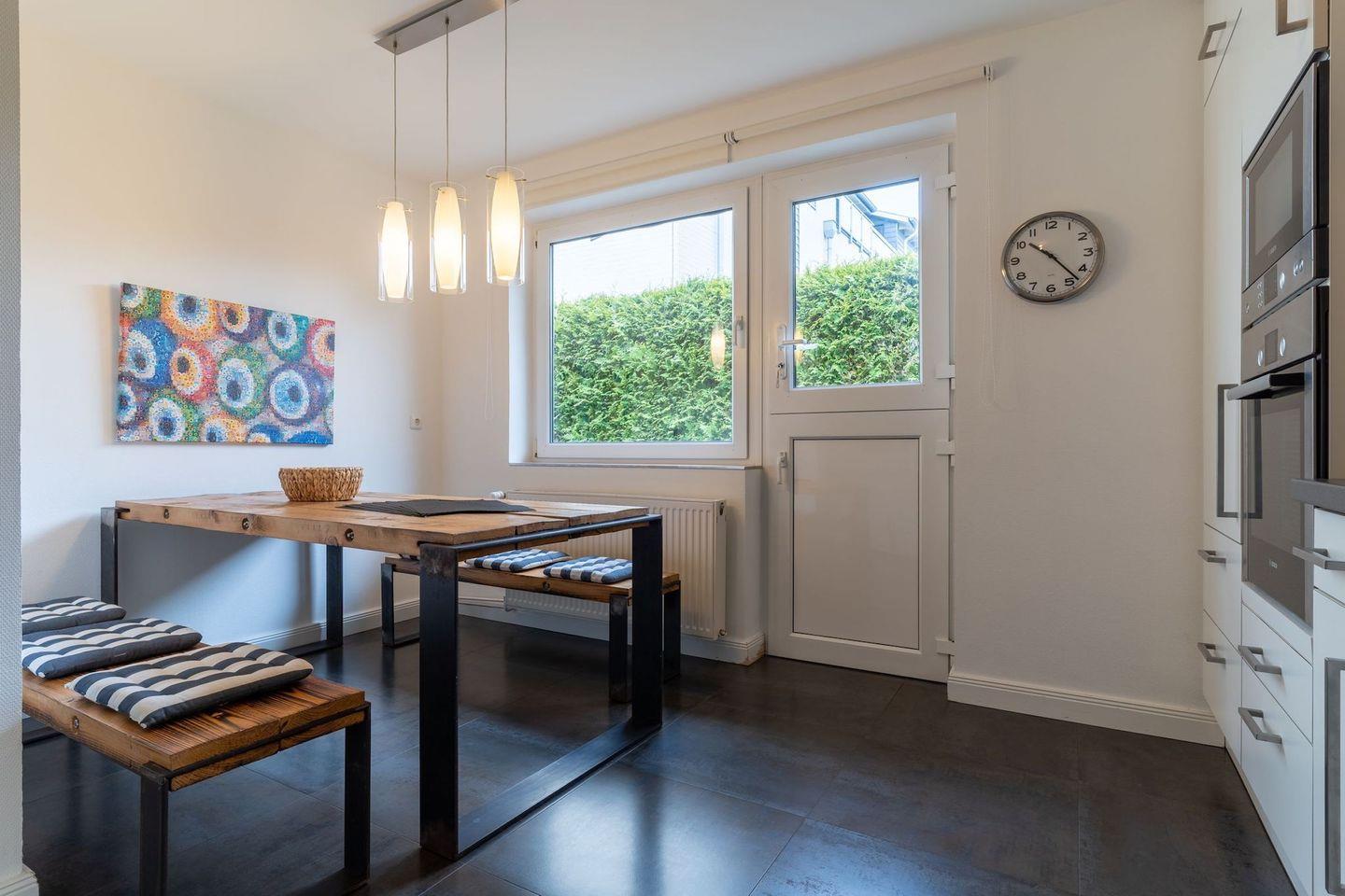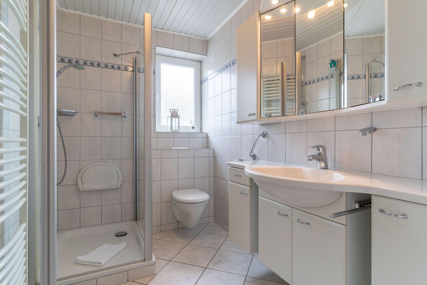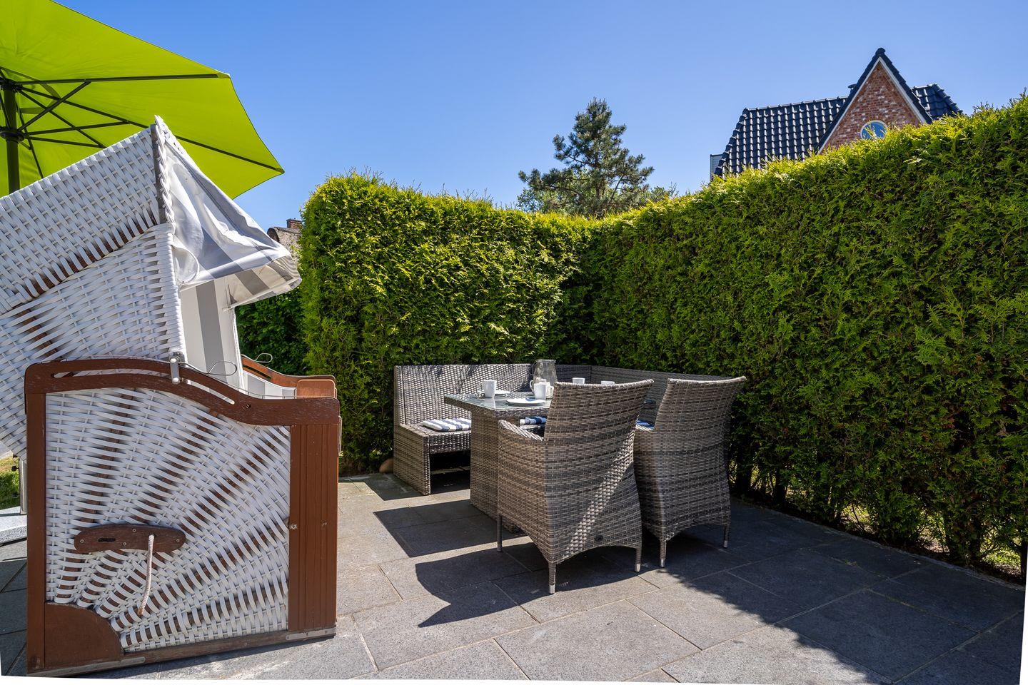 Im Erdgeschoss befindet sich der lichtdurchflutete Wohnraum mit TV und einem großzügigen Essbereich. Die Wohnräume sind mit Möbeln im shabby look ausgestattet. Vom Flur aus gelangt man in die voll ausgestattete Küche mit gemütlichen Sitzbänken. Außerdem ist im Erdgeschoss ein Duschbad und ein Einzelschlafzimmer mit Schreibtisch und einer Infrarot-Wärmekabine. Über eine Treppe gelangt man in das Obergeschoss. Die drei Schlafzimmer, zwei mit einem Doppelbett und eins mit einem Etagenbett sorgen für ruhmvolle Erholung. Darüber hinaus befindet sich im Obergeschoss ein weiteres Duschbad mit einer Badewanne.