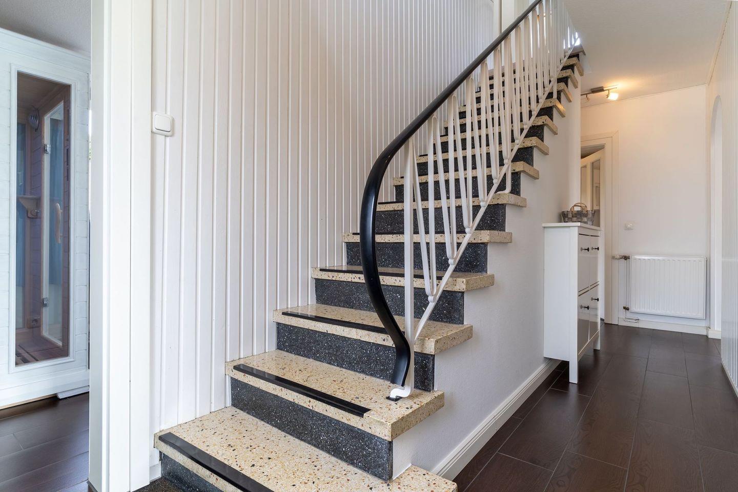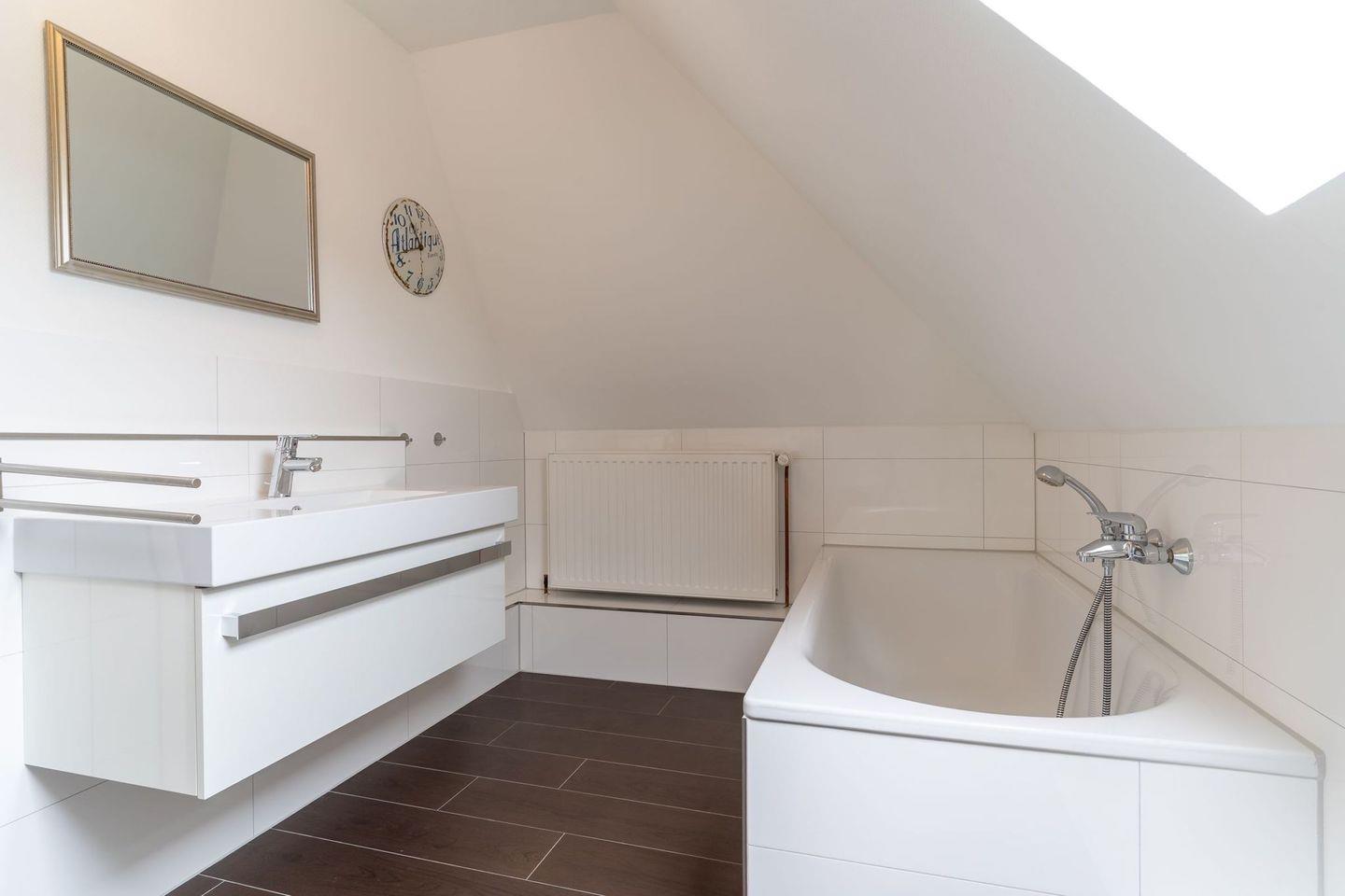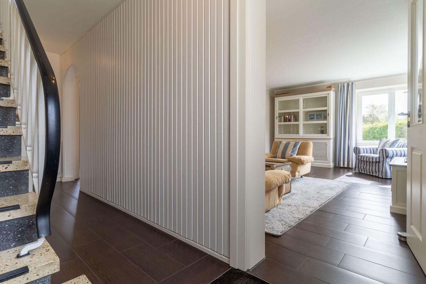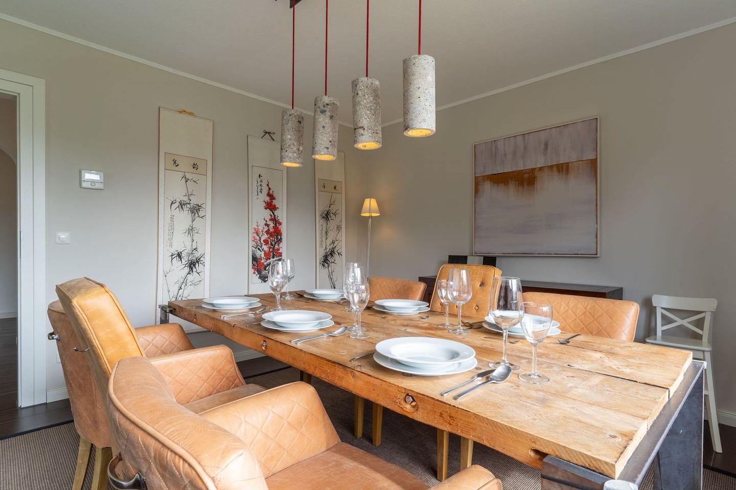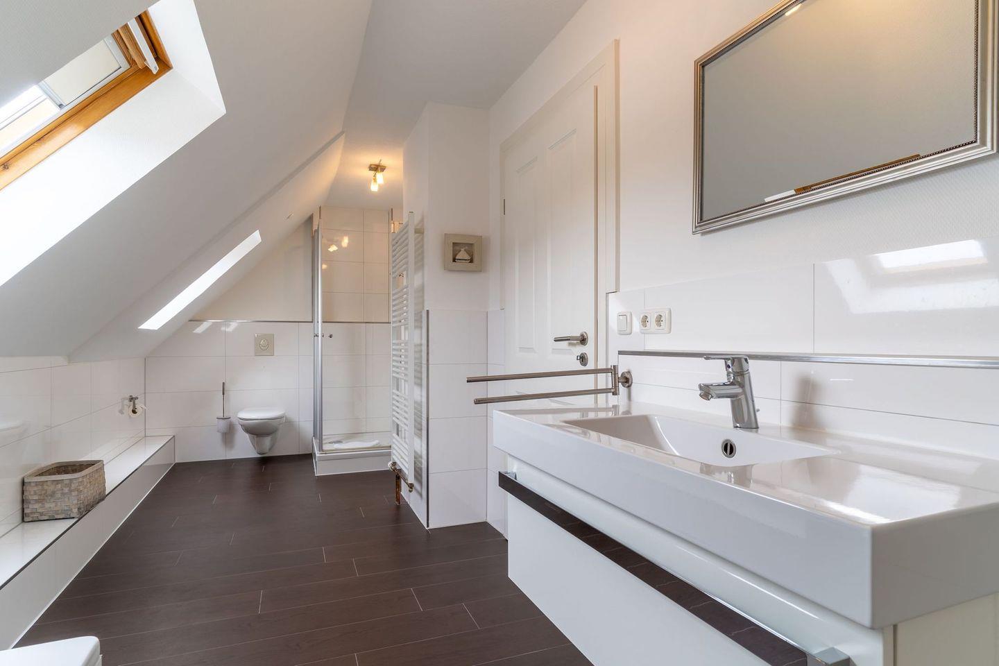 Im Erdgeschoss befindet sich der lichtdurchflutete Wohnraum mit TV und einem großzügigen Essbereich. Die Wohnräume sind mit Möbeln im shabby look ausgestattet. Vom Flur aus gelangt man in die voll ausgestattete Küche mit gemütlichen Sitzbänken. Außerdem ist im Erdgeschoss ein Duschbad und ein Einzelschlafzimmer mit Schreibtisch und einer Infrarot-Wärmekabine. Über eine Treppe gelangt man in das Obergeschoss. Die drei Schlafzimmer, zwei mit einem Doppelbett und eins mit einem Etagenbett sorgen für ruhmvolle Erholung. Darüber hinaus befindet sich im Obergeschoss ein weiteres Duschbad mit einer Badewanne.
