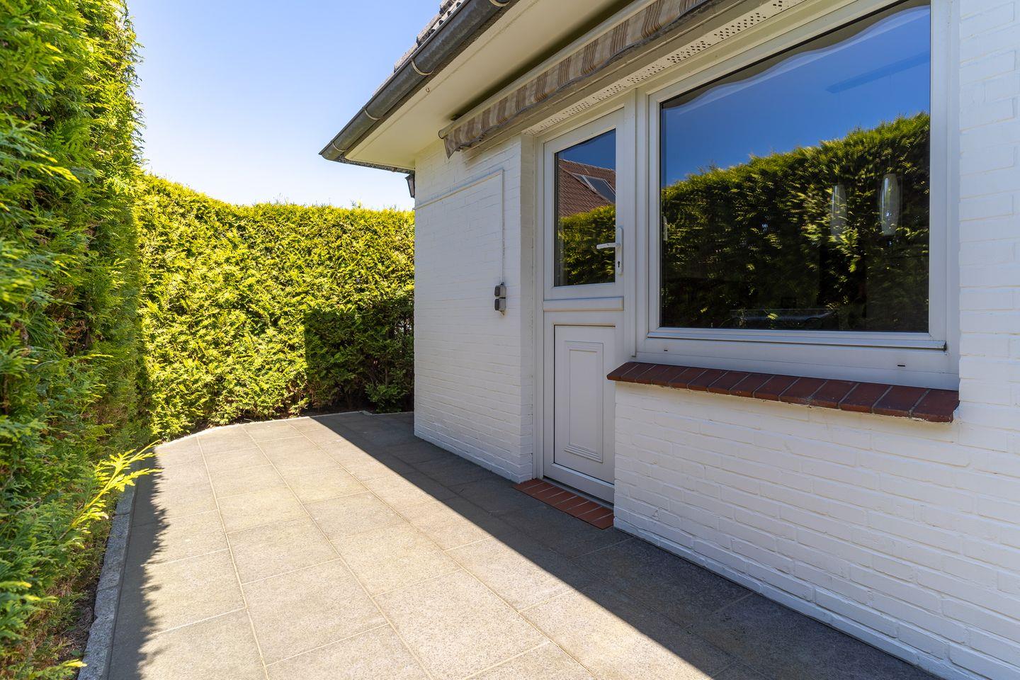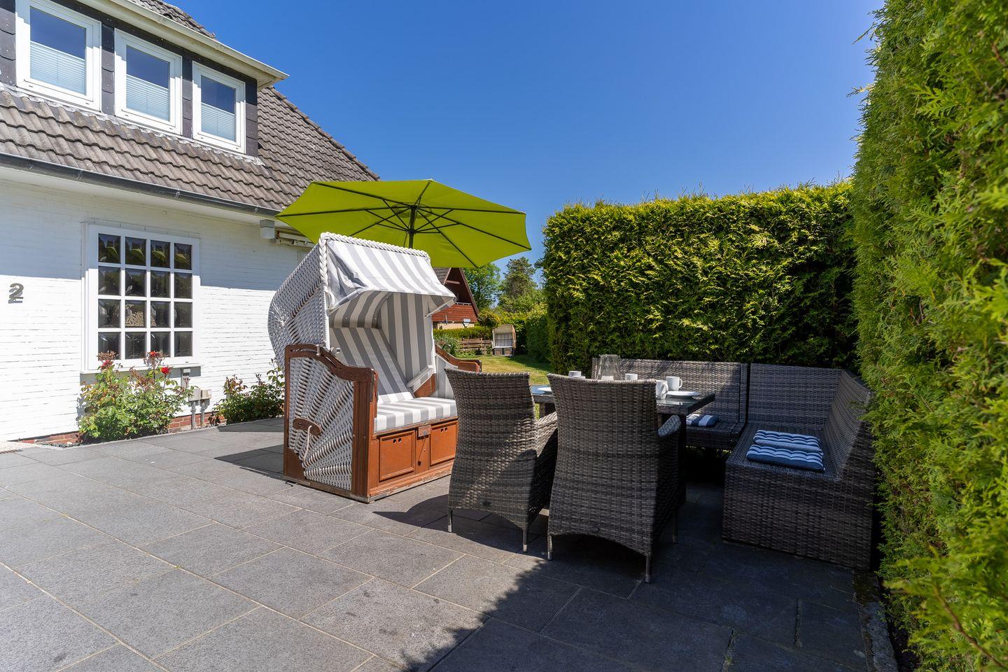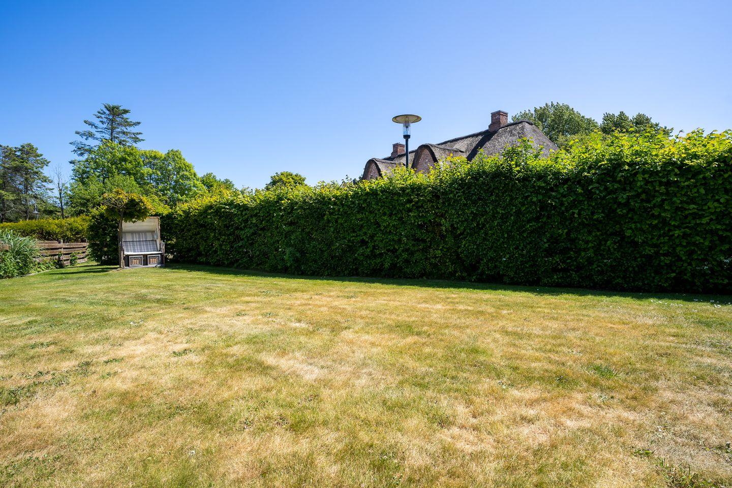 Das Grundstück mit einem Stellplatz und Toranlage, großer Rasenfläche und zwei geschützten, sonnigen Terrassen ist mit heimischen Pflanzen angelegt.