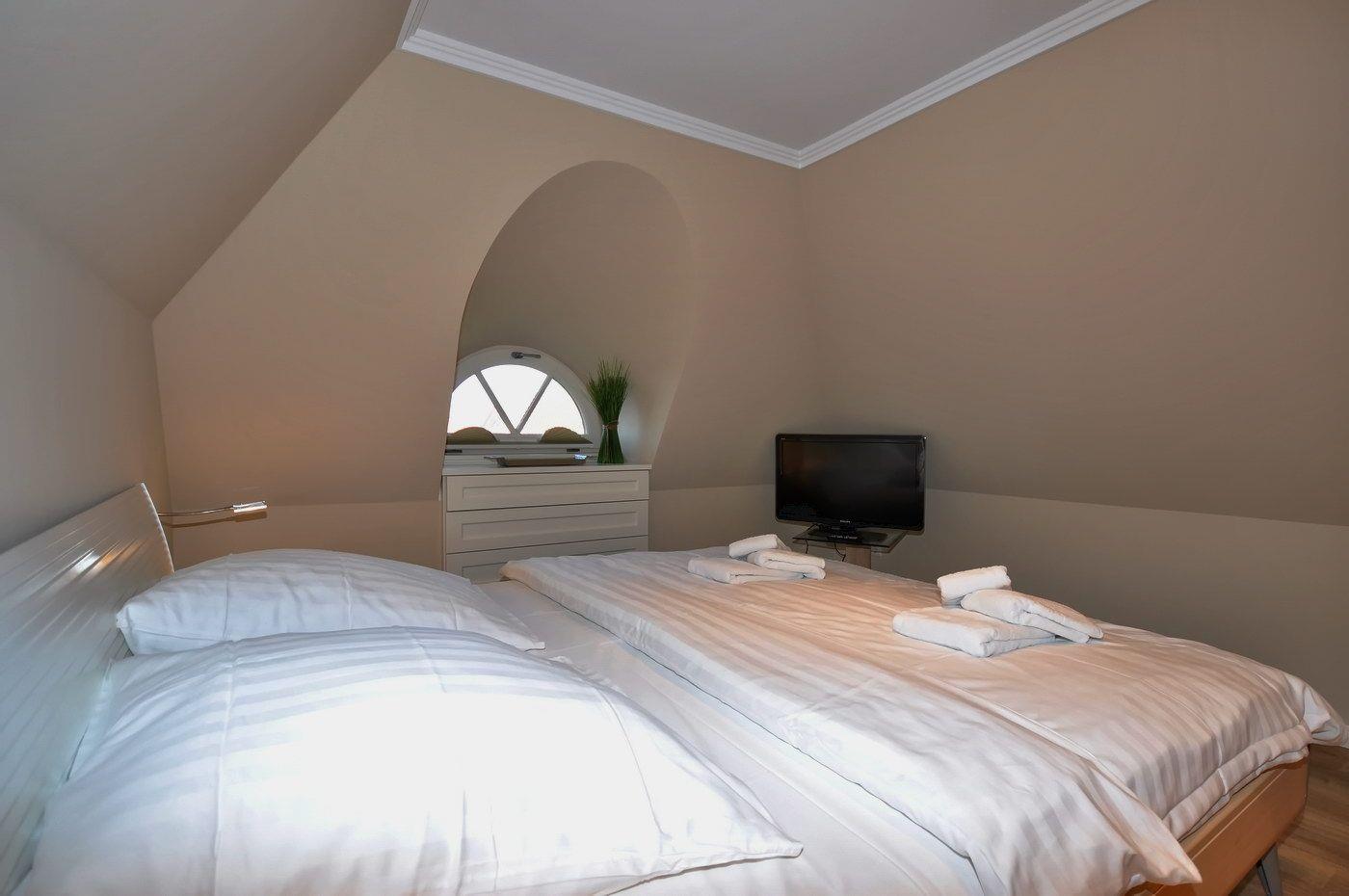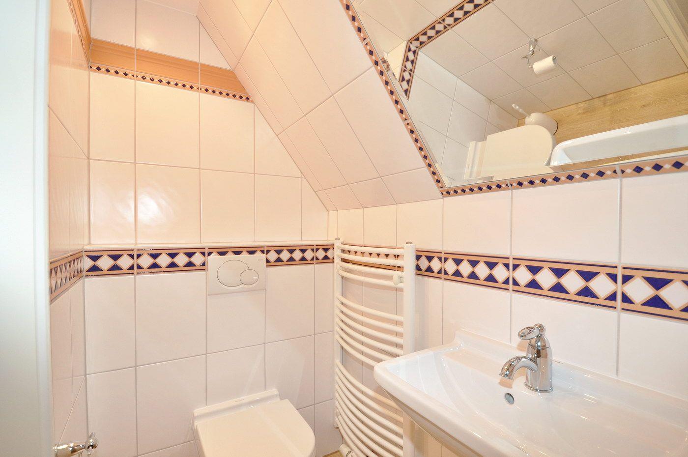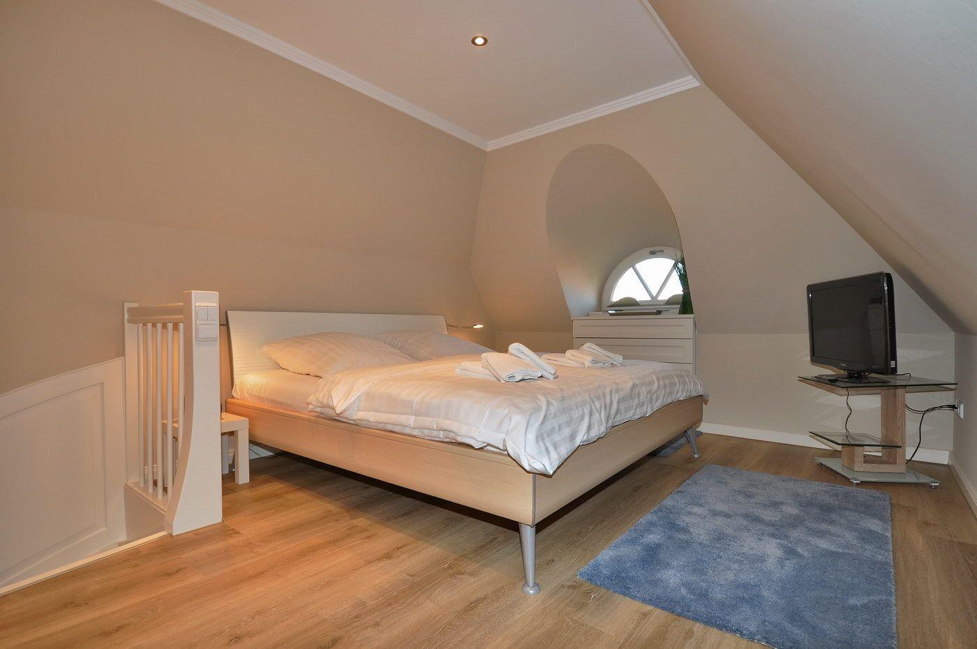 Dachgeschoss: offener Schlafbereich mit Doppelbett (180 x 200 cm - Einzelmatratzen), ein Gäste-WC