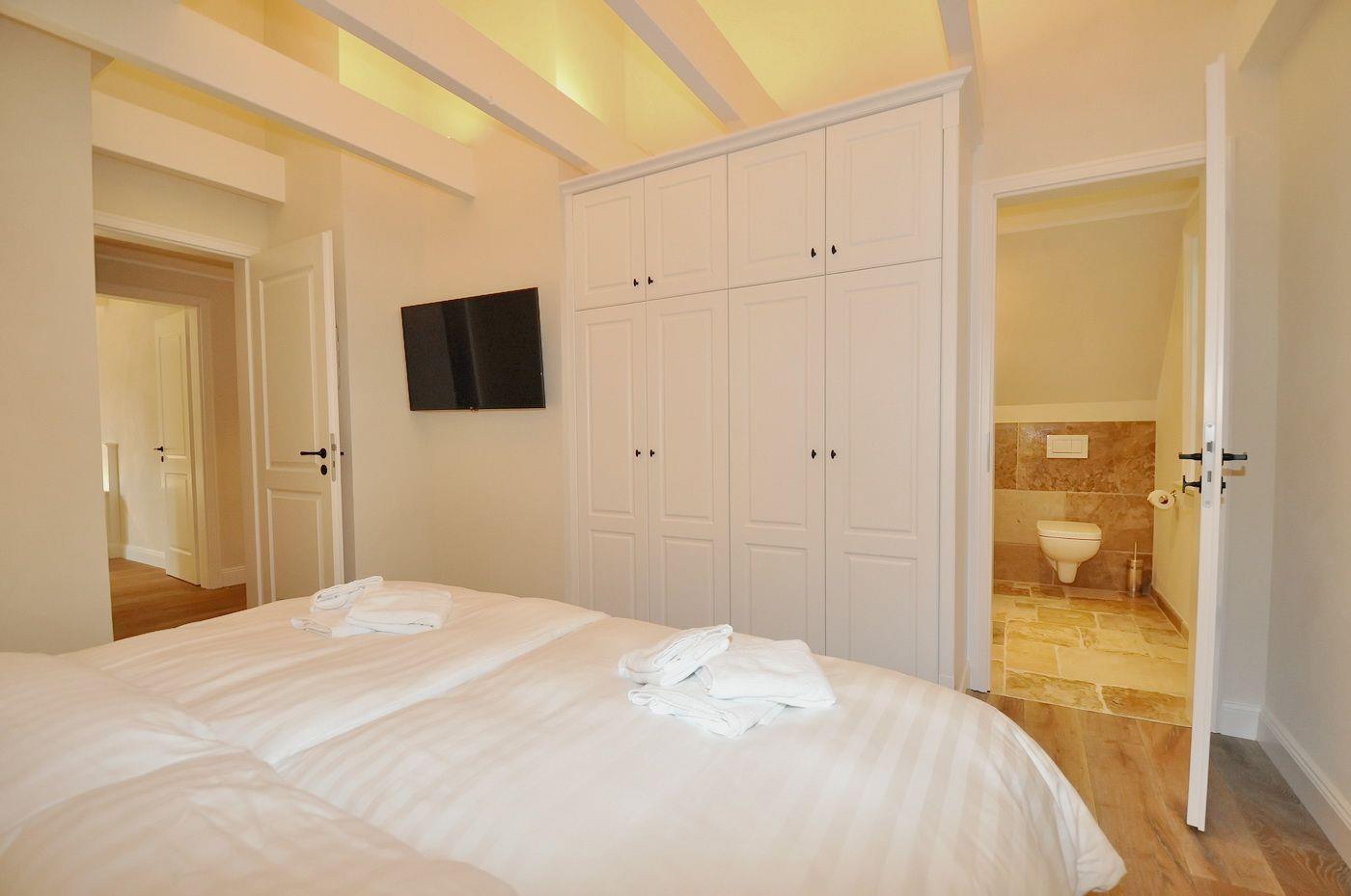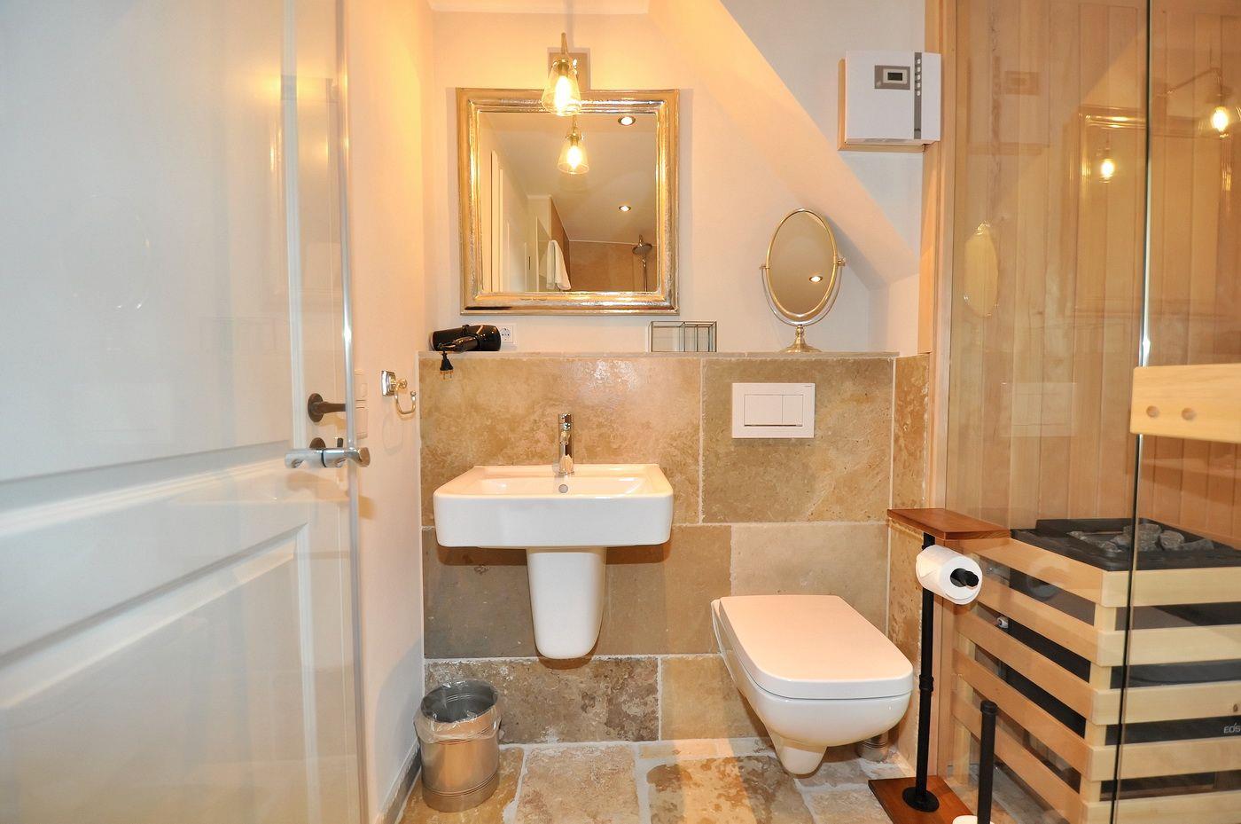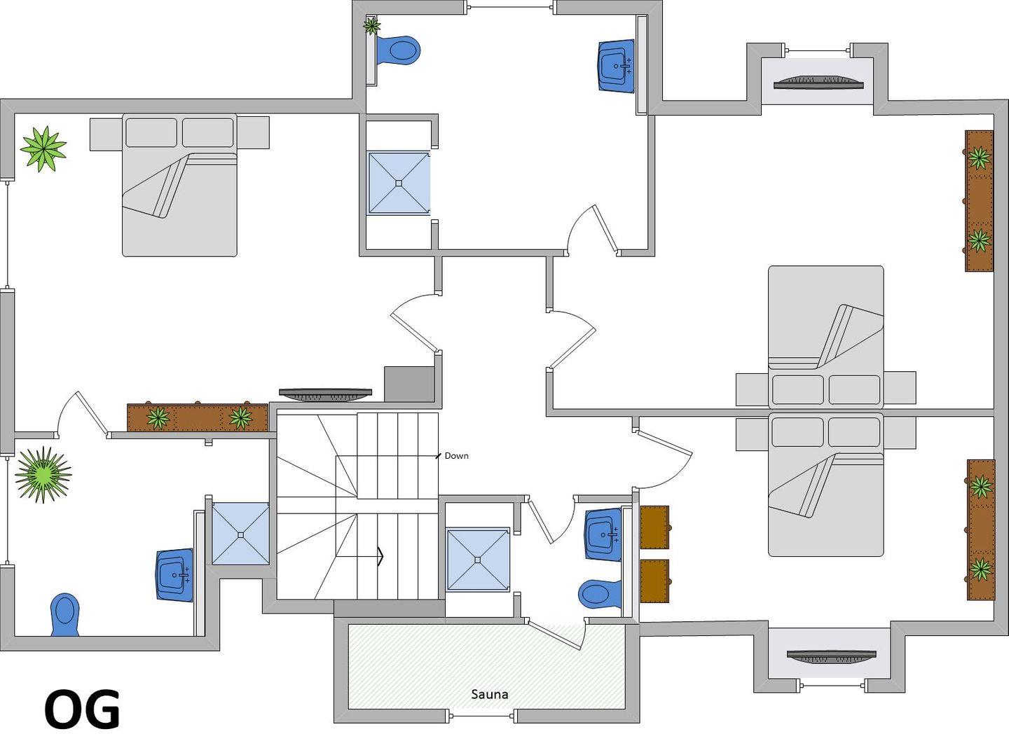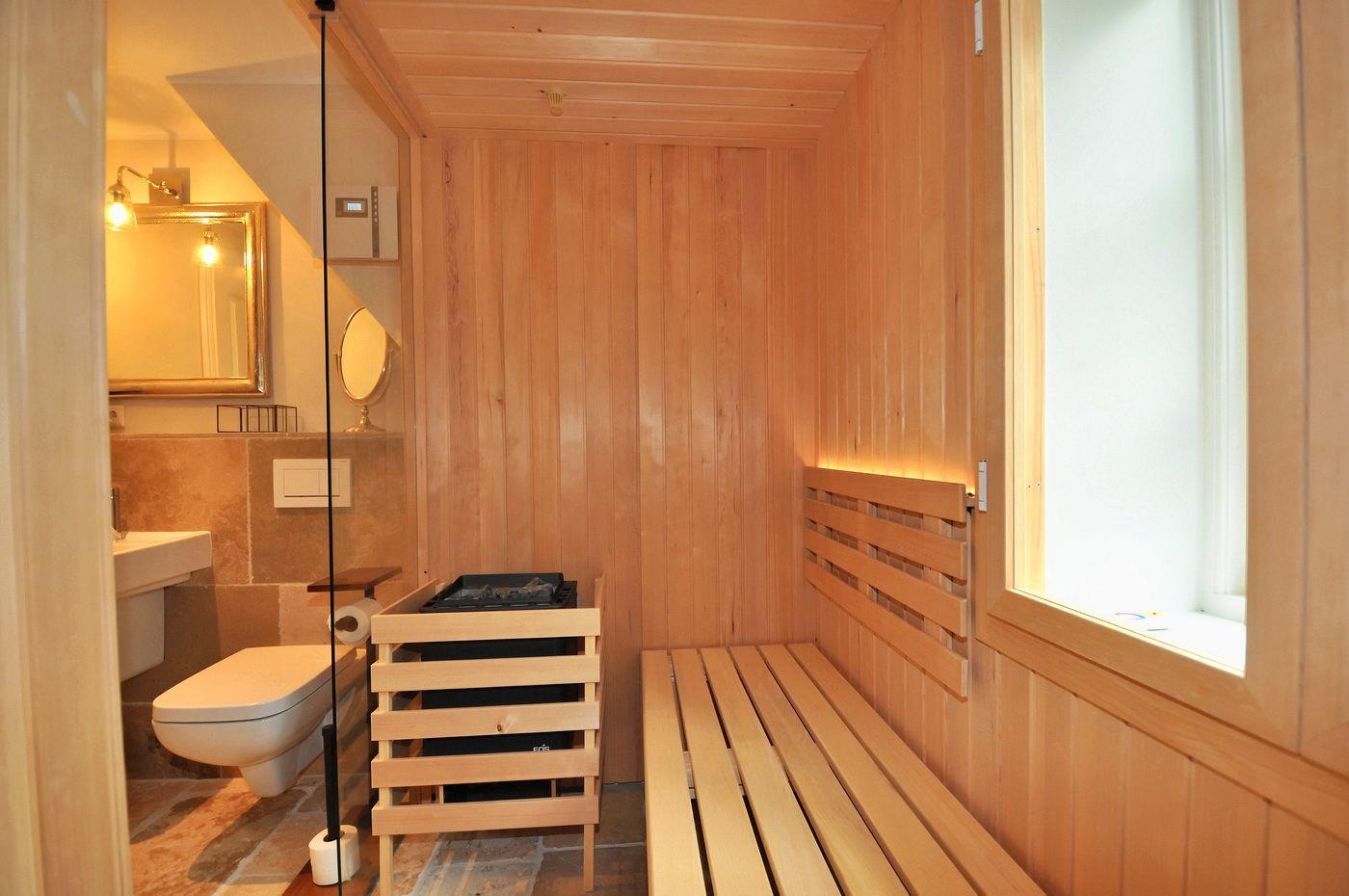 Obergeschoss: ein Schlafzimmer mit Doppelbett (200 x 200 cm - Einzelmatratzen), TV und Duschbad en Suite, ein Schlafzimmer mit Doppelbett (200 x 200 cm - Einzelmatratzen) und Duschbad en Suite, ein Schlafzimmer mit Doppelbett (200 x 200 cm - Einzelmatratzen), ein Duschbad mit integrierter Sauna