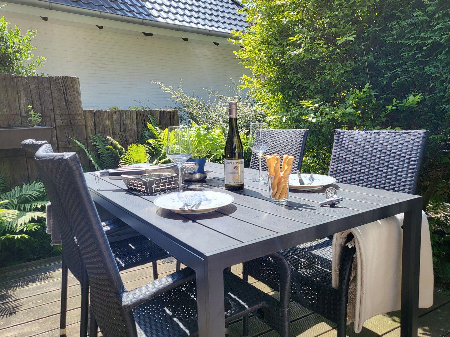 Die Wohnung hat zusätzlich zu dem Gemeinschaftsgarten eine eigene Frühstücks-Terrasse mit einem Weber Gas Grill.