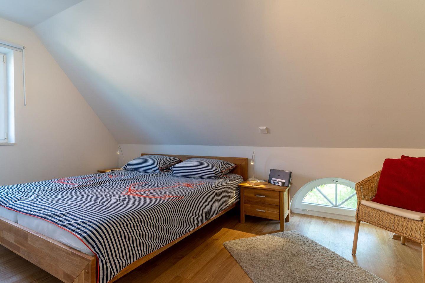 Im Dachgeschoss befindet sich ein weiteres Schlafzimmer mit einem Doppelbett (160 x 200 cm - zwei Einzelmatratzen), einem kleinen Kleiderschrank und einer Leseecke.