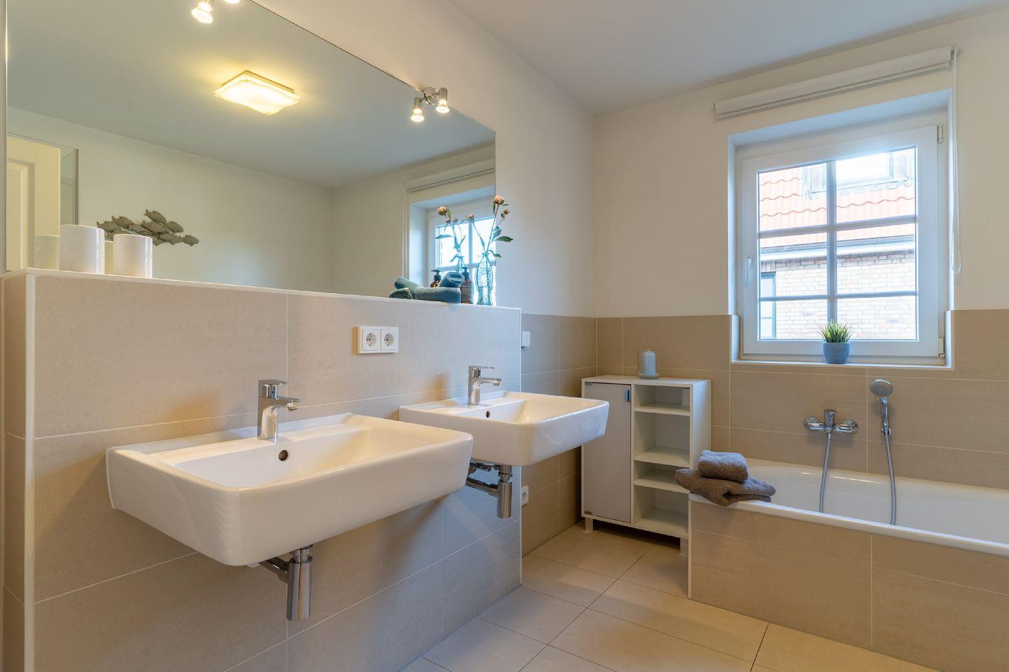 Im Obergeschoss gibt es zwei Schlafzimmer. Eines mit einem Doppelbett (180 x 200 cm) und ein weiteres Schlafzimmer mit 2 Einzelbetten (je 90 x 200 cm). Beide Schlafzimmer verfügen über großzügige Schränke und zusätzliche Sideboards. Das Obergeschoss beherbergt auch ein großes Badezimmer mit Badewanne, separater Dusche, WC und zwei Waschtischen.