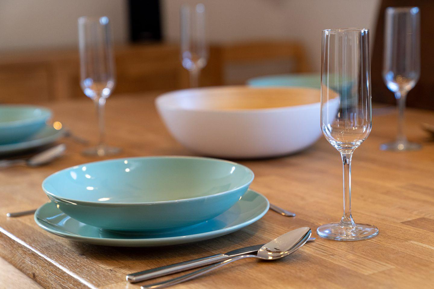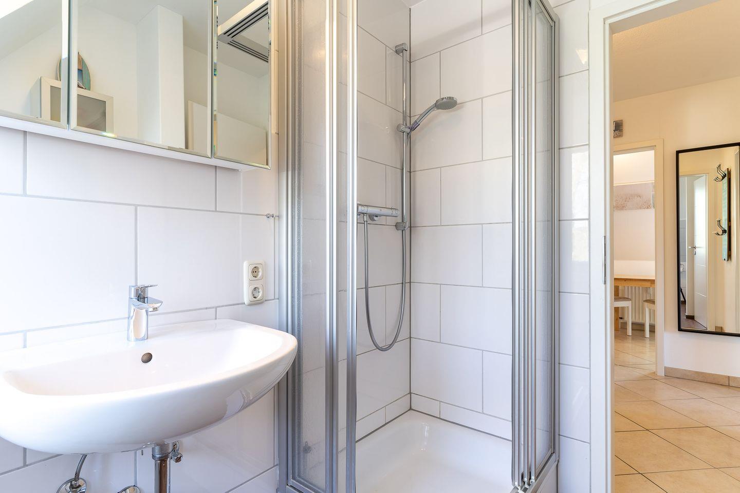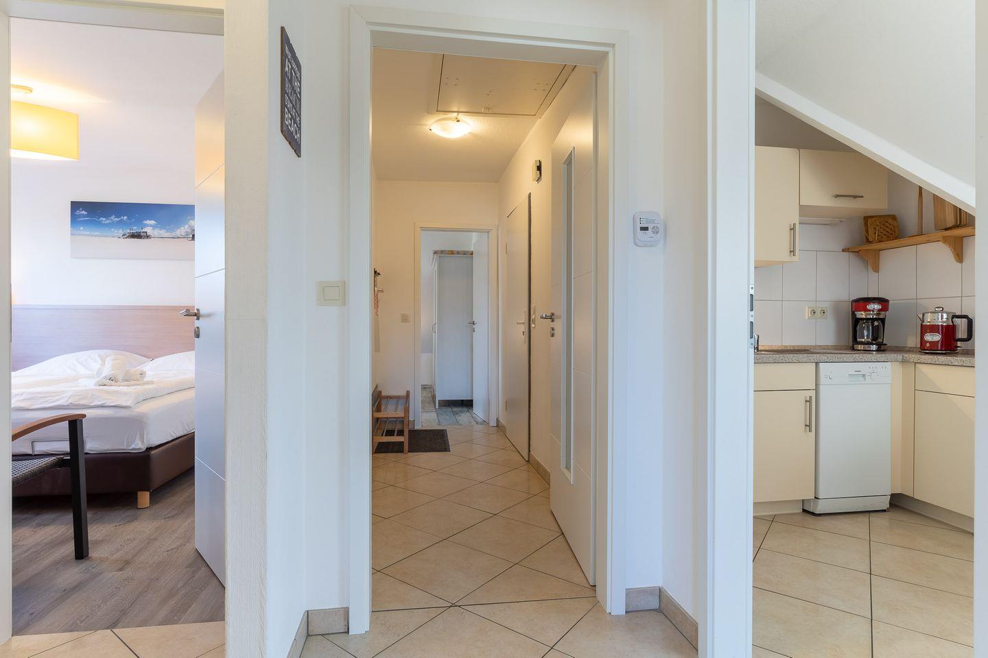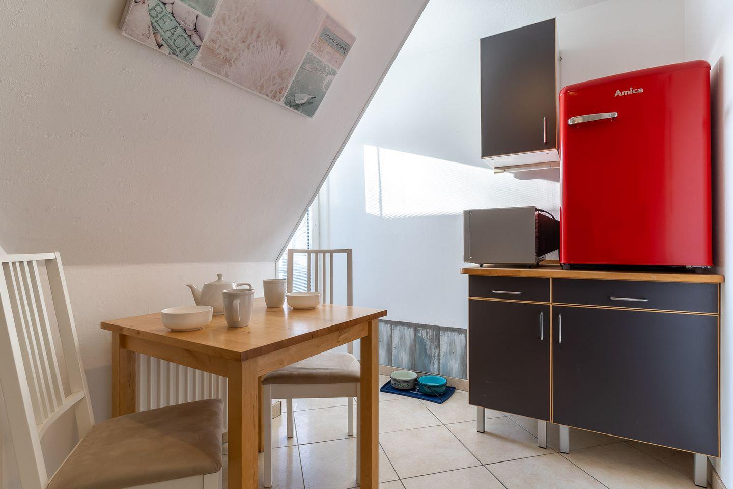 Die offene Küche lädt mit einem Ceran-Kochfeld, Backofen, Kühlschrank mit Gefriermöglichkeit und Geschirrspüler zum gemeinsamen Kochen ein. Erholung finden Sie abends in den beiden Schlafzimmern mit Doppelbetten (180x200 cm). Das Badezimmer verfügt über ein Fenster, Dusche, Waschbecken und WC.