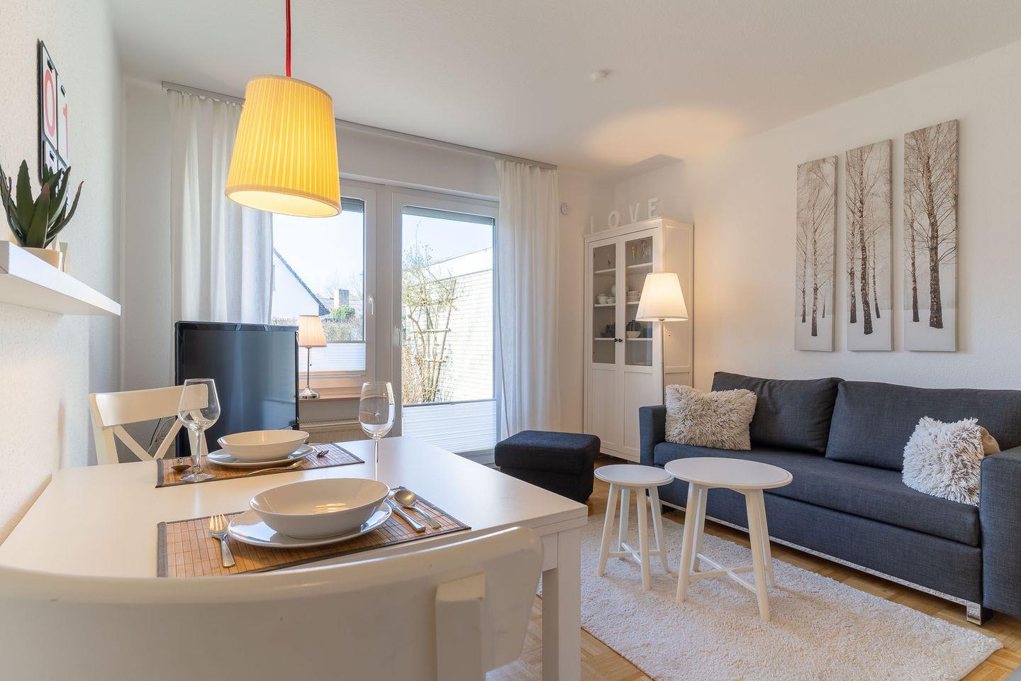 42 qm Erdgeschosswohnung in Strandnähe für 2 Personen. Moderner Wohn- und Essbereich mit Einbauküche, Schlafzimmer (1 Doppelbett), Duschbad/WC mit Fenster. Nutzung von Waschmaschine und Wäschetrockenständer im Hauswirtschaftsraum. Abstellmöglichkeiten für Fahrräder im abschließbaren Schuppen. Eigener PKW-Stellplatz auf dem Grundstück.