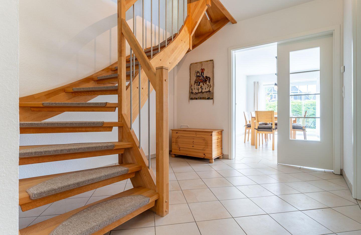Im Obergeschoss befinden sich 3 Schlafzimmer, von denen das größere einen Balkon mit einem schönen Blick auf das „Wäldchen“ hat. Die beiden weiteren Schlafzimmer verfügen jeweils über einen französischen Balkon.