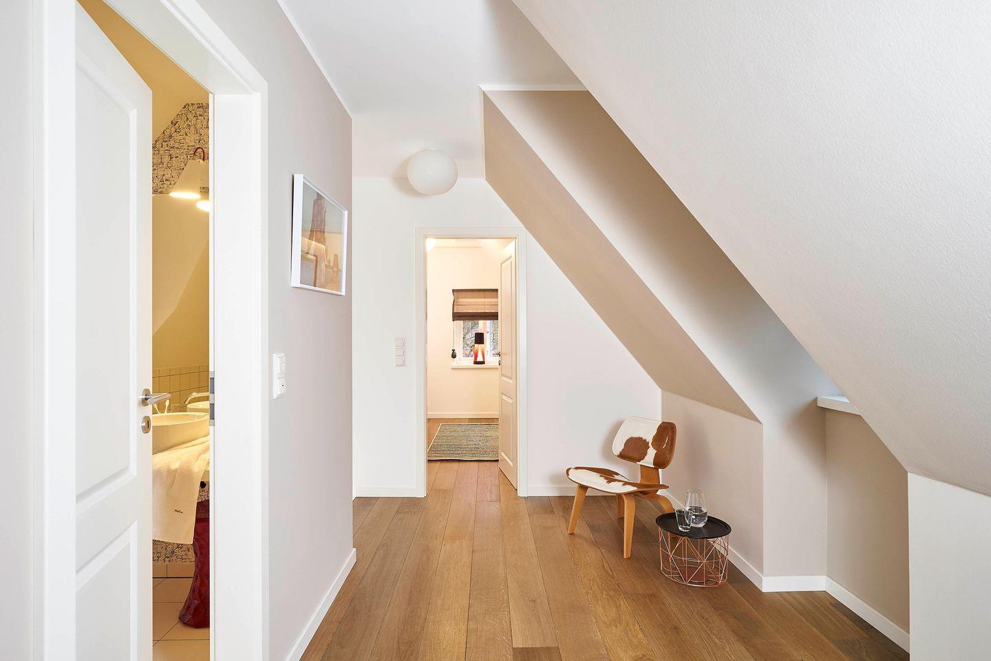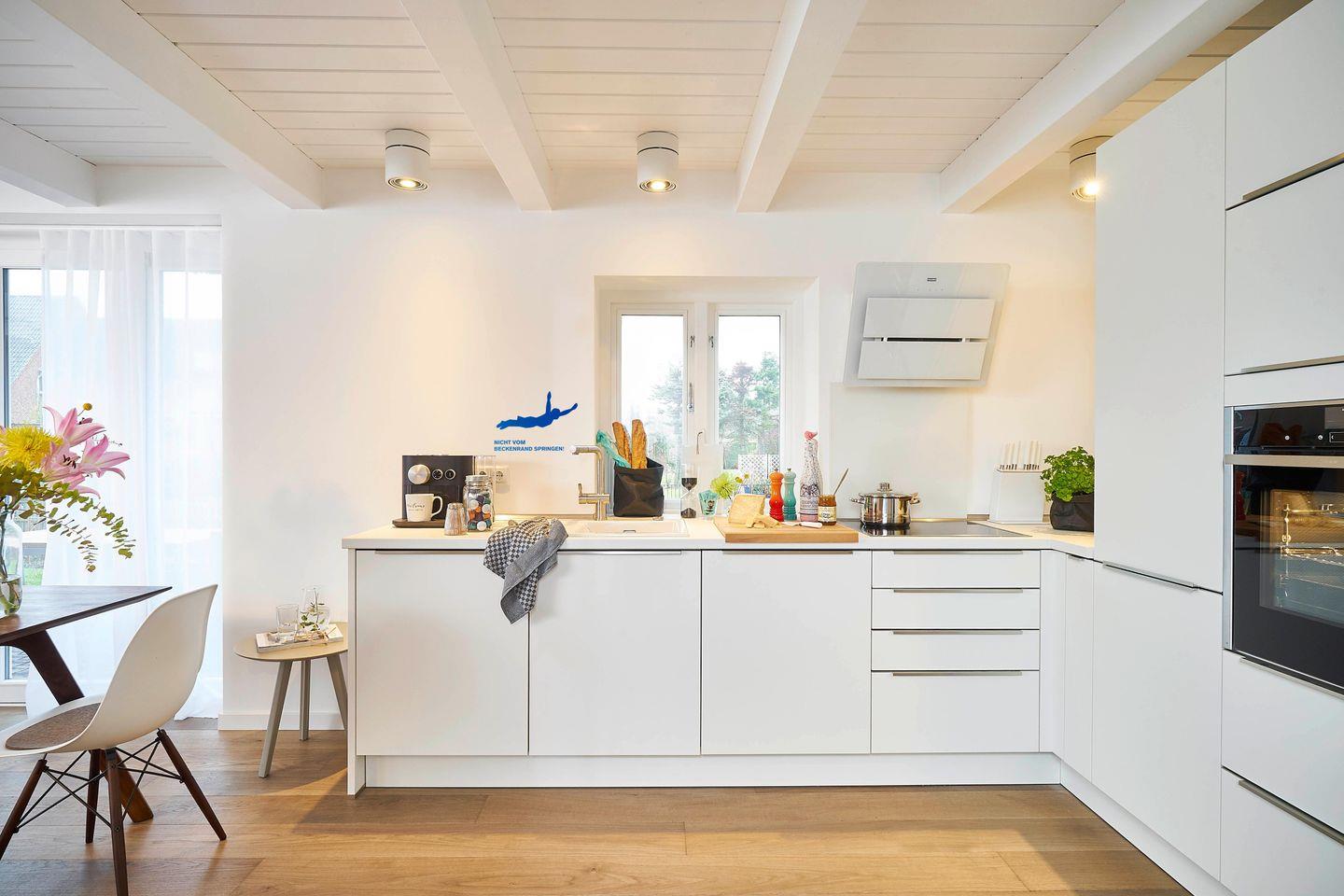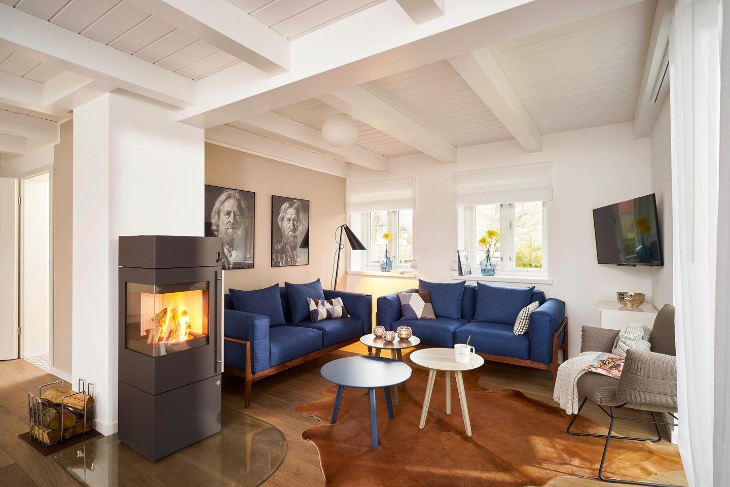 Der Wohn- und Essbereich strahlt durch den Kamin und die geschmackvolle Einrichtung Gemütlichkeit aus. Die daran angeschlossene Küche ist offen und großzügig gestaltet.