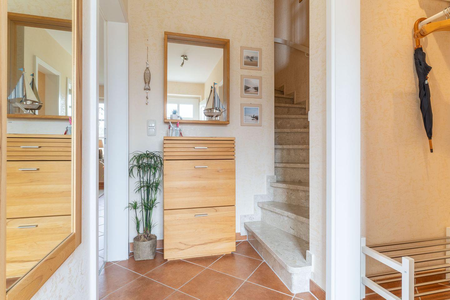 Die sonnige Terrasse mit Gartenmöbeln und Strandkorb lädt den ganzen Tag zum Verweilen ein. Ein PKW-Stellplatz steht Ihnen ebenfalls zur Verfügung.
