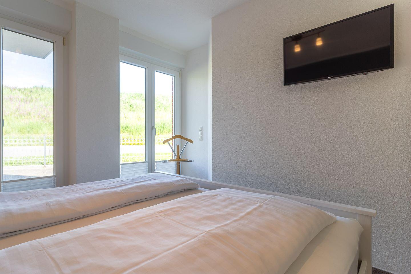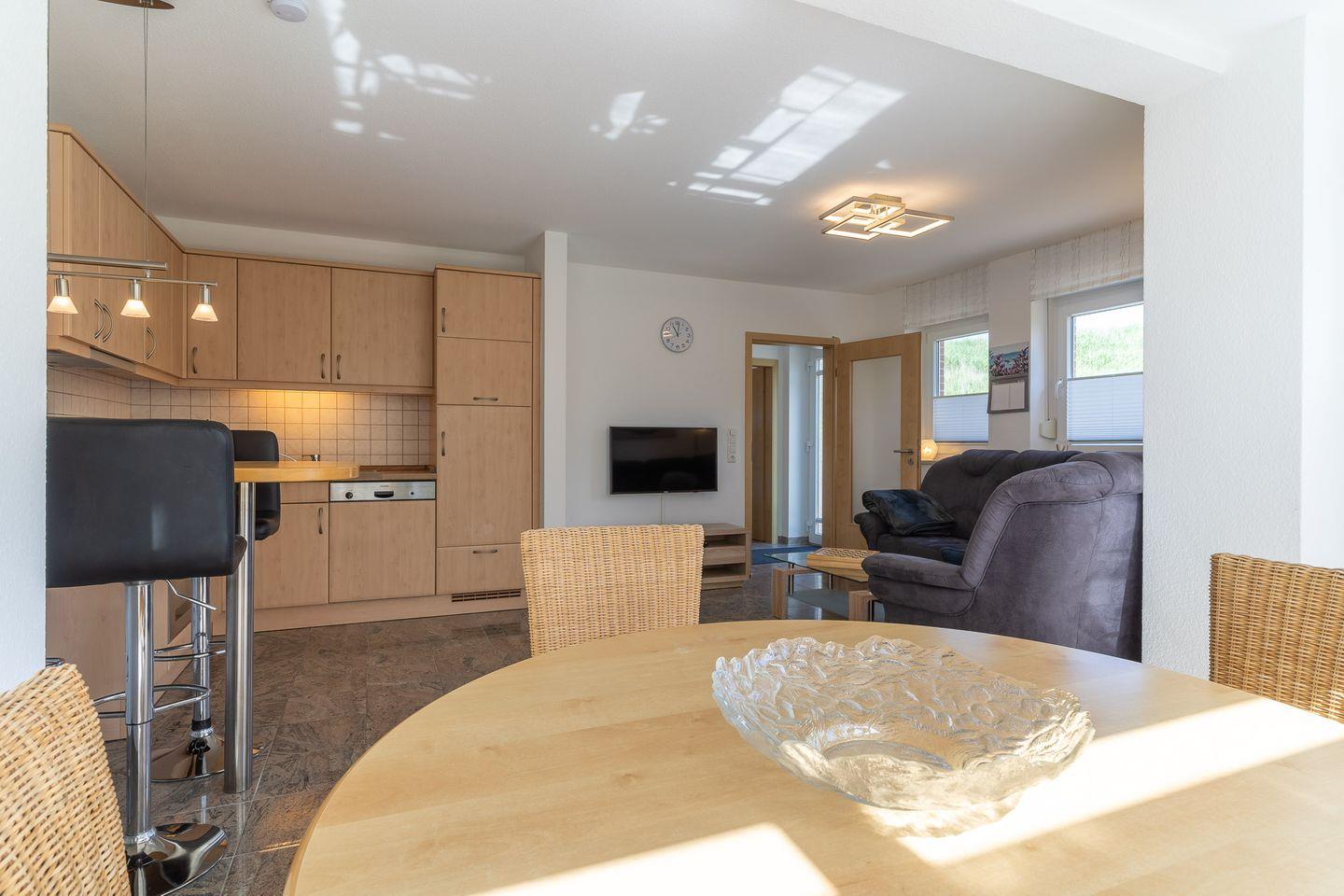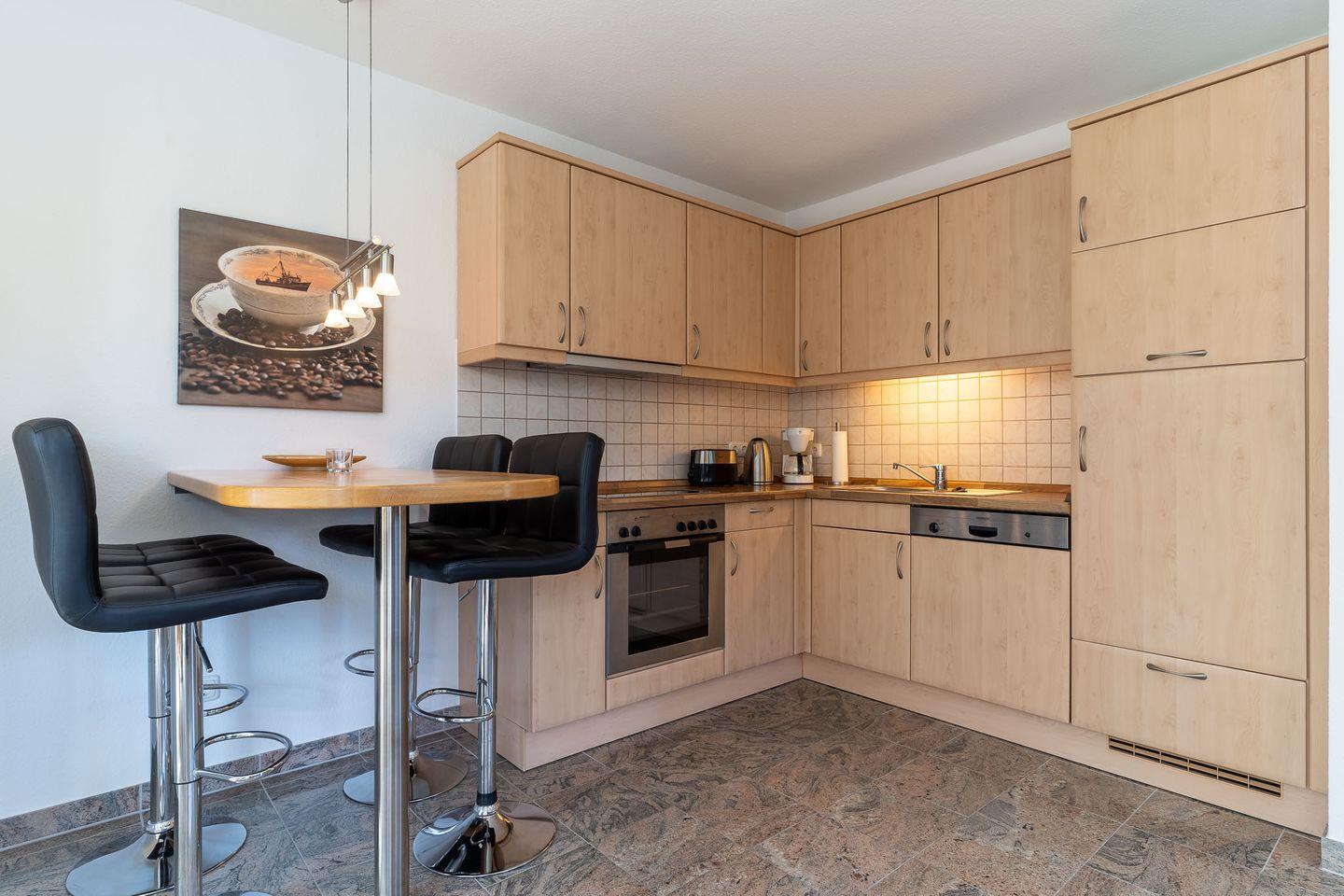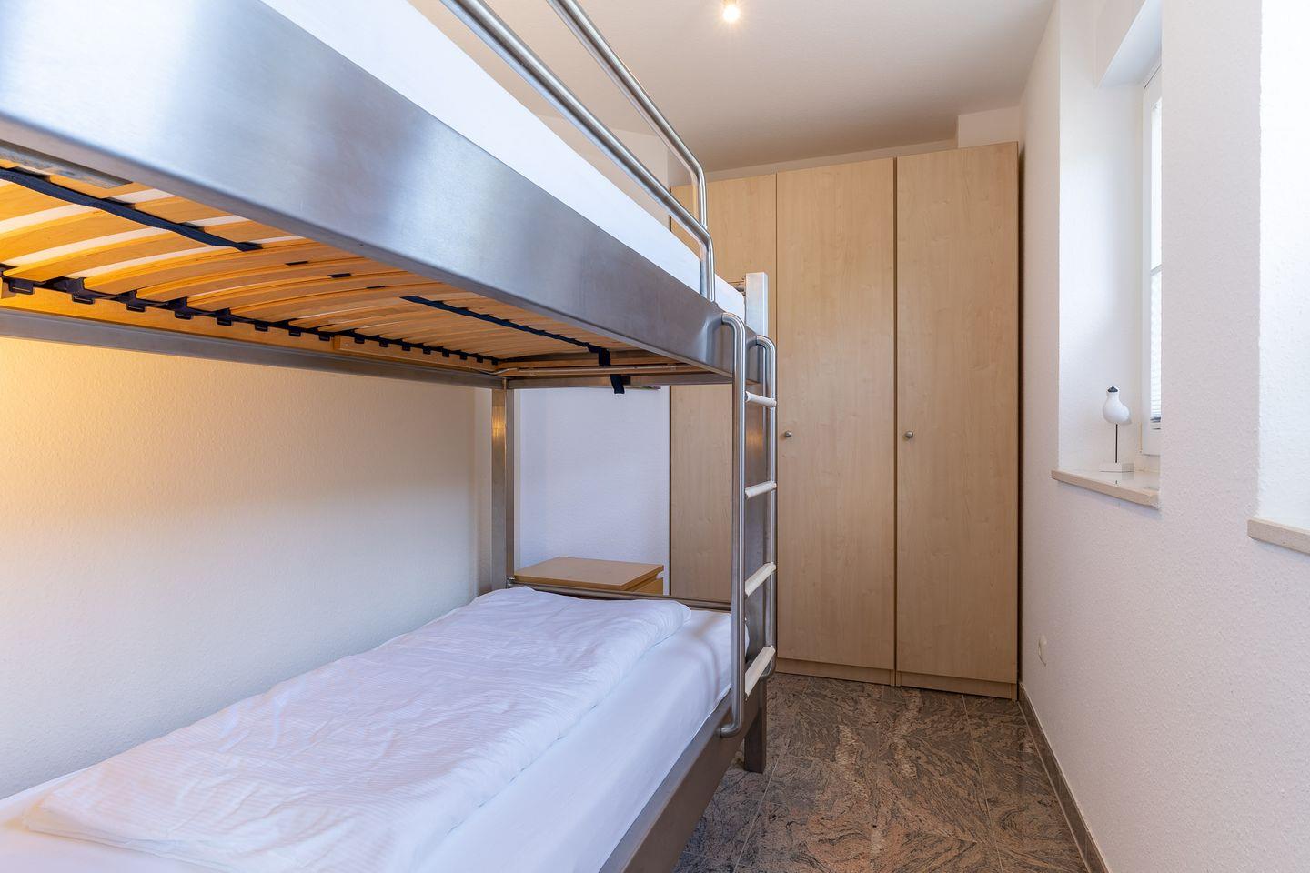 Die offene Wohnküche ist mit einem Backofen, Cerankochfeld, einer Mikrowelle, einem Geschirrspüler, einem Kühlschrank mit Gefrierfach und einem Hochtisch mit 4 Barstühlen ausgestattet. In den beiden Schlafzimmern finden Sie ein großes Doppelbett (2x 90x200cm), einen Kleiderschrank sowie einen Fernseher. Hier ist auch der Zugang zur zweiten Terrasse, die nach Nordwesten ausgerichtet ist. Im zweiten Schlafzimmer steht ein Etagenbett (je 80x200cm) sowie ein Einbaukleiderschrank.