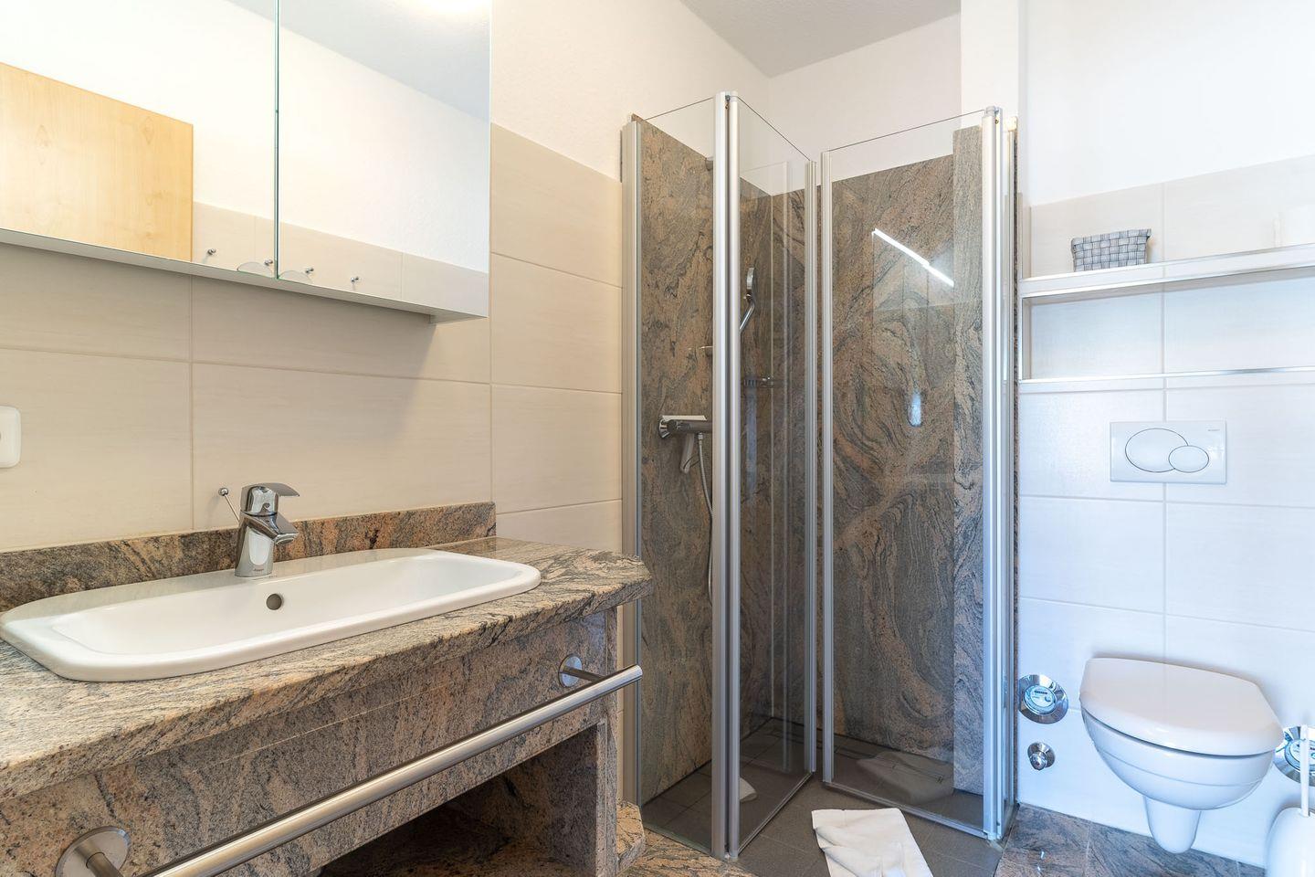 Das Duschbad verfügt über eine bodengleiche Dusche, ein WC und einen Föhn. Der möblierte Flur mit Spiegel und Haushaltsschrank im Eingangsbereich bietet zusätzlichen Stauraum.