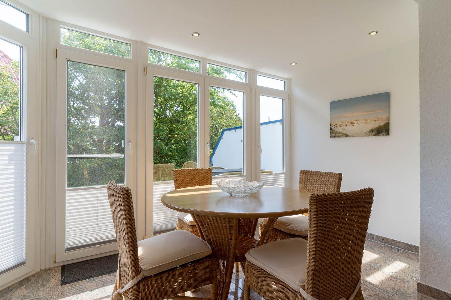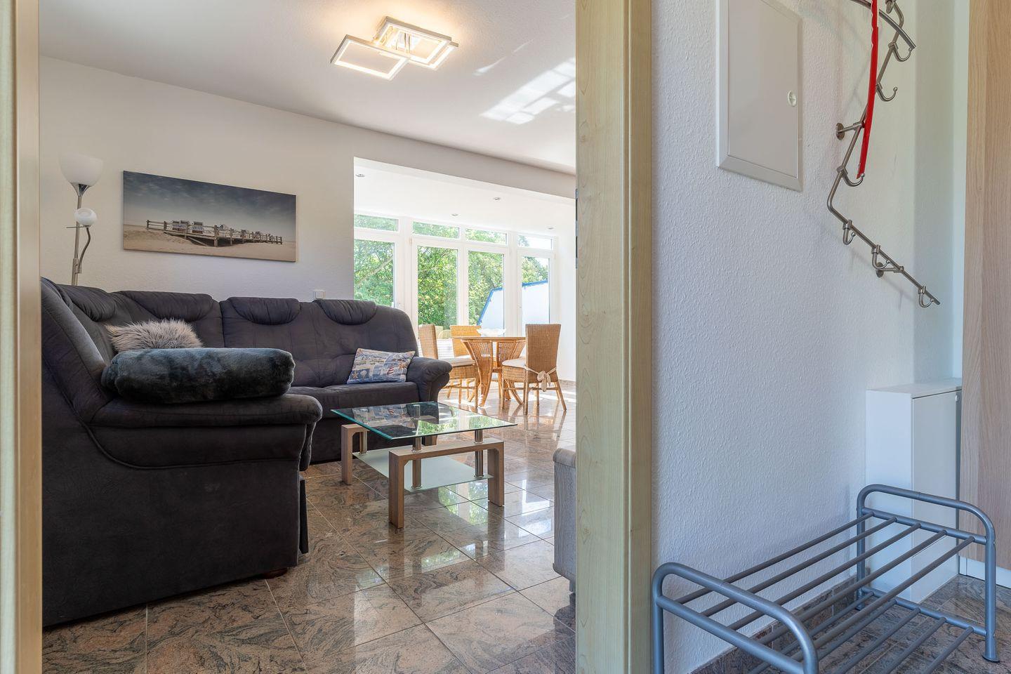 Das zentrale Wohnzimmer ist gemütlich eingerichtet und verfügt über zwei Sofas, eines für 4 Personen und ein weiteres Sofa für 2-3 Personen, sowie einen bequemen Sessel. Ein großer Fernseher mit Satellitenempfang und ein geräumiger Esstisch machen den Wohnbereich perfekt. Vom Wohnzimmer mit den Panoramafenstern aus haben Sie direkten Zugang zur möblierten Terrasse mit Tisch, Stühle sowie zwei Liegen, die nach Südosten ausgerichtet ist und einen Blick in die Wiesen ermöglicht.