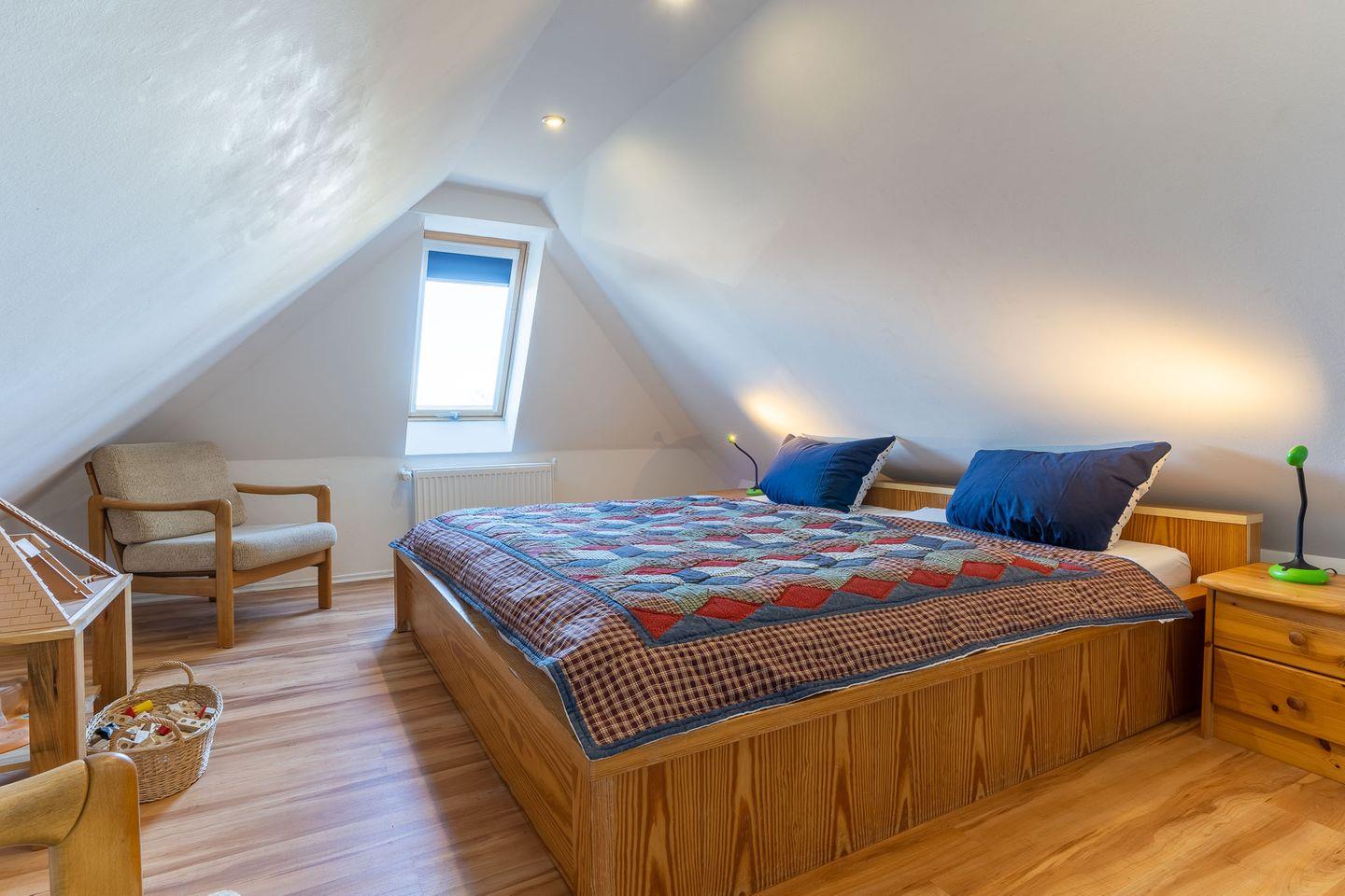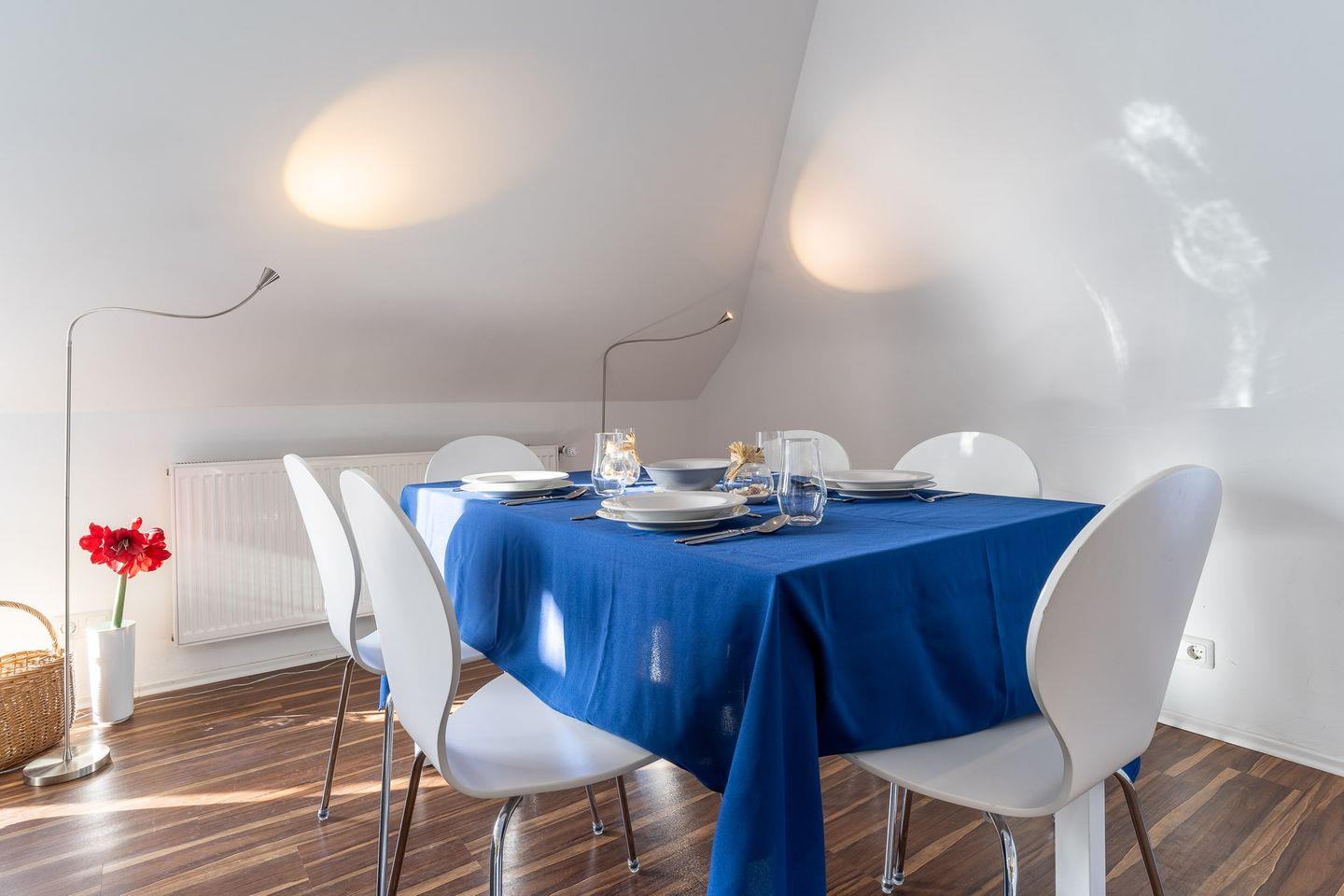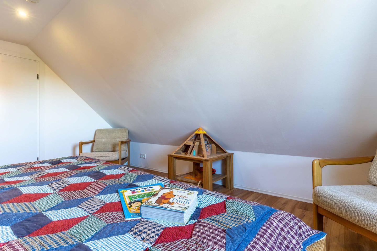 Willkommen in dieser modernen und geräumigen Ferienwohnung für vier Personen! Die Wohnung erstreckt sich über zwei Etagen und bietet einen hellen Wohnbereich mit offener Küche und zwei Balkonen, zwei geräumige Schlafzimmer, ein Badezimmer mit Badewanne und ein Gäste-Bad mit Dusche. Die voll ausgestattete Küche verfügt über alle wichtigen Geräte wie Geschirrspüler, Mikrowelle, Toaster und Kaffeemaschine. Der Wohnbereich ist mit einem Flachbildfernseher und einer Radioanlage ausgestattet und bietet Zugang zu zwei Balkonen, auf denen Sie gemütlich entspannen können. Die Wohnung hat eine Fußbodenheizung in Nussbaumoptik und ist mit hochwertigen Möbeln eingerichtet. Das Schlafzimmer auf der Hauptetage verfügt über ein großes Doppelbett und Zugang zum Balkon auf der Westseite. Das Schlafzimmer auf dem Spitzboden ist über eine kleine Treppe erreichbar und verfügt ebenfalls über ein Doppelbett. Ein eigener PKW-Stellplatz und ein abschließbarer Fahrradschuppen sind direkt vor dem Haus vorhanden. Bettwäsche und Handtücher sind im Preis inbegriffen. Die Wohnung ist tierfrei und rauchfrei. Nutzen Sie auch gerne die Waschmaschine und den Trockner, die mit den zwei anderen Wohnungen geteilt werden und über einen Euromünzenautomaten bedient werden können. Entdecken Sie die Schönheit der Umgebung und verbringen Sie hier einen unvergesslichen Urlaub!