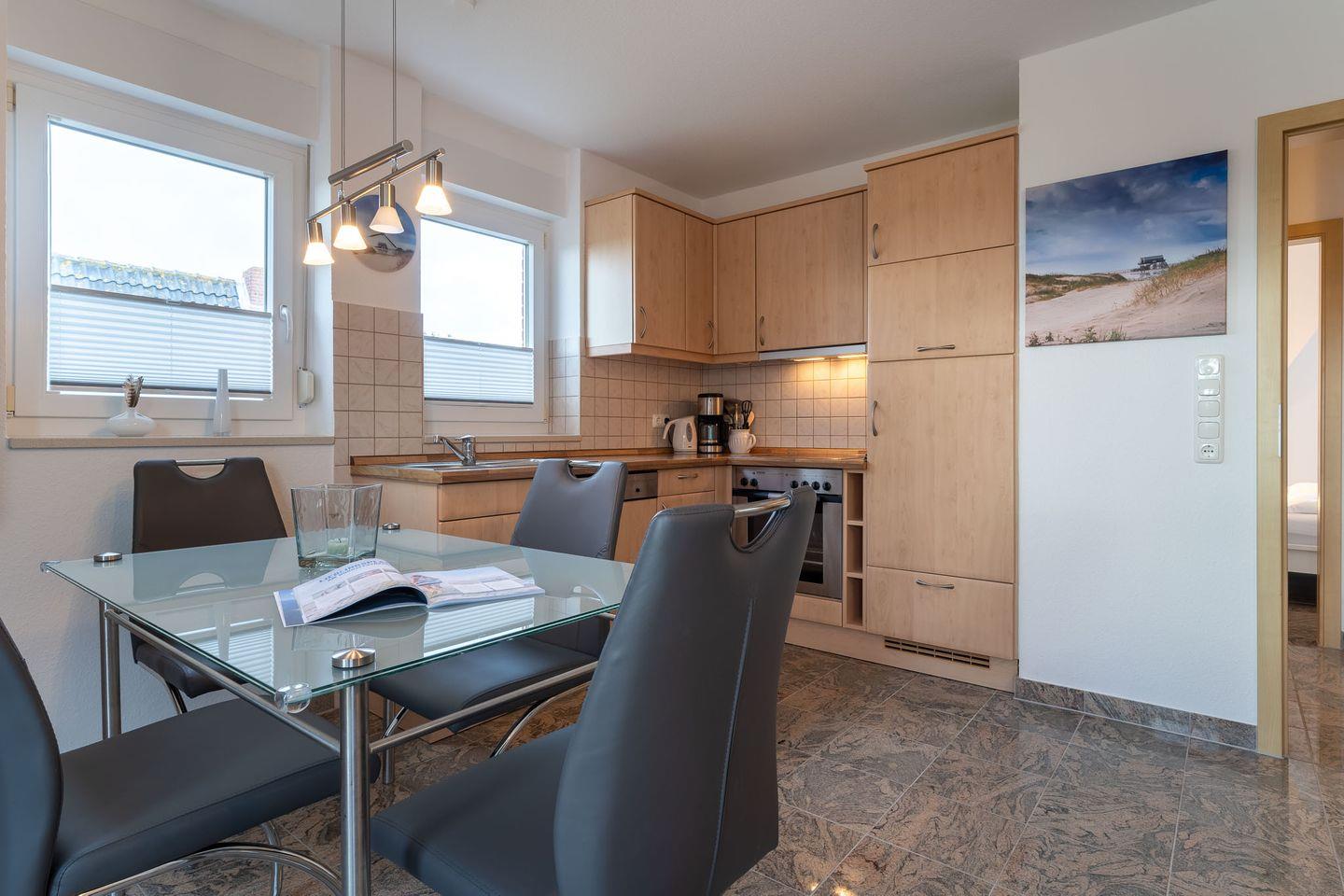 Die offene Wohnküche ist komplett ausgestattet und bietet alles, was Sie für eine angenehme Selbstversorgung benötigen. Sie verfügt über einen Backofen mit Cerankochfeld, eine Mikrowelle, einen Geschirrspüler und einen Kühlschrank mit Gefrierfach. In den beiden Schlafzimmern finden Sie ein Doppelbett (2x80x200cm im Obergeschoss) und ein großes Doppelbett (2x90x200cm im Dachgeschoss) sowie Kleiderschränke und Zugang zu zweien der drei Balkone. Der Balkon im Dachgeschoss bietet Ihnen eine herrliche Aussicht und ist nach Nordwesten ausgerichtet. Hier können Sie die Abendsonne genießen.