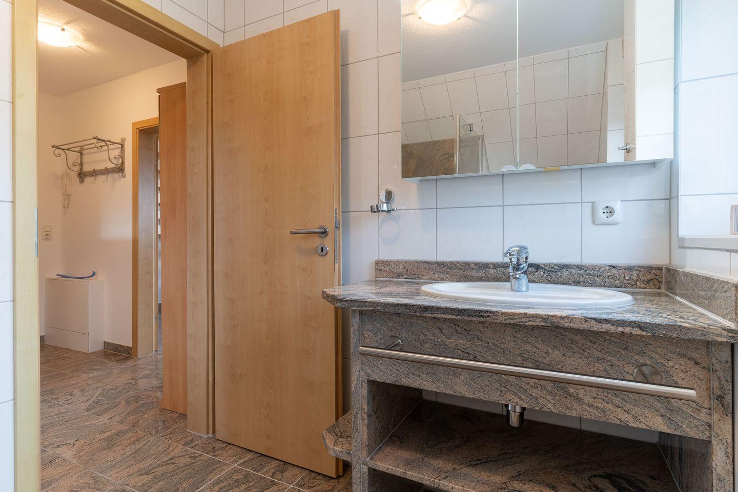 Im Obergeschoss befindet sich auch das Badezimmer mit einer Dusche und einem bodennahen Einstieg sowie einem WC und einem Föhn. Ein kleines WC mit Waschbecken befindet sich ebenfalls im Dachgeschoss und bietet Ihnen Zugang zum dritten Balkon der nach Nordwesten ausgerichtet ist.