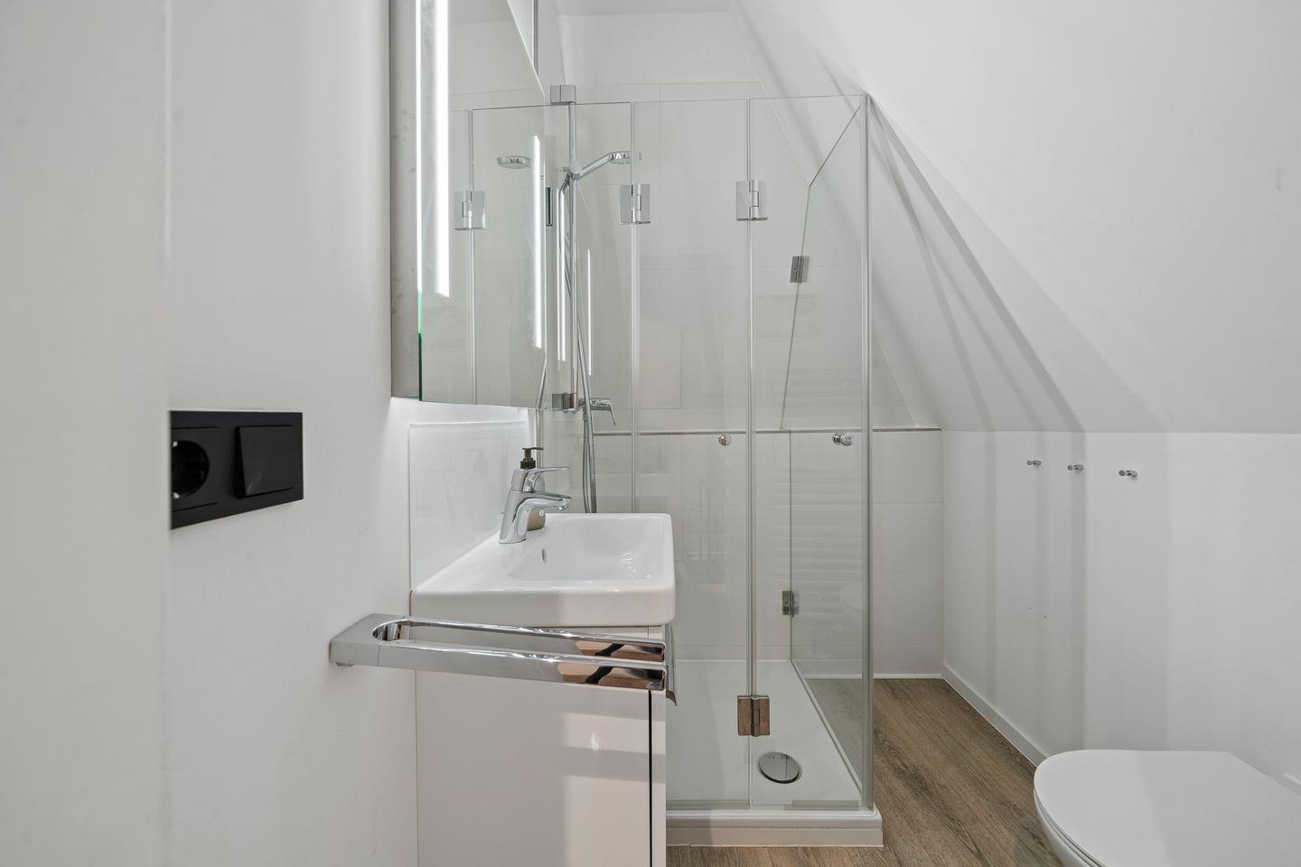 Das moderne Bad mit Fenster verfügt über eine bodentiefe Regendusche, Handtuchheizung, Waschbecken und WC.