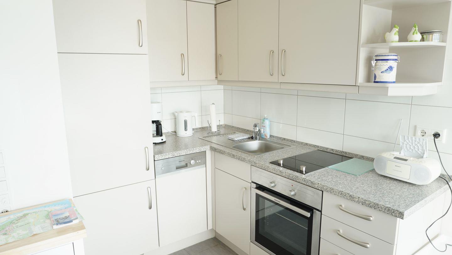 und vollausgestattete offene Küche mit Geschirrspülmaschine, Ceranfeld mit 2 Kochfeldern, Backofen