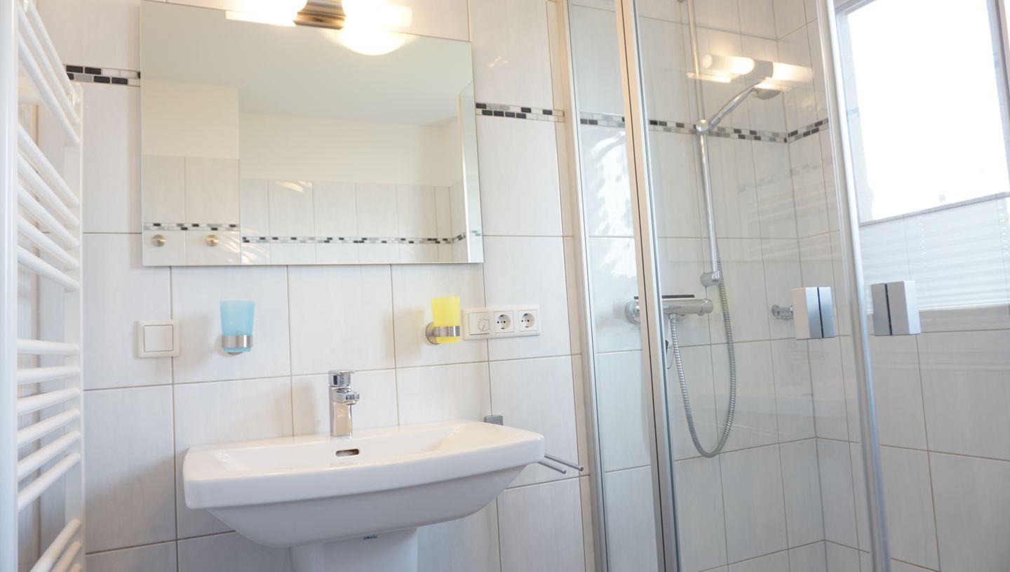Duschbad mit niedriger Duschwanne und Handtuchtrockner