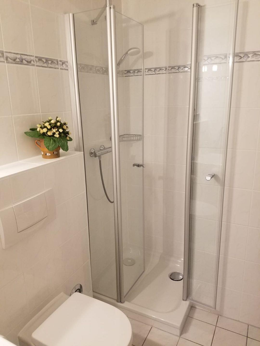 Duschbad mit Föhn und Heizkörper mit Handtuchhalter
