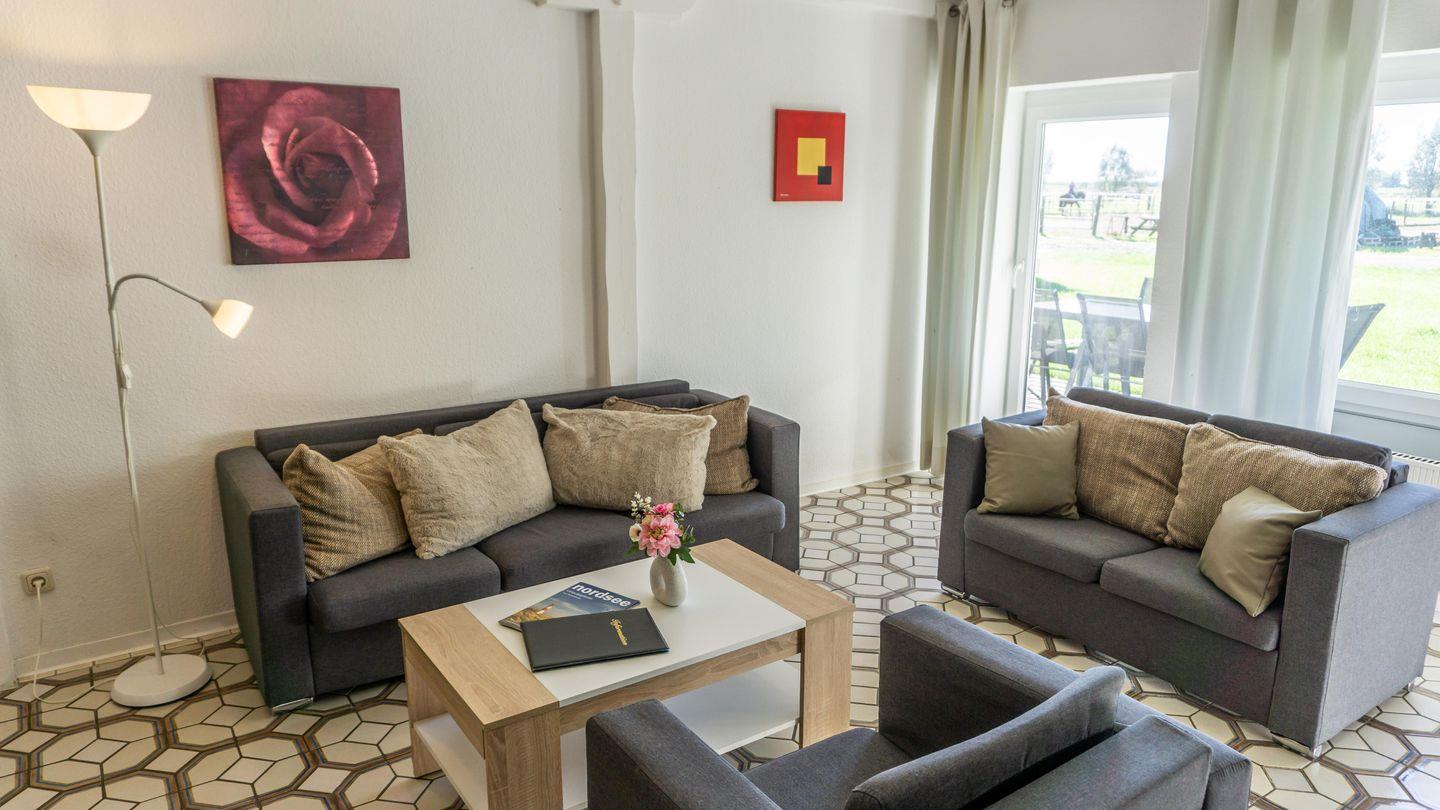 Der ruhig am Ortsrand gelegene Reiterhof verfügt über 7 Ferienappartements in unterschiedlicher Größe für bis zu 6 Personen. Die Wohnungen verfügen über eine zweckmäßige Einrichtung, teilweise mit Geschirrspülmaschine. Die Erdgeschosswohnungen bieten jeweils eine eigene kleine Terrasse. Alle Ferienwohnungen befinden sich direkt auf dem Hof. Von den Wohnungen sieht man auf die Pferdekoppeln und den Deich.