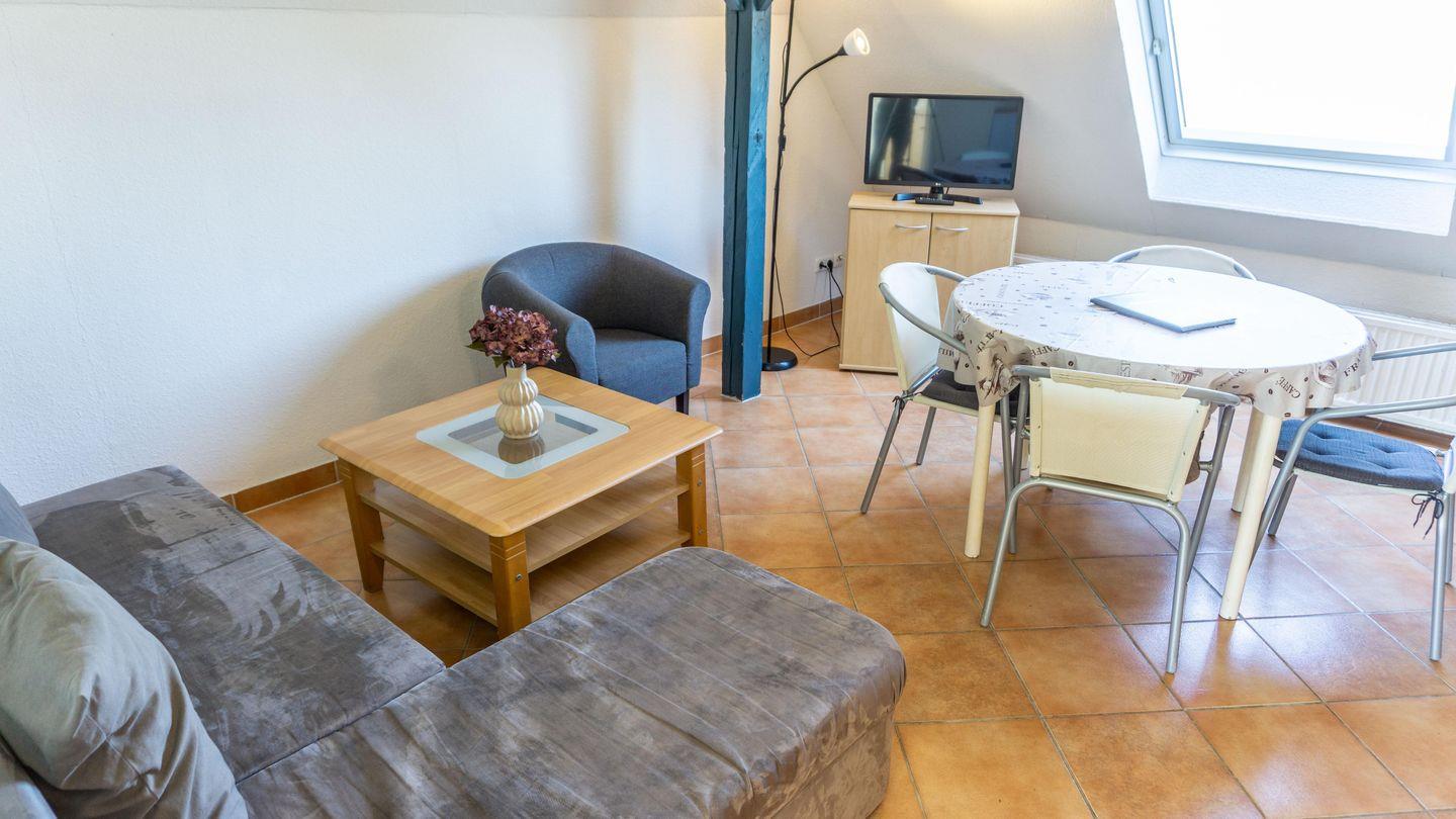 Wohnraum mit Essbereich, Sat-TV und offene Küche, Geschirrspülmaschine