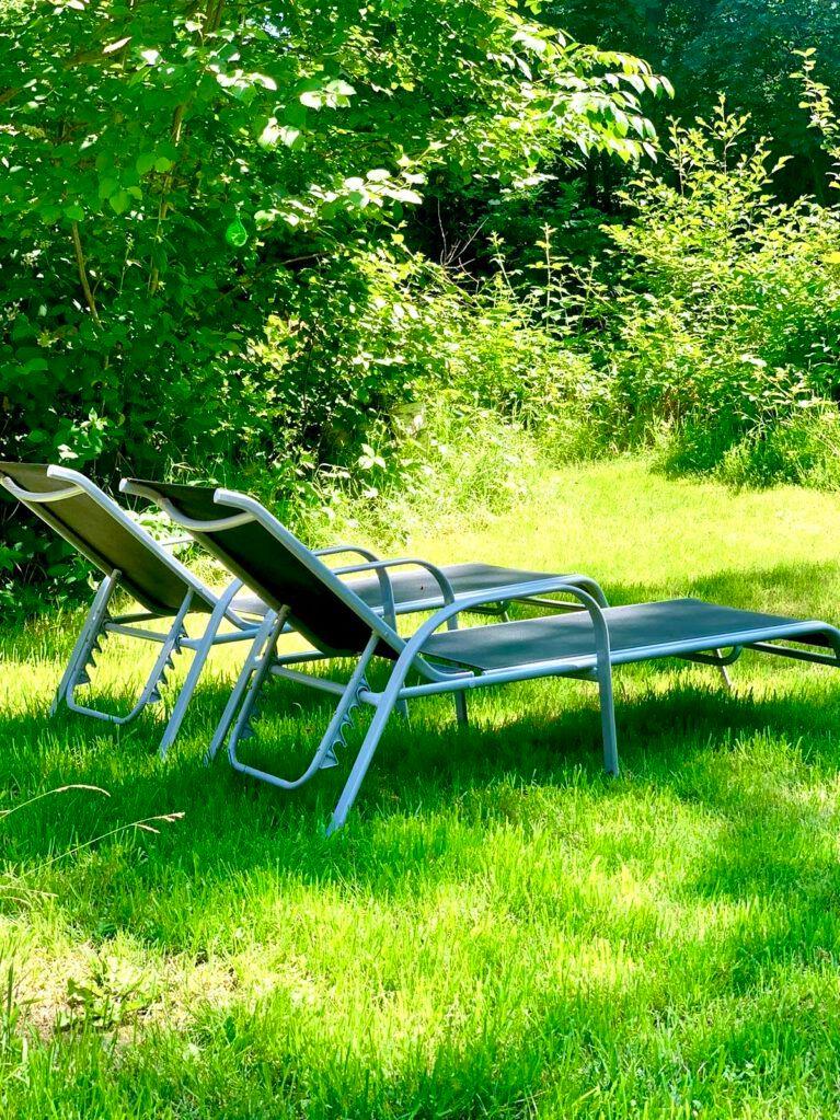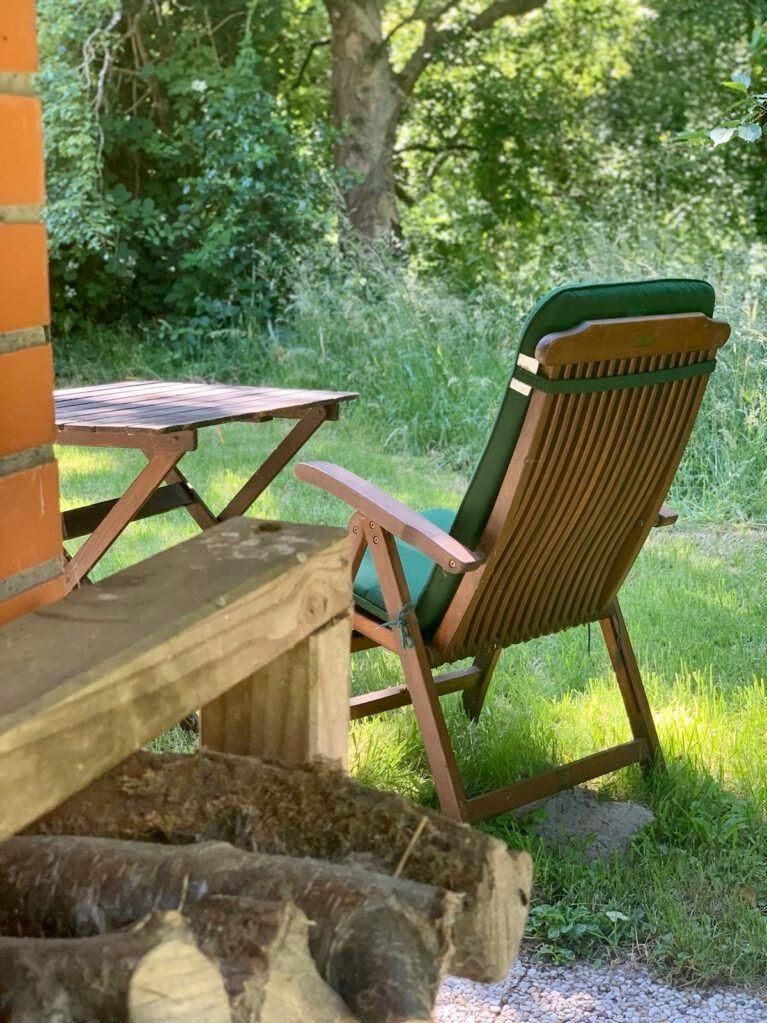 Terrasse mit Gartenmöbeln, direkter Zugang in den Garten. Sitzmöglichkeit am Bach und kleiner Tümpel im Garten.