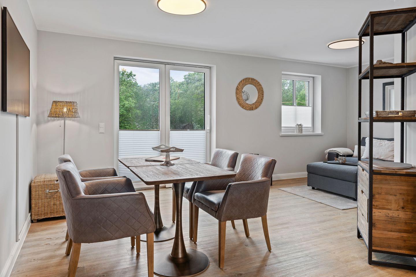 Diese moderne und stilvoll eingerichtete Wohnung bietet auf 60 m² genügend Platz für bis zu drei Personen. Der offene Wohnbereich verbindet Küche und Wohnzimmer harmonisch und ist der perfekte Ort, um sich nach einem erlebnisreichen Tag zu entspannen. Genießen Sie die Zeit bei einem gemütlichen Abendessen, das Sie in der voll ausgestatteten Küche zubereiten können. Hier stehen Ihnen moderne Geräte wie ein Cerankochfeld, Backofen, Kühlschrank mit Gefrierfach, Geschirrspüler, sowie kleine Küchengeräte wie Wasserkocher und Kaffeemaschine zur Verfügung.