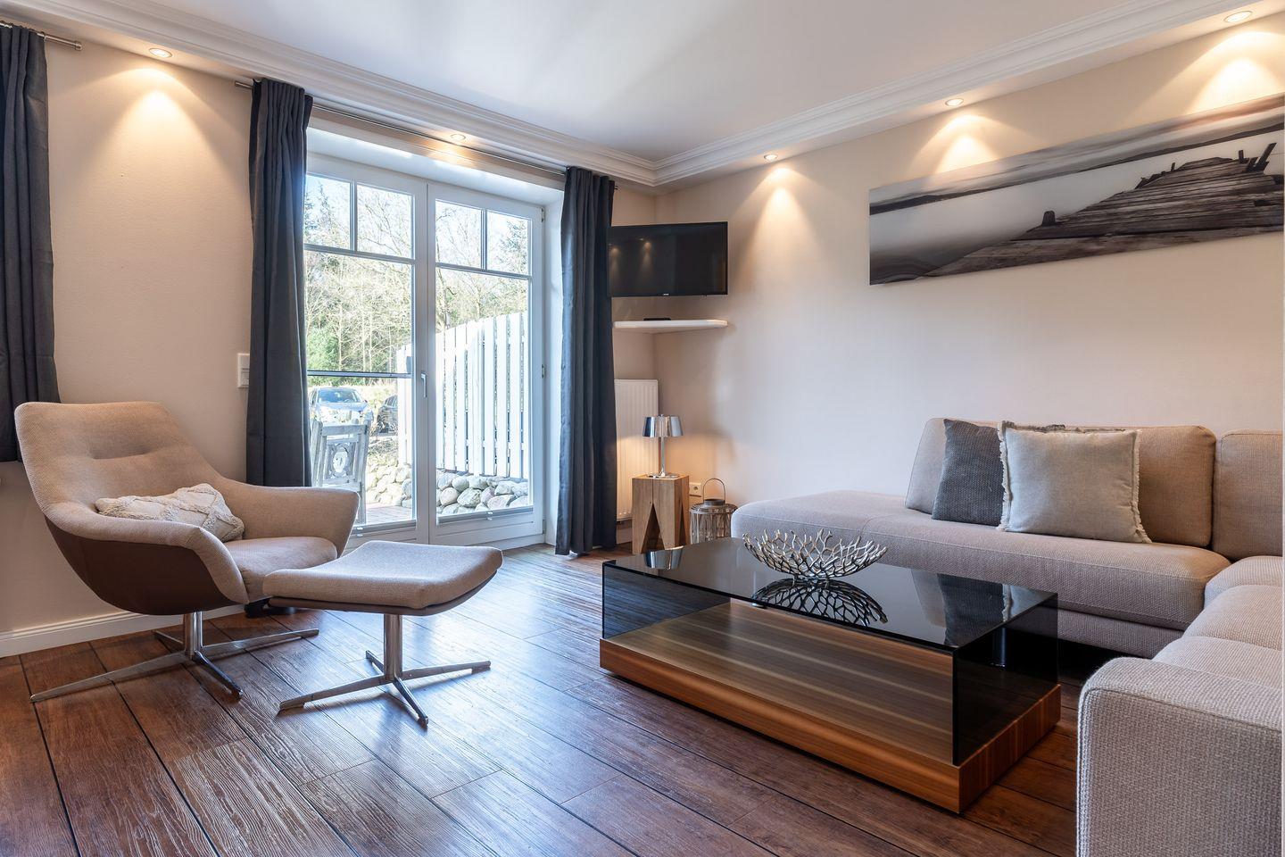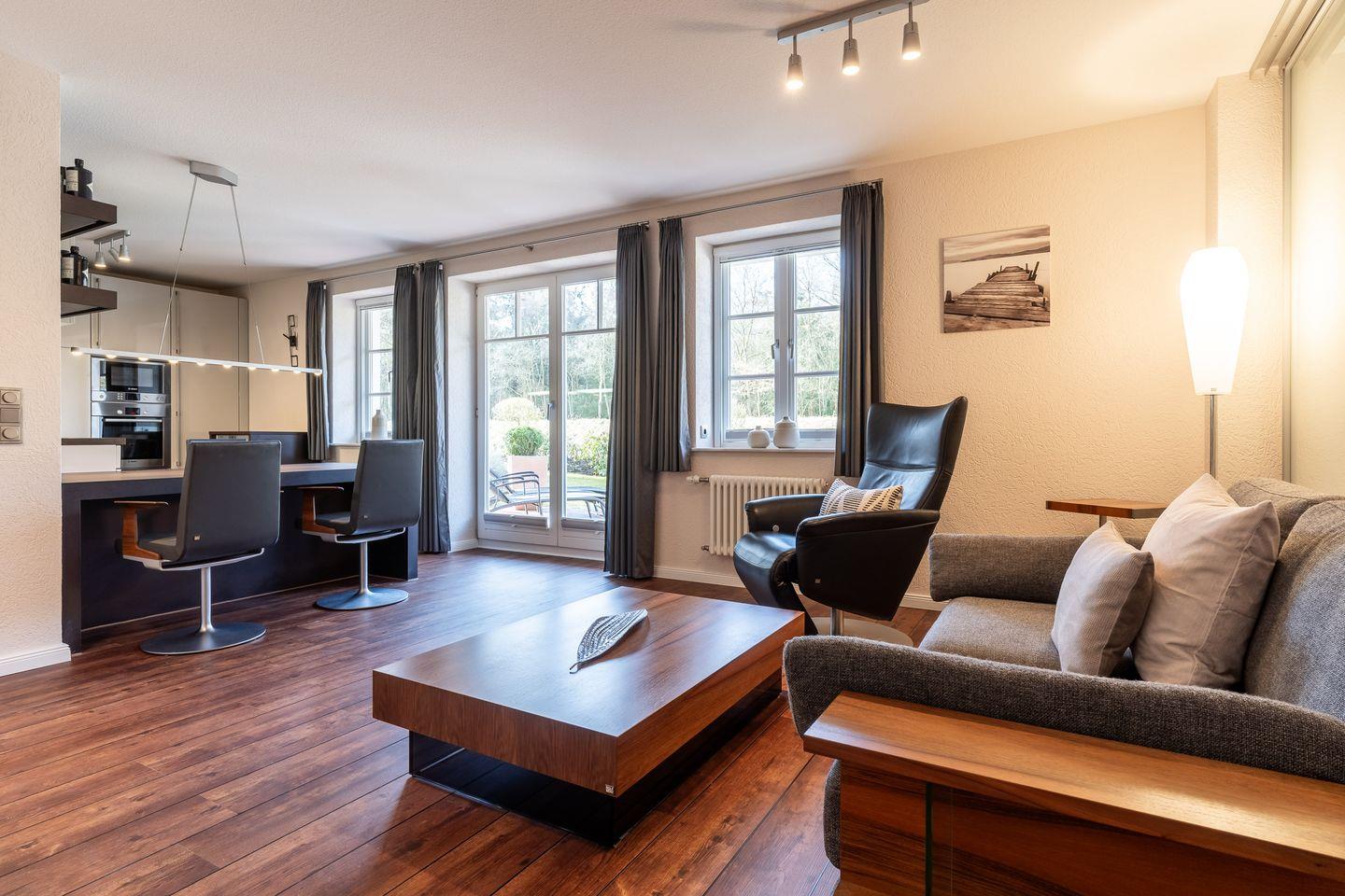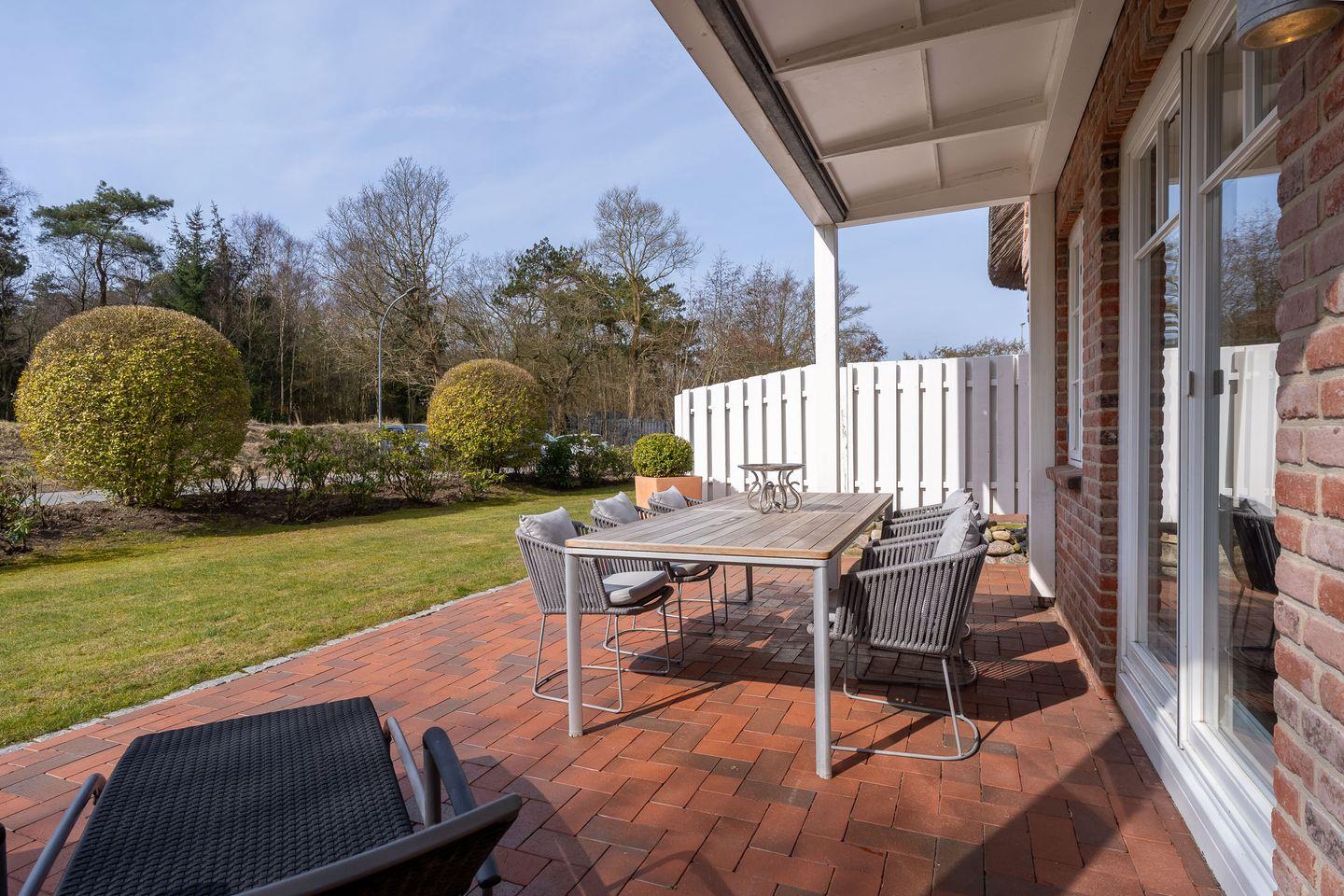 Von hier aus gelangen Sie auch auf die privaten Terrassen, wo wunderschöne Gartenmöbel und ein Strandkorb bereitstehen. Genießen Sie die frische Luft und die entspannende Atmosphäre – perfekt, um mit einem guten Buch zu entspannen und wertvolle Erinnerungen zu schaffen.
