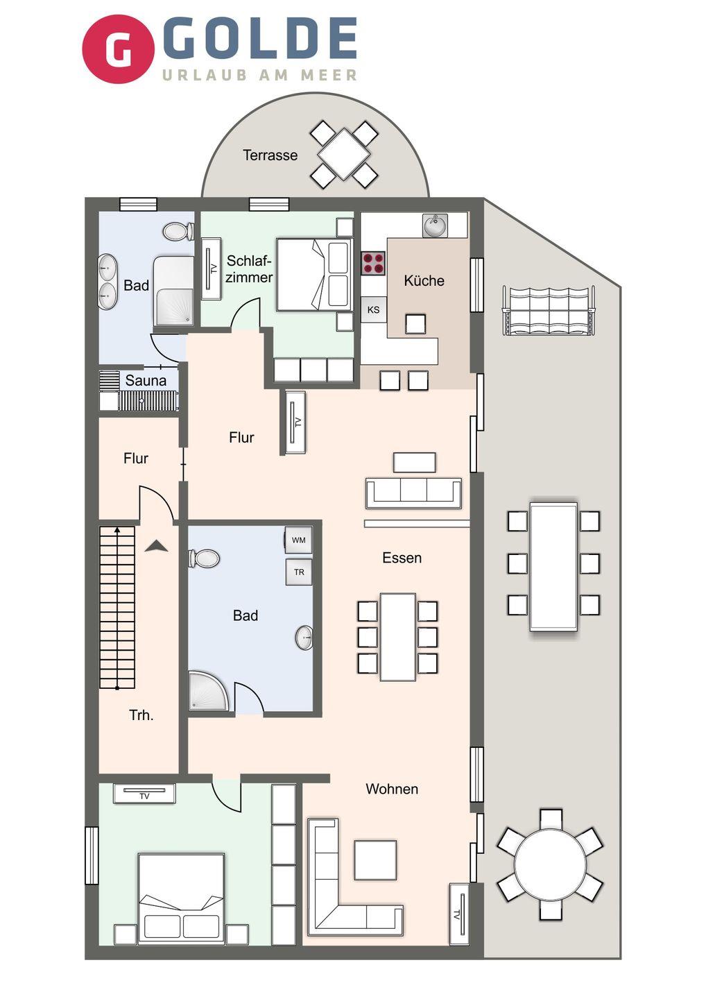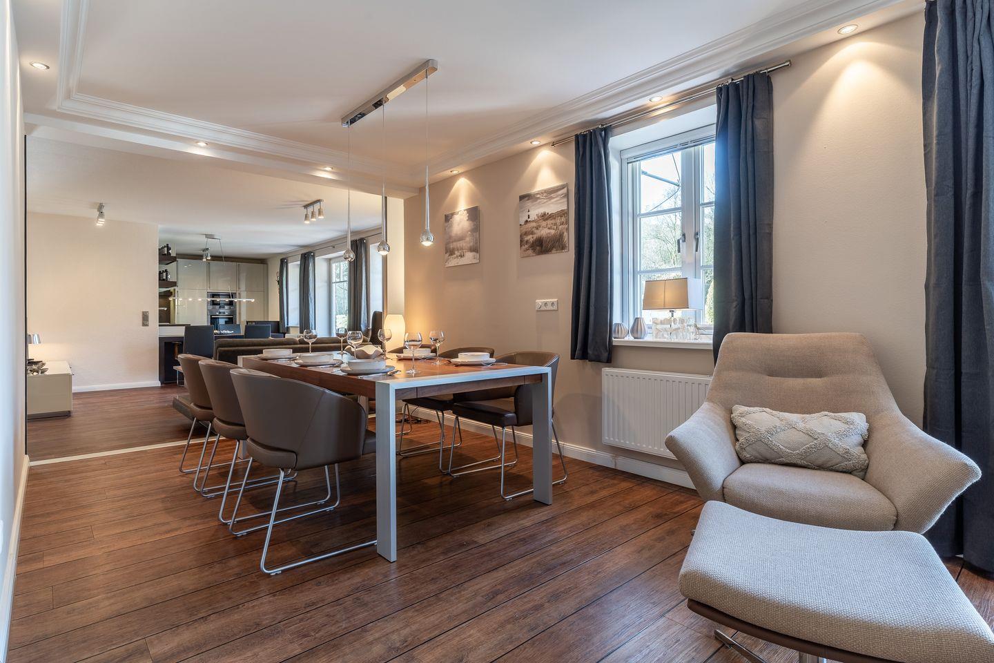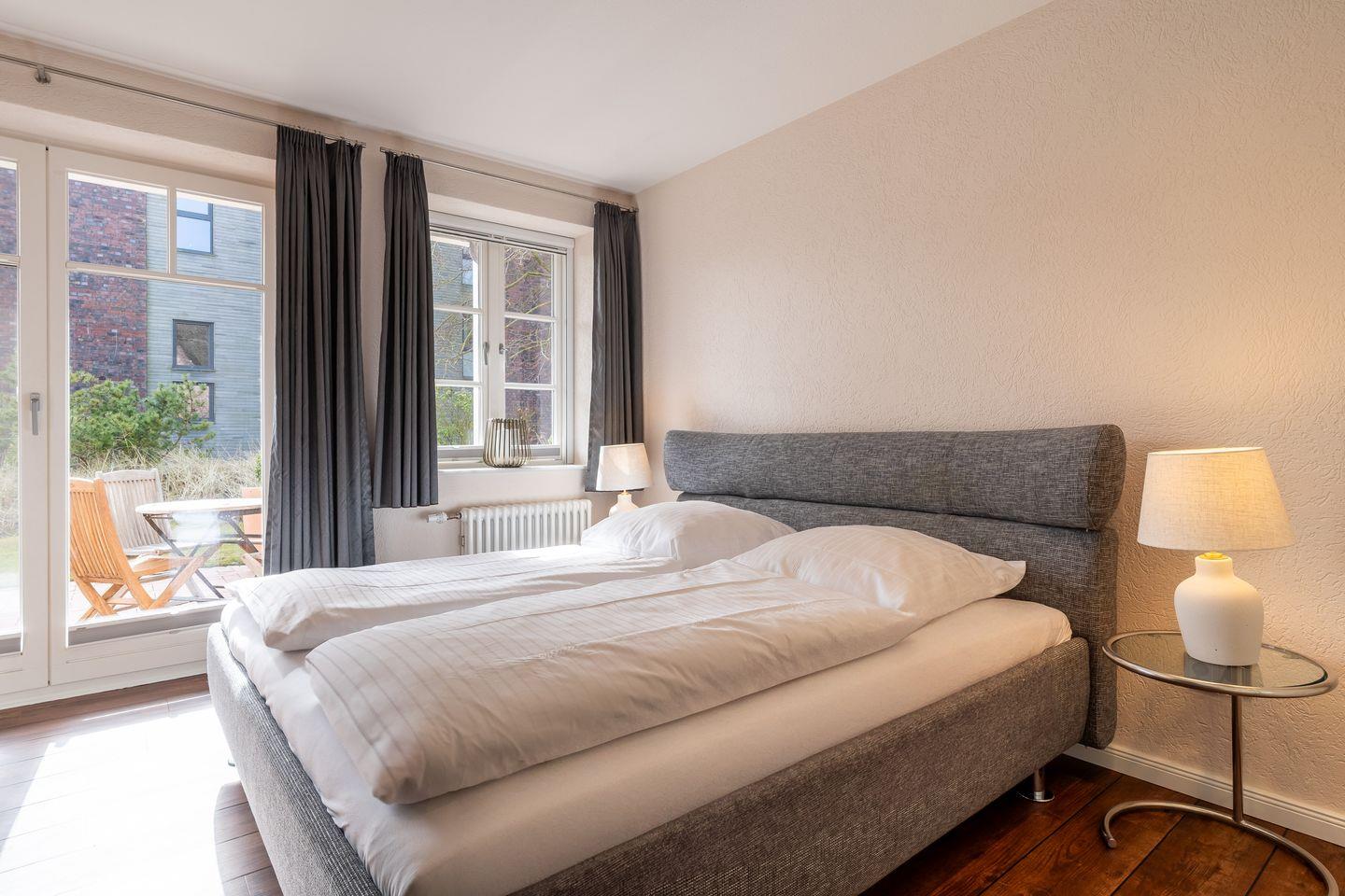 Von hier aus gelangen Sie auch auf die privaten Terrassen, wo wunderschöne Gartenmöbel und ein Strandkorb bereitstehen. Genießen Sie die frische Luft und die entspannende Atmosphäre – perfekt, um mit einem guten Buch zu entspannen und wertvolle Erinnerungen zu schaffen.