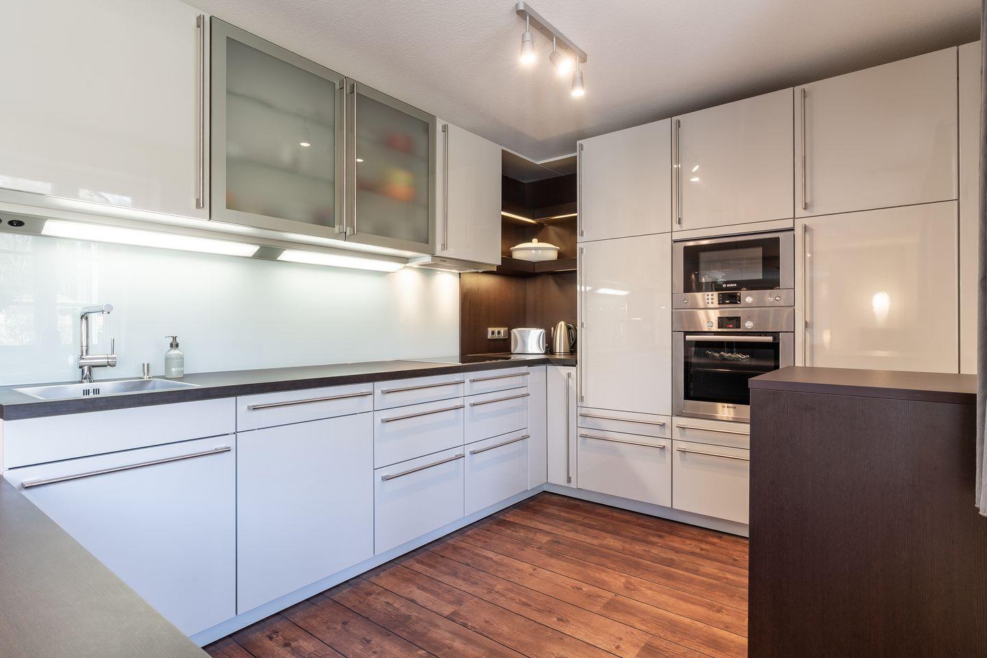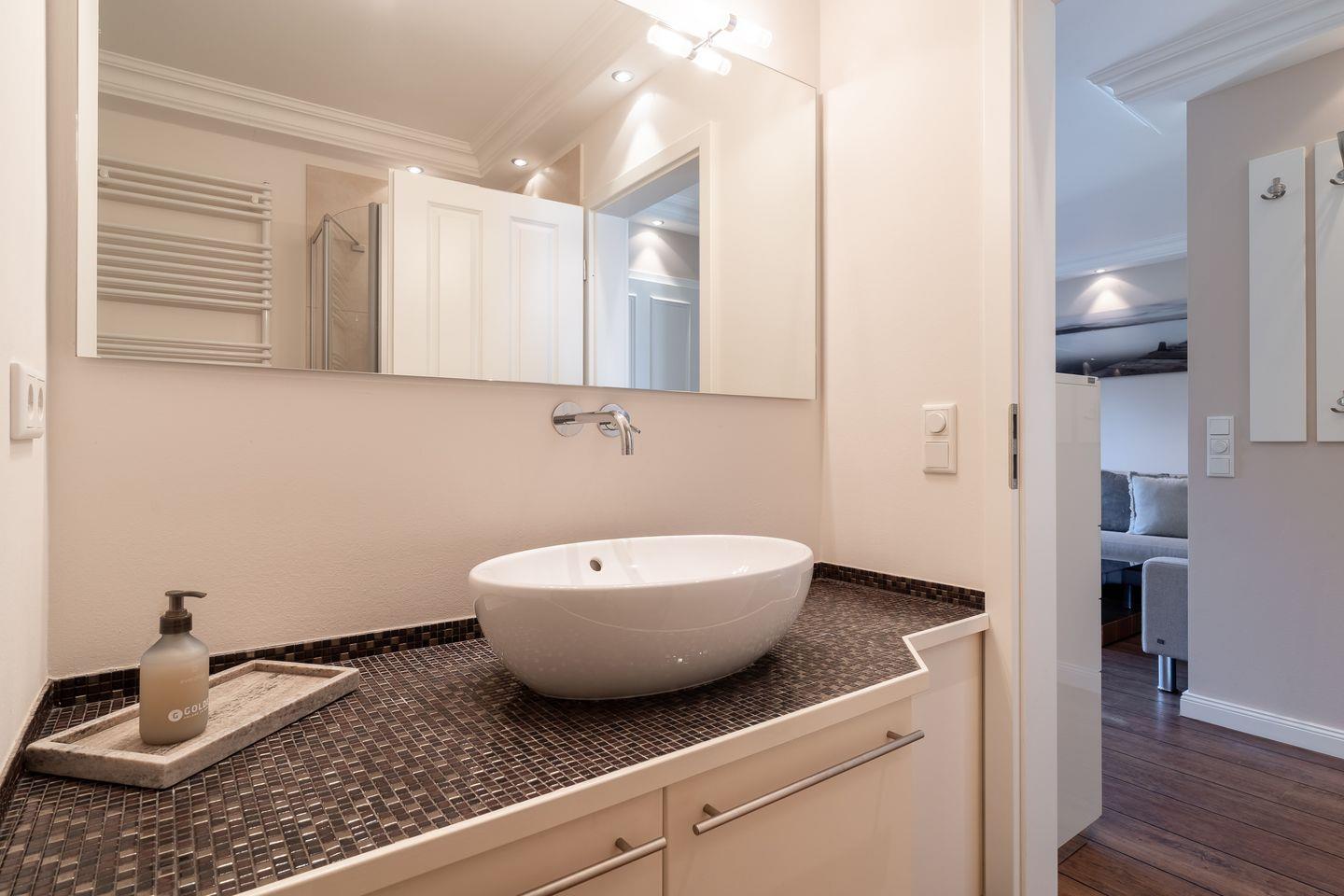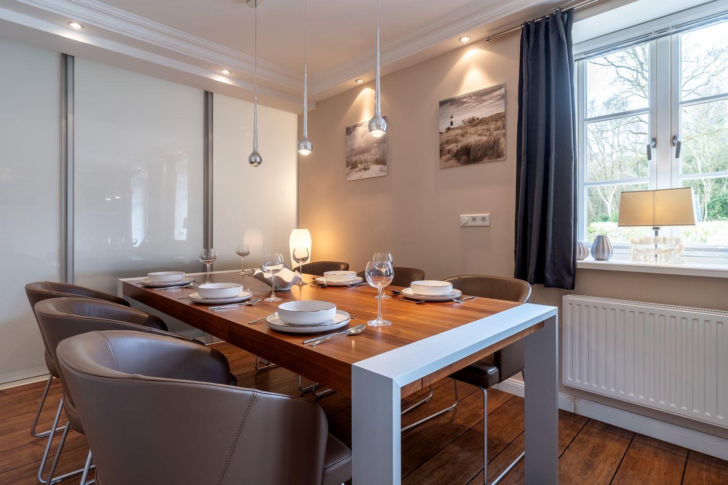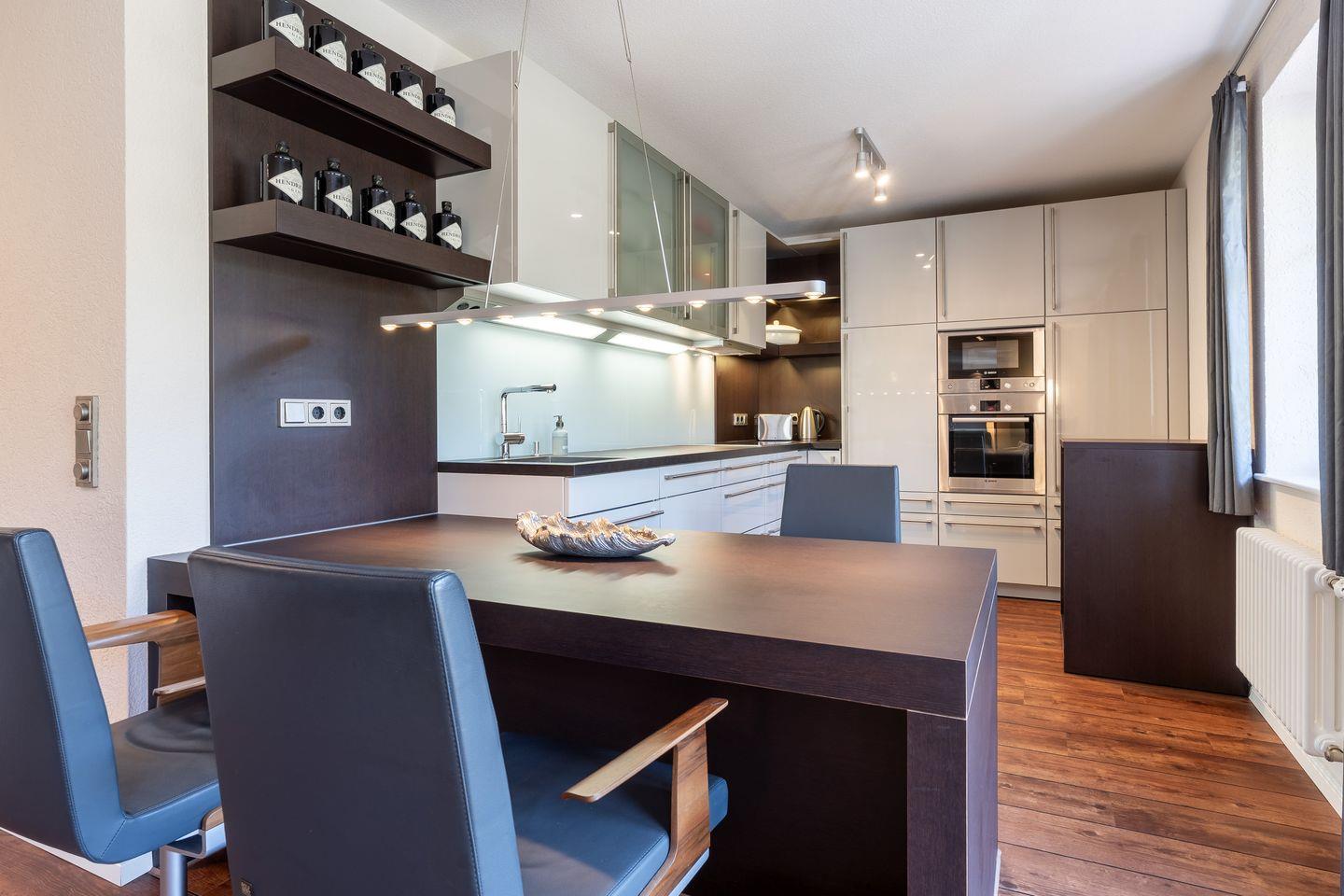 Das Herzstück der Ferienwohnung ist der offene Wohnbereich, der nahtlos in die voll ausgestattete Küche übergeht. Hier können Sie mit modernen Geräten wie einem Induktionsherd, einem Backofen und einer Spülmaschine Ihrer Kochleidenschaft nachgehen. Ein Kühlschrank mit Gefrierfach, eine Kaffeemaschine, einen Weinschrank und weitere Küchenutensilien lassen keine Wünsche offen. Egal, ob Sie ein einfaches Frühstück zubereiten oder ein festliches Dinner für Freunde und Familie kreieren möchten – alles ist möglich. Der angrenzende Essbereich bietet eine einladende Atmosphäre für gesellige Abende.
