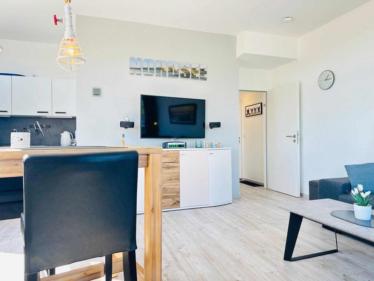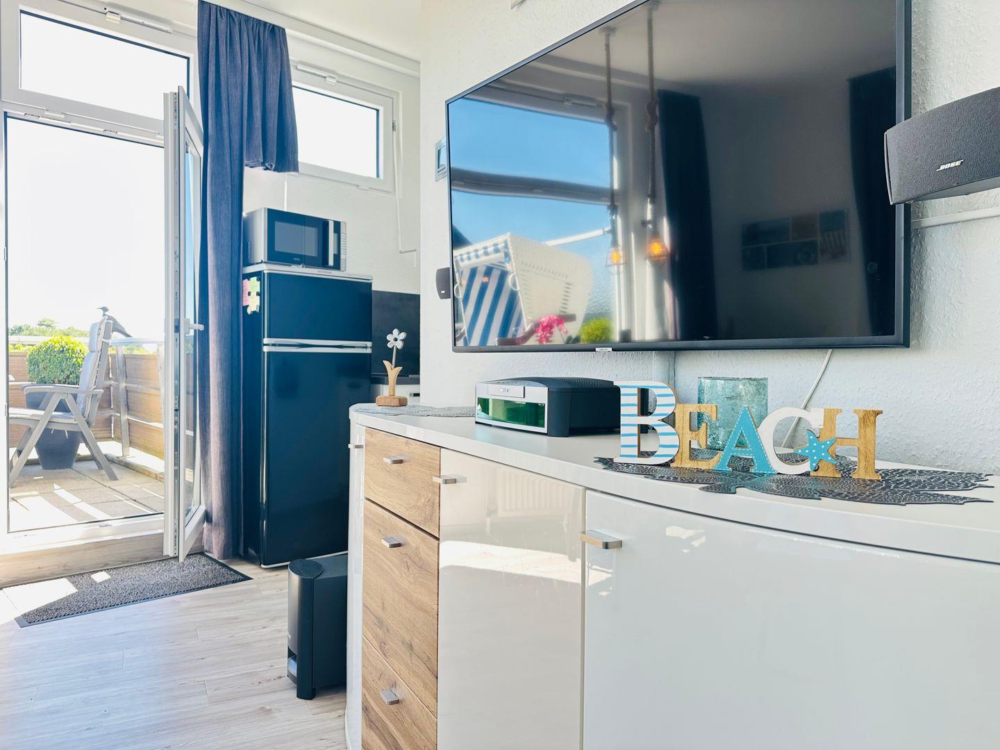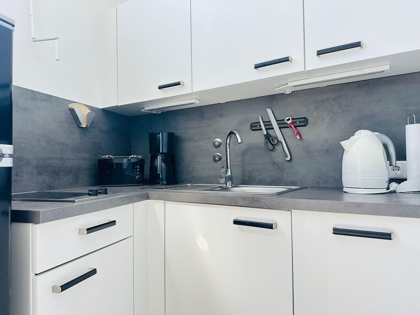 In der offenen Küche steht Ihnen eine Combi-Mikrowelle, ein 2-Platten-Cerankochfeld und ein Geschirrspüler zur Verfügung.