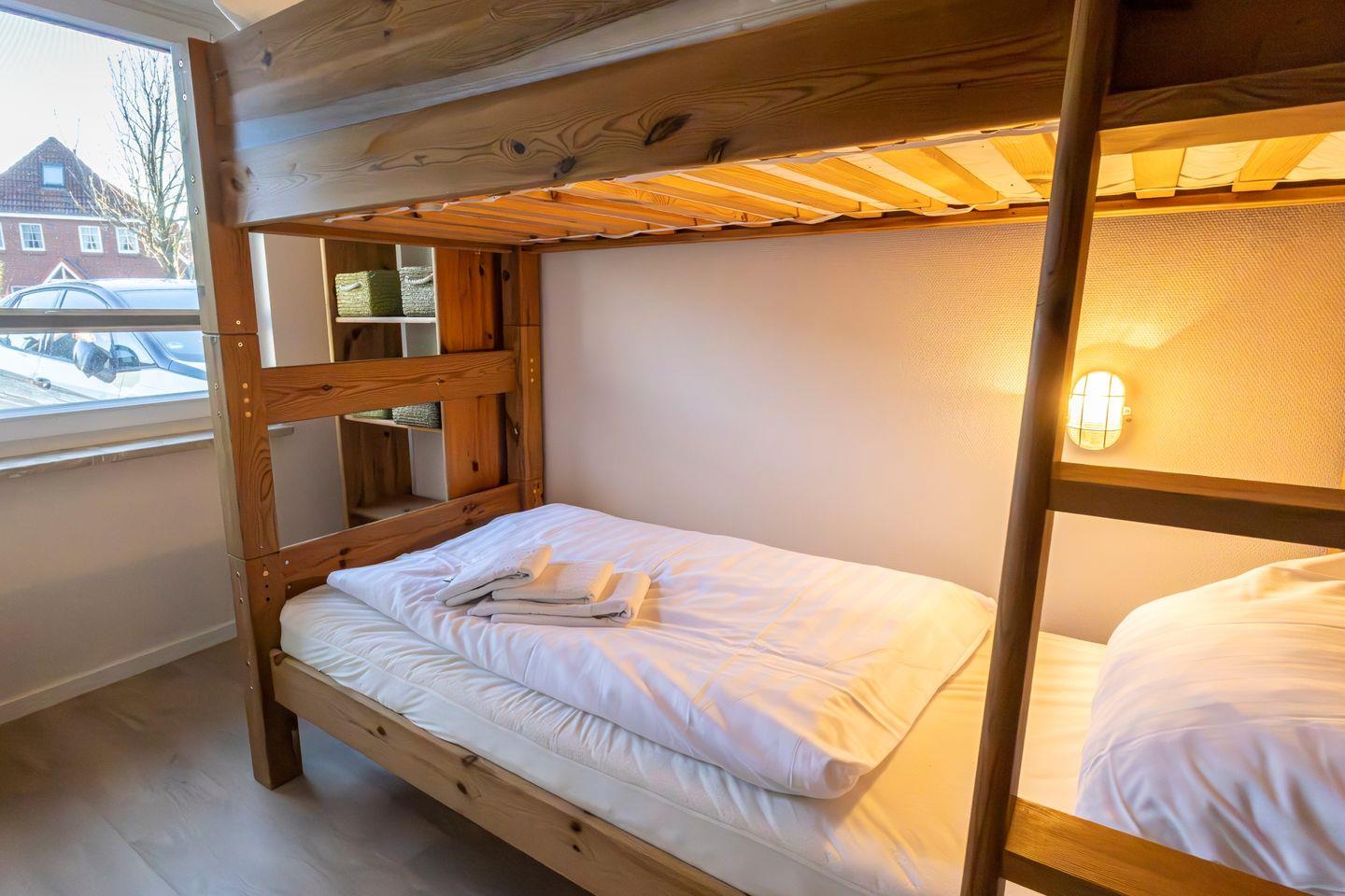 Das separate Schlafzimmer ist mit komfortablen Schlafmöglichkeiten ausgestattet und wird durch Sichtschutz an allen Fenstern abgerundet. Insgesamt finden vier Personen einen Schlafplatz, wobei zwei Schlafmöglichkeiten ausschließlich für Kinder vorgesehen sind. Ein Babybett und ein Kinderhochstuhl stehen für die jüngsten Gäste bereit, sodass auch Familien mit Kleinkindern bestens versorgt sind.
