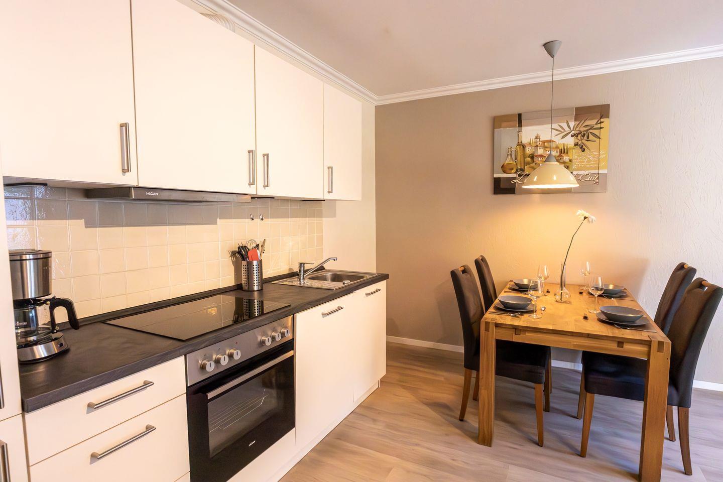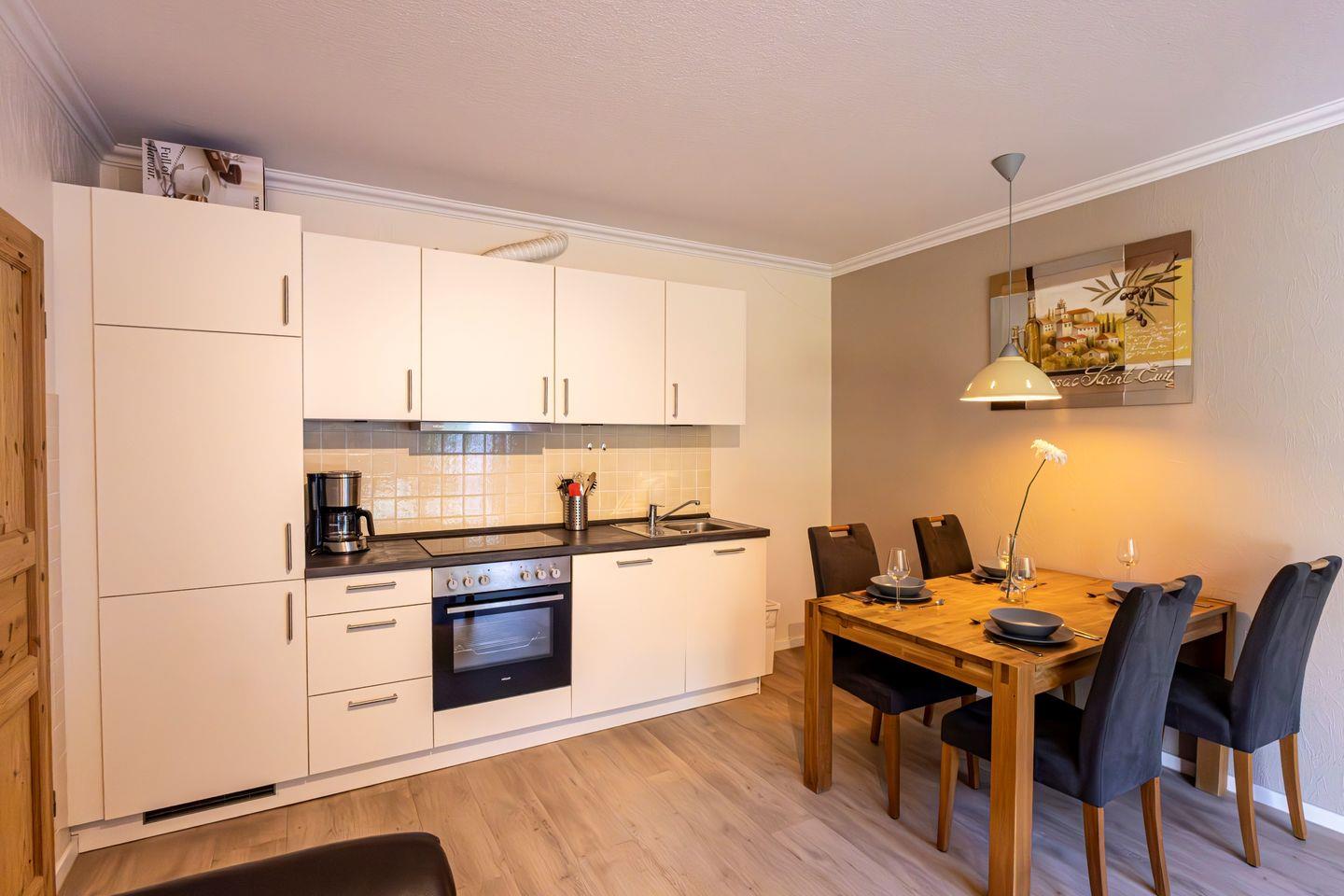 Herzstück der Unterkunft ist der offen gestaltete Wohnbereich, der ein gemütliches Wohnzimmer mit bequemer Sofaecke, TV und integriertem WLAN-Anschluss umfasst. Hier können Sie entspannte Stunden verbringen und den Alltag hinter sich lassen. Die offene Küche schließt direkt an das Wohnzimmer an und ist mit einem Ceranherd, Backofen, Kühlschrank, Toaster, Kaffeemaschine, Wasserkocher sowie allen weiteren notwendigen Küchenutensilien ausgestattet. Ein Esstisch bietet ausreichend Platz für gemeinsame Mahlzeiten. Für einen besonderen Komfort sorgt die Fußbodenheizung, die in allen Räumen für eine angenehme Wärme sorgt.