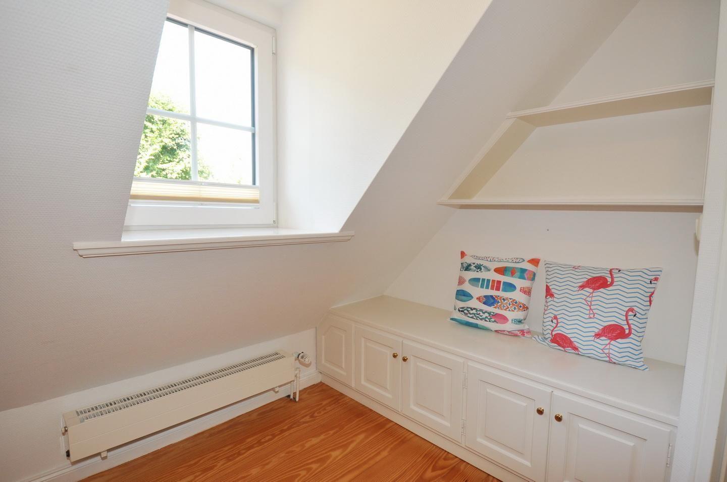 Obergeschoss: ein Schlafzimmer mit Doppelbett (180 x 200 cm - durchgehender Topper), ein Schlafzimmer mit Einzelbett (110 x 190 cm), ein Lesezimmer, ein Duschbad / WC