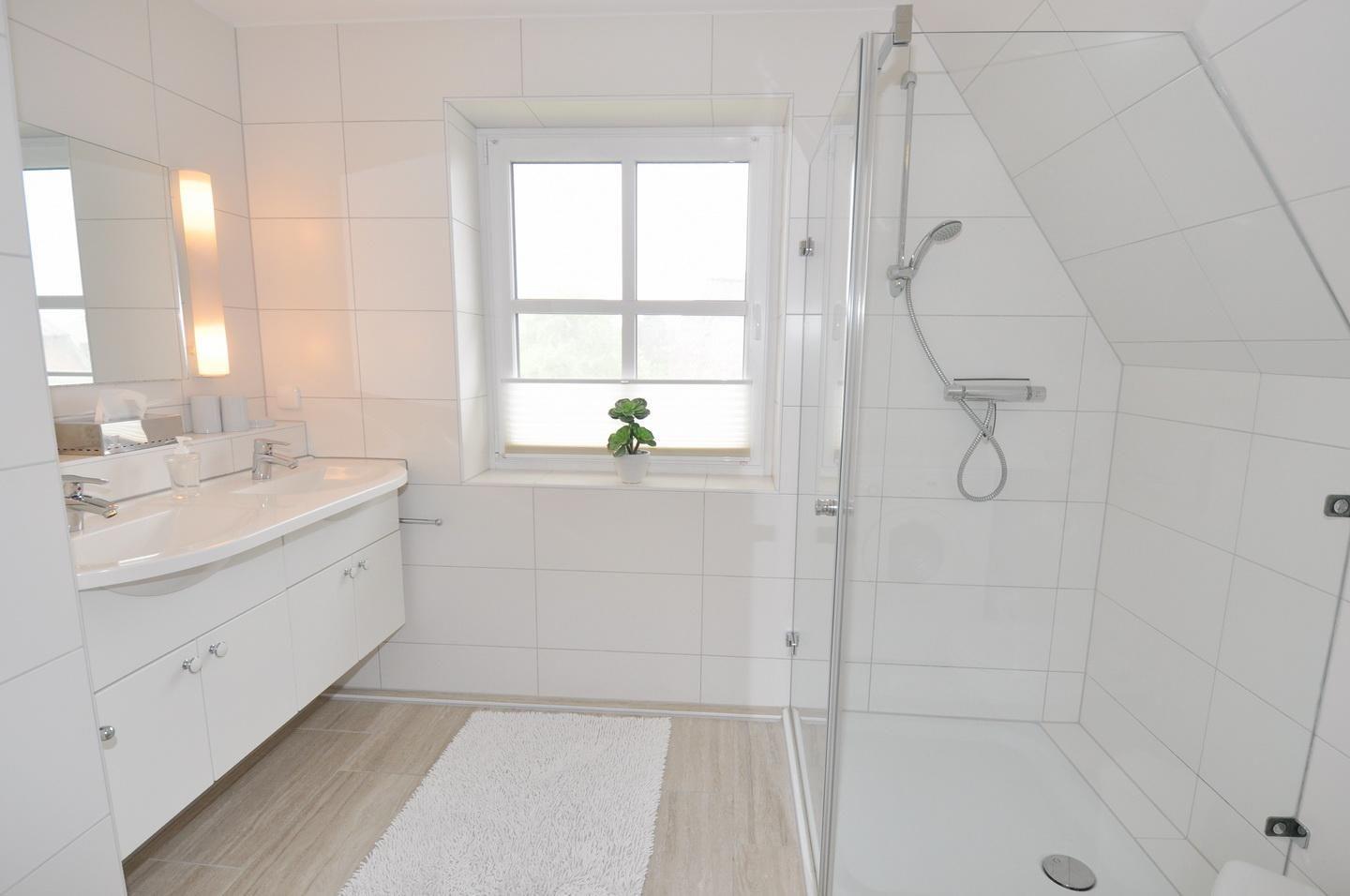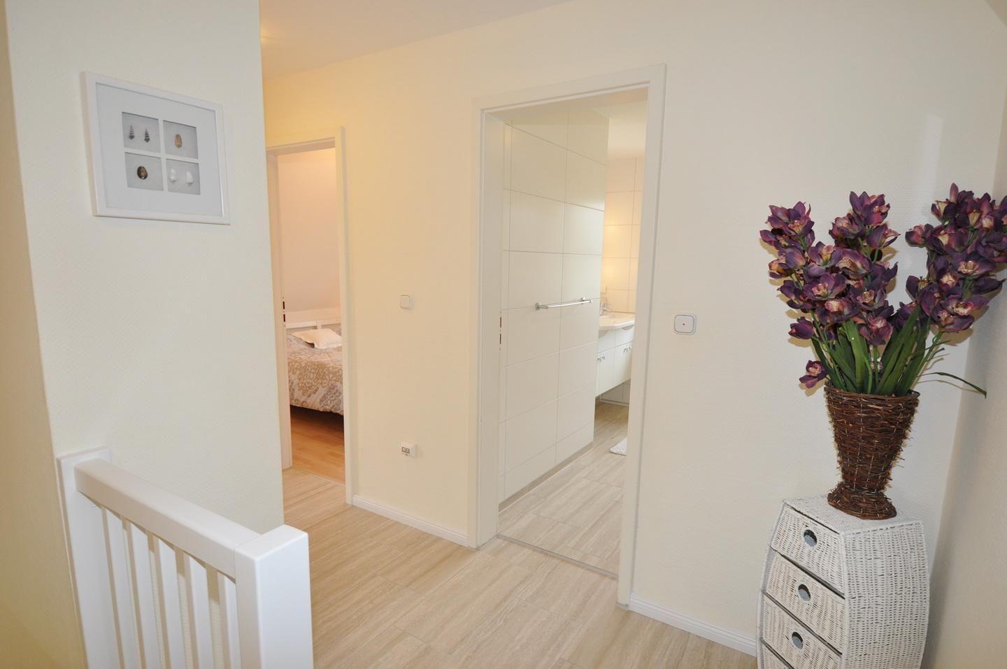 Obergeschoss: 3 Schlafzimmer mit Doppelbett (1x 180 x 200 cm - Einzelmatratzen; 1x 160 x 200 cm - durchgehende Matratze; 1x 140 x 200 cm - durchgehende Matratze), ein Duschbad / WC